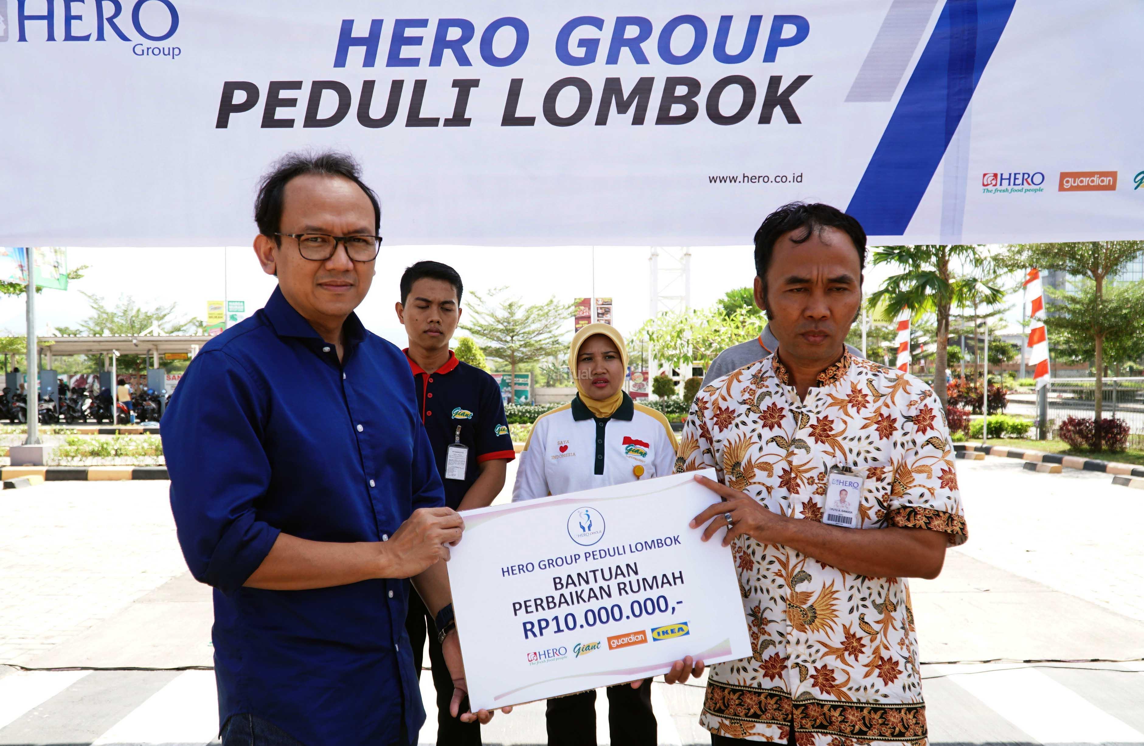 Direktur PT Hero Supermarket Tbk Hadrianus Wahyu Trikusomo (kiri) memberikan bantuan perbaikan rumah kepada warga saat acara Hero Peduli kepada warga terdampak gempa bumi di Mataram, NTB, Rabu (15/8). PT Hero Supermarket Tbk (HERO Group) melalui empat unit bisnisnya yakni Hero Supermarket, Guardian, Giant, dan IKEA memberikan bantuan dan dukungan kepada lingkungan di sekitar toko yang mencakup Kelurahan Monjok, Kelurahan Rambiga dan Kelurahan Karang Baru) maupun daerah yang terkena dampak bencana gempa bumi di Lombok Utara, di mana proses penyaluran bantuan bekerjasama dengan PKPU Human Initiative. AKTUAL/Eko S Hilman