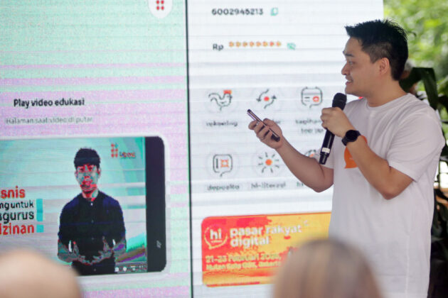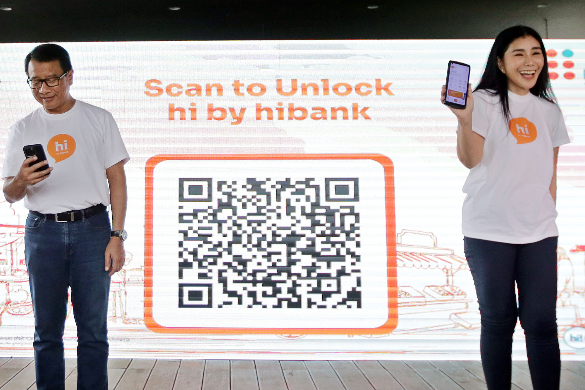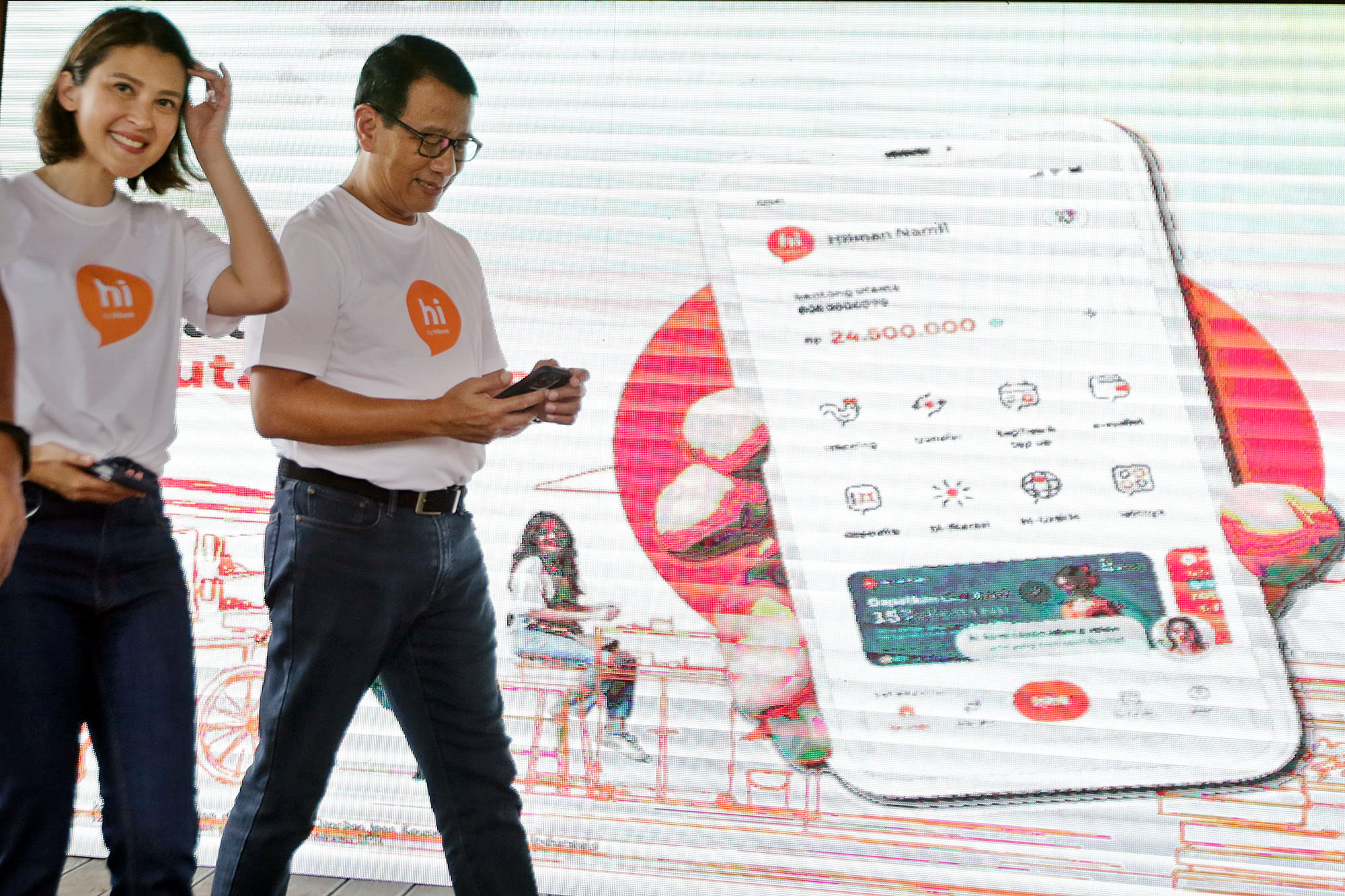 SEVP Retail Digital Solution BNI, Rian Eriana Kaslan (kiri), Wakil Direktur Utama BNI Putrama Wahju Setyawan (kanan) melihat aplikasi mobile banking terbaru, hi by hibank di Jakarta, Jumat (21/2/2025).