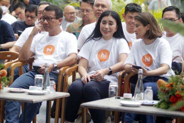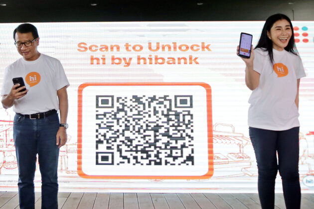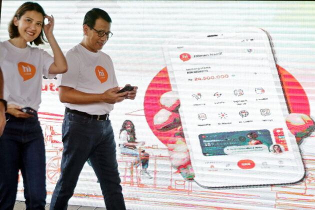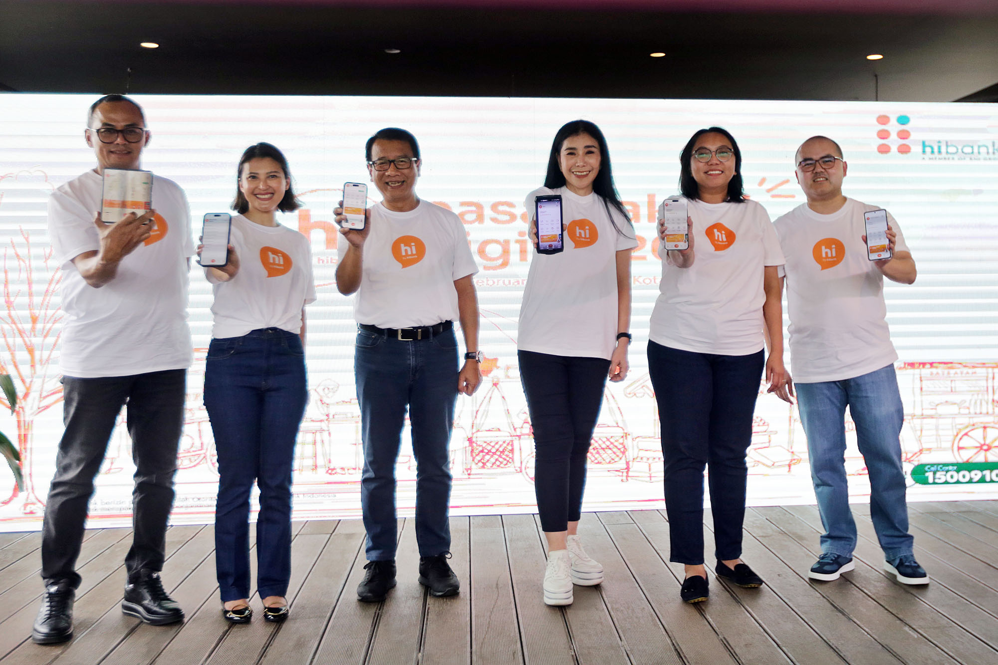 Kiri ke kanan, Direktur Human Capital and Compliance BNI Mucharom, SEVP Retail Digital Solution BNI Rian Eriana Kaslan, Wakil Direktur Utama BNI Putrama Wahju Setyawan, Direktur Utama hibank Jenny Wirianto, Direktur Finance BNI Novita Widya Anggraini, Direktur Digital and Integrated Transaction Banking BNI Hussein Paolo Kartadjoemena menunjukan aplikasi mobile banking terbaru, hi by hibank di Jakarta, Jumat (21/2/2025).