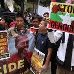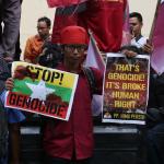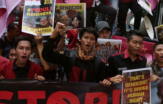 Sejumlah aktivis Himpunan Mahasiswa (HIMA) Persis melakukan aksi di depan Kedutaan Besar Myanmar di Jakarta, Kamis (24/11/2016). Dalam aksinya HIMA Persis mendesak dunia Internasional untuk memberikan sanksi politik dan ekonomi kepada pemerintaha Myamar dan mendesak pemerintah Indonesia untuk memustuskan hubungan diplomatik dan mengusir kedutaan Besar Myammar. AKTUAL/Munzir