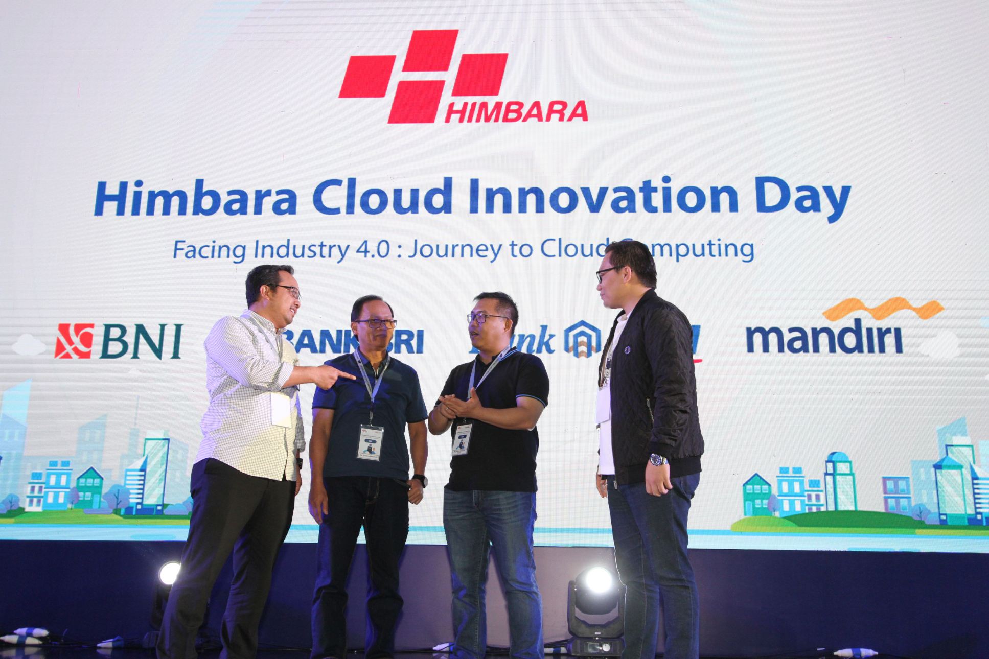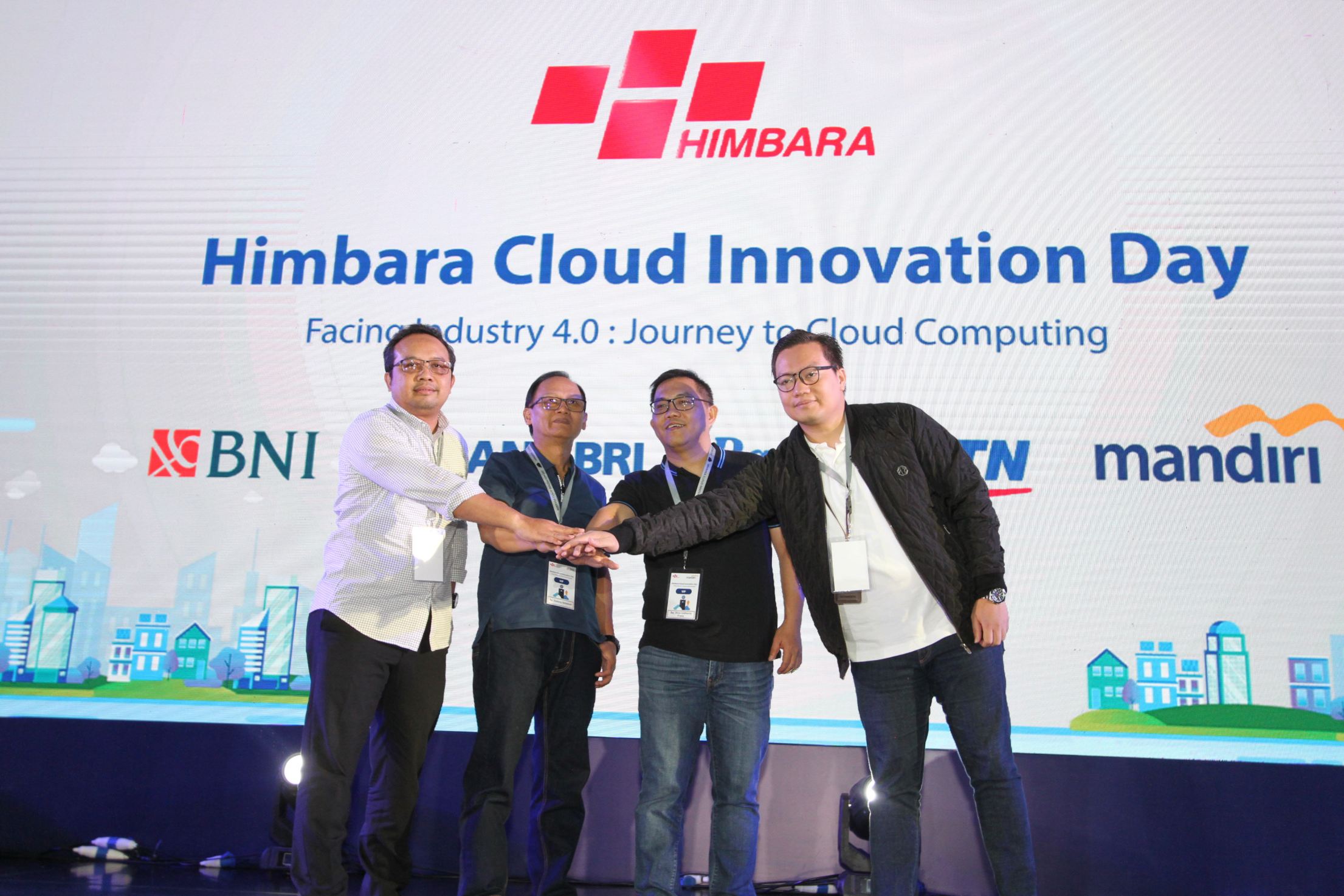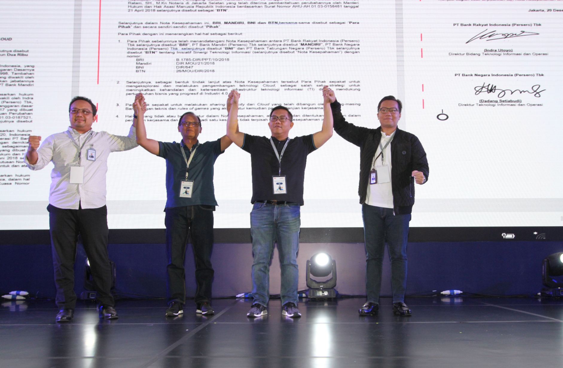 Dari kiri, Direktur Teknologi Informasi dan Operasional BTN Andi Nirwoto, Direktur Teknologi Informasi dan Operasi BNI Dadang Setiabudi, Direktur Teknologi Informasi dan Operasi Bank Mandiri Rico Usthavia Frans dan Head of Digital Center of Exellence BRI Kaspar Situmorang bertumpu tangan usai menandatangani kerja sama pengembangan teknologi cloud di Jakarta, Kamis (20/12/2018). Himpunan Bank milik negara (Himbara) bersinergi mengembangkan teknologi cloud untuk mengembangkan bisnis dan memenuhi kebutuhan masyarakat terhadap layanan keuangan digital. AKTUAL/Eko S Hilman