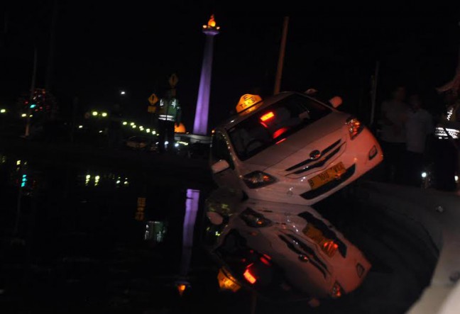 Jakarta, Aktual.co — Sebuah taksi Ekspress bernomor polisi B 1011 VTA, masuk ke kolam Bundaran Hotel Indonesia, Senin (5/1) malam.