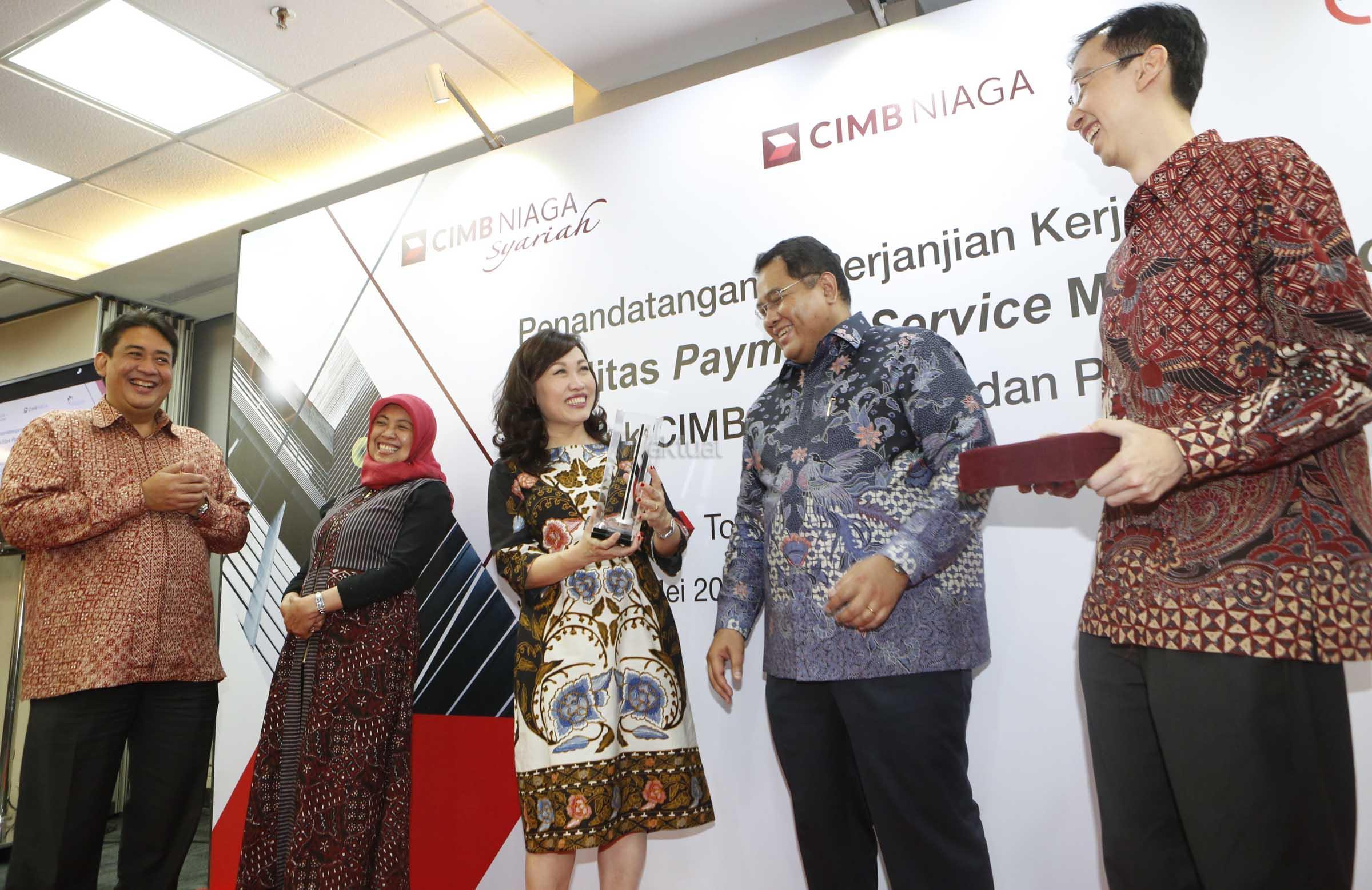 Dari kiri ke kanan, Head Of Digital Banking Branchless and Partnership PT Bank CIMB Niaga Tbk Bambang Karsono Adi, Marketing Director Holcim Dhamayanti Suhita, Director Consumer Banking CIMB Niaga Lani Darmawan, Sales Director PT Holcim Indonesia Tbk Dion Sumedi serta Chief Of Transaction Banking CIMB Niaga Hendra Lembong, usai melakukan penandatangan perjanjian kerjasama di Jakarta, Rabu, (10/5). Holcim Indonesia menggandeng CIMB Niaga untuk memfasilitasi pembayaran transaksi pembelian produk dan solusi melalui aplikasi penjualan online. Melalui aplikasi ini, pelanggan dapat menemukan berbagai produk dan solusi Holcim Indonesia tanpa perlu datang ke toko bangunan dan dapat melakukan proses pembayaran dengan mudah melalui akses mobile commerce. Dalam hal pembayaran, masyarakat akan terhubung dengan beragam layanan yang dimiliki CIMB Niaga, seperti kartu debit, kartu kredit, CIMB Cliks serta Rekening Ponsel. AKTUAL/Eko S Hilman