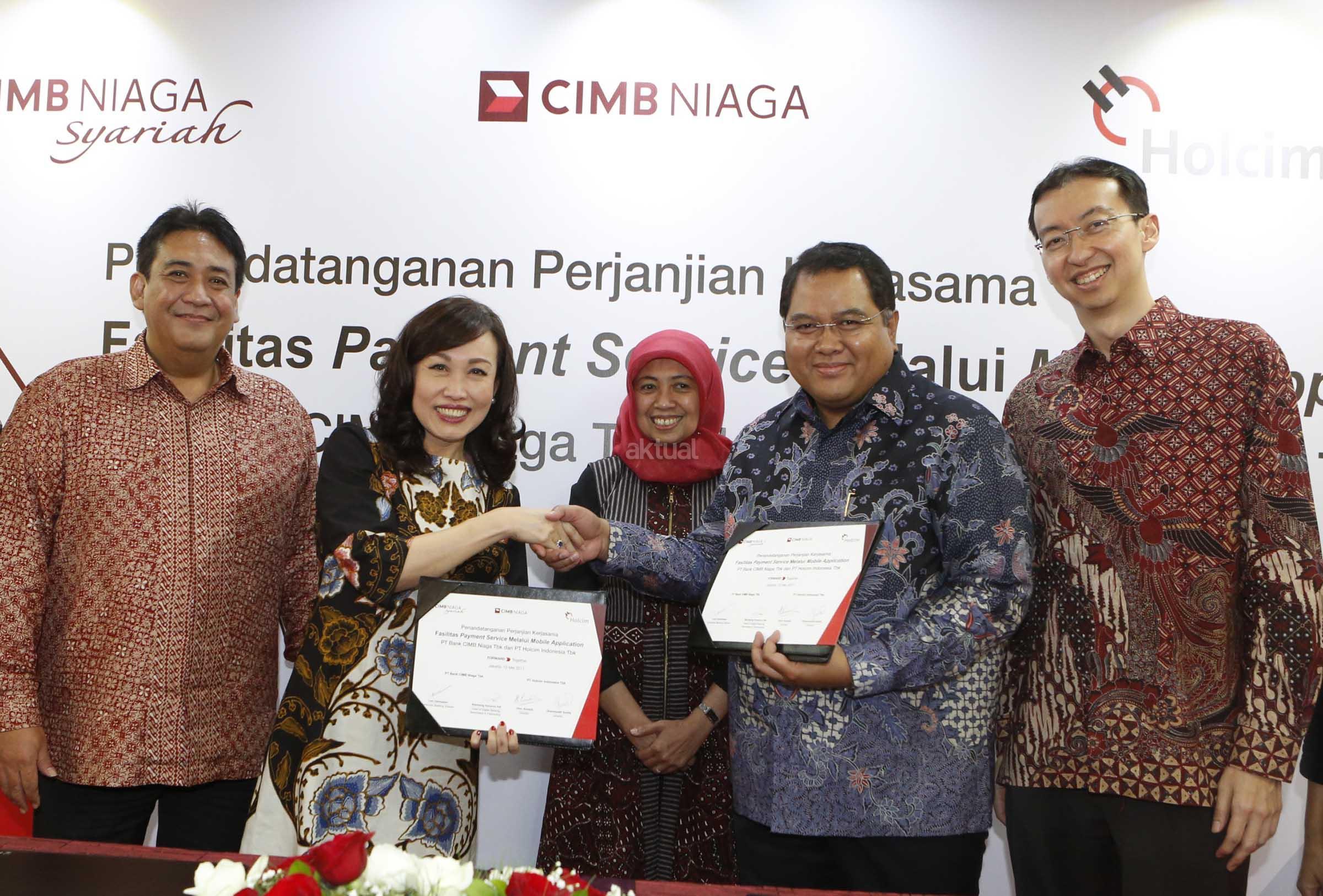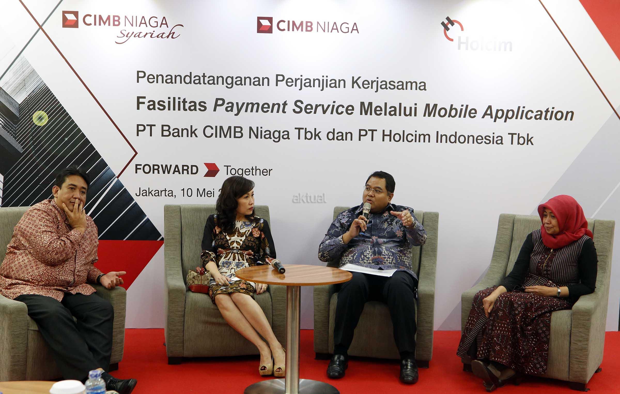 Holcim Indonesia menggandeng CIMB Niaga untuk memfasilitasi pembayaran transaksi pembelian produk dan solusi melalui aplikasi penjualan online. Melalui aplikasi ini, pelanggan dapat menemukan berbagai produk dan solusi Holcim Indonesia tanpa perlu datang ke toko bangunan dan dapat melakukan proses pembayaran dengan mudah melalui akses mobile commerce. Dalam hal pembayaran, masyarakat akan terhubung dengan beragam layanan yang dimiliki CIMB Niaga, seperti kartu debit, kartu kredit, CIMB Cliks serta Rekening Ponsel. AKTUAL/Eko S Hilman