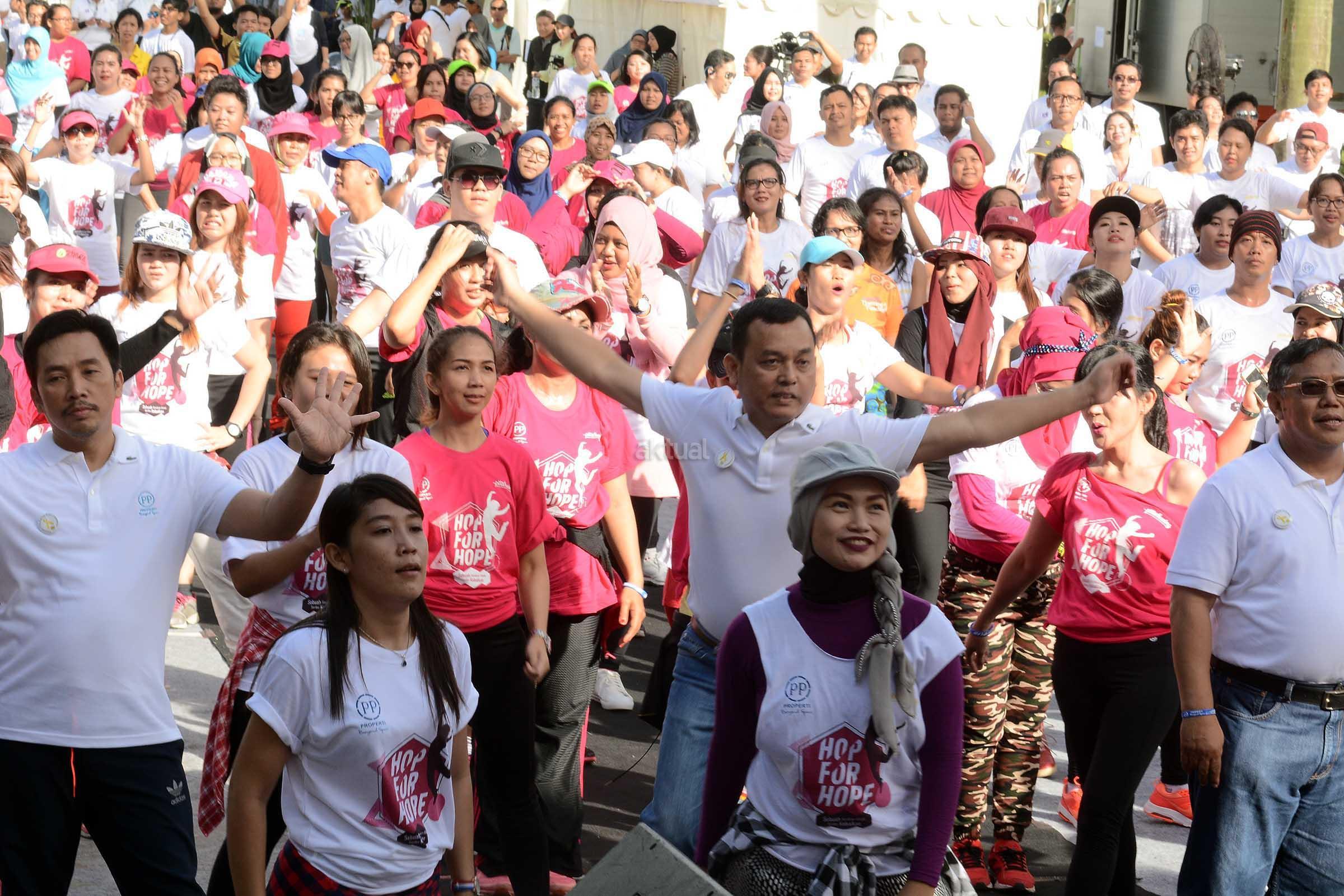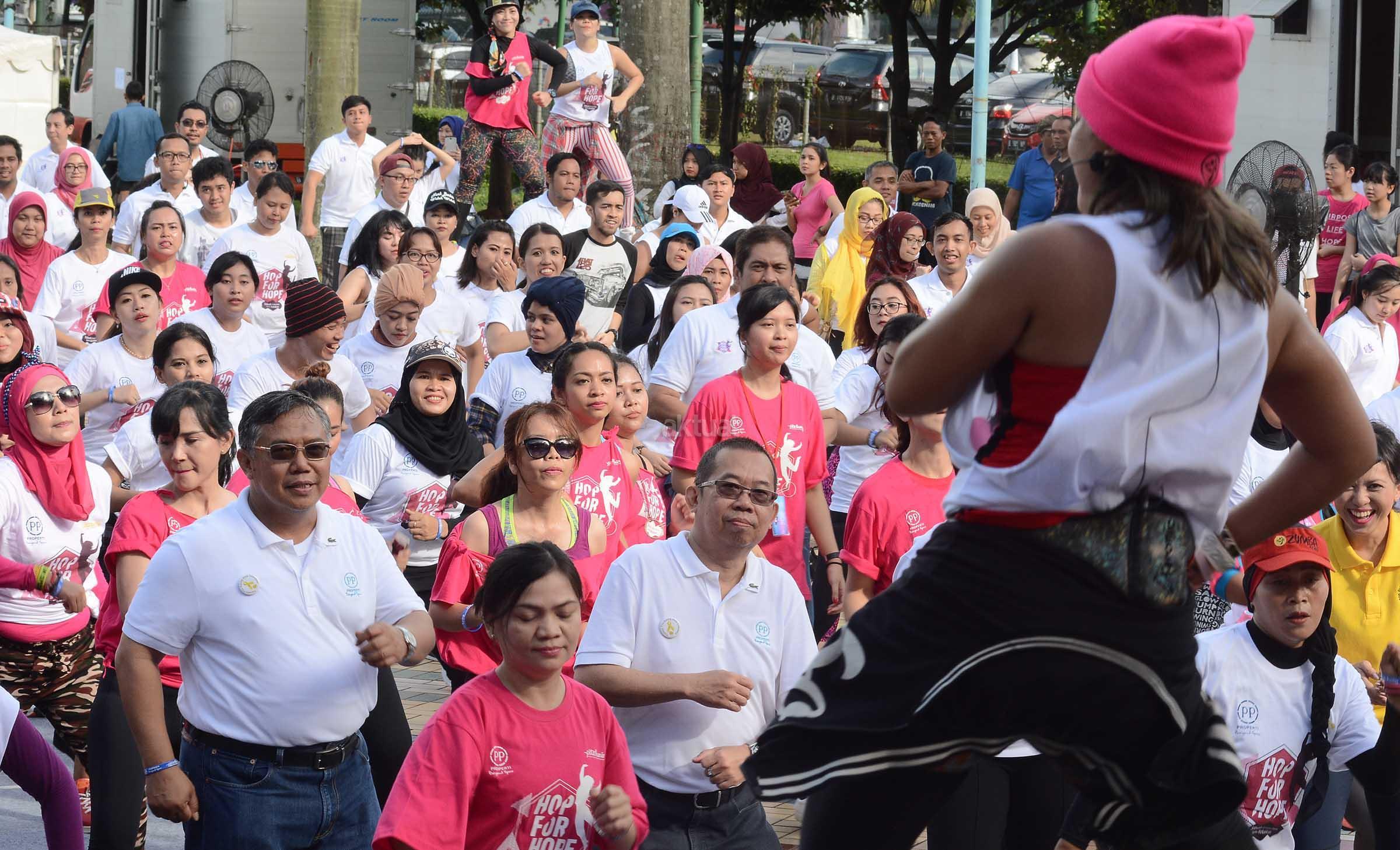 Direktur Utama PT PP Properti Tbk (PPRO), Taufik Hidayat (tengah baju putih) bersama Direktur Realty PPRO Galih Saksono, Direktur Keuangan & SDM Indaryanto melakukan senam bersama Zumba Lovers dan masyarakat di Parkir Selatan, Senayan, Jakarta, Minggu (18/12). PPRO mengandeng Yayasan Pita Kuning Anak Indonesia (Pita Kuning) bersama Zumba Lovers untuk mengajak masyarakat, meningkatkan kepedulian terhadap anak anak penderita kanker untuk hidup sehat melalui olahraga yang bertajuk "HopforHope" sebuah gerakan untuk seribu kebaikan. AKTUAL/Eko S Hilman