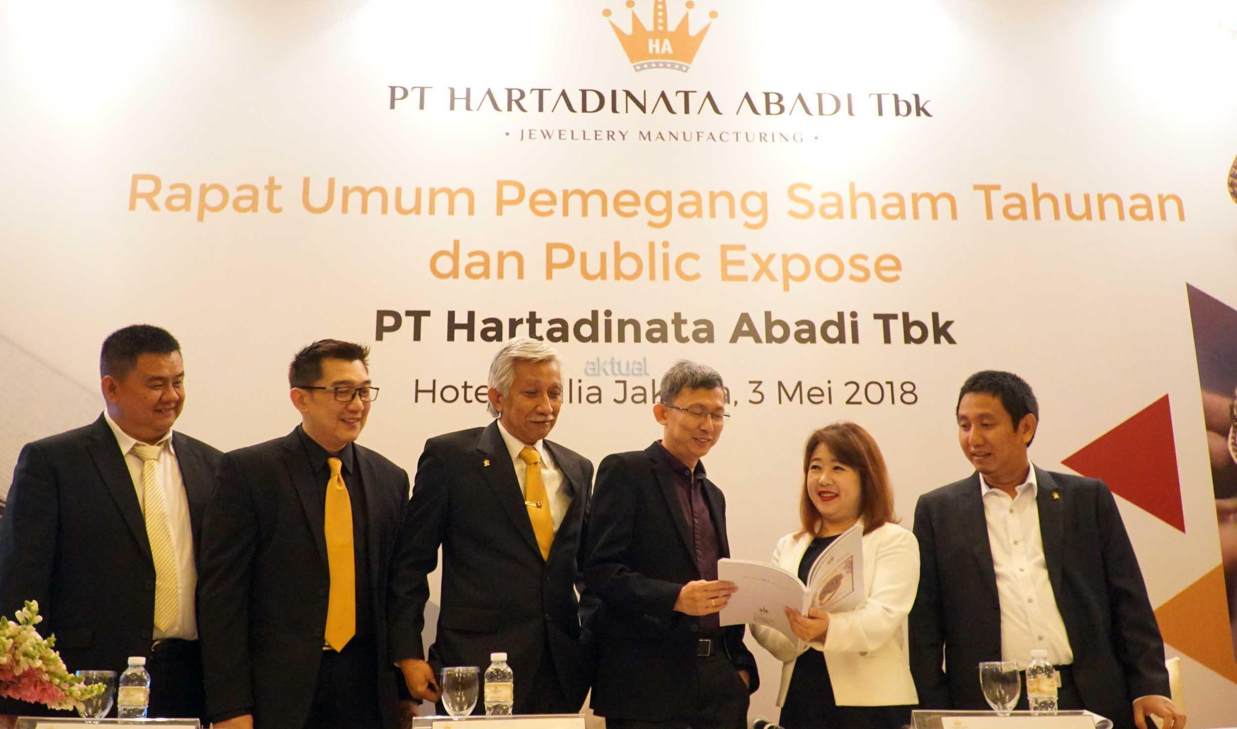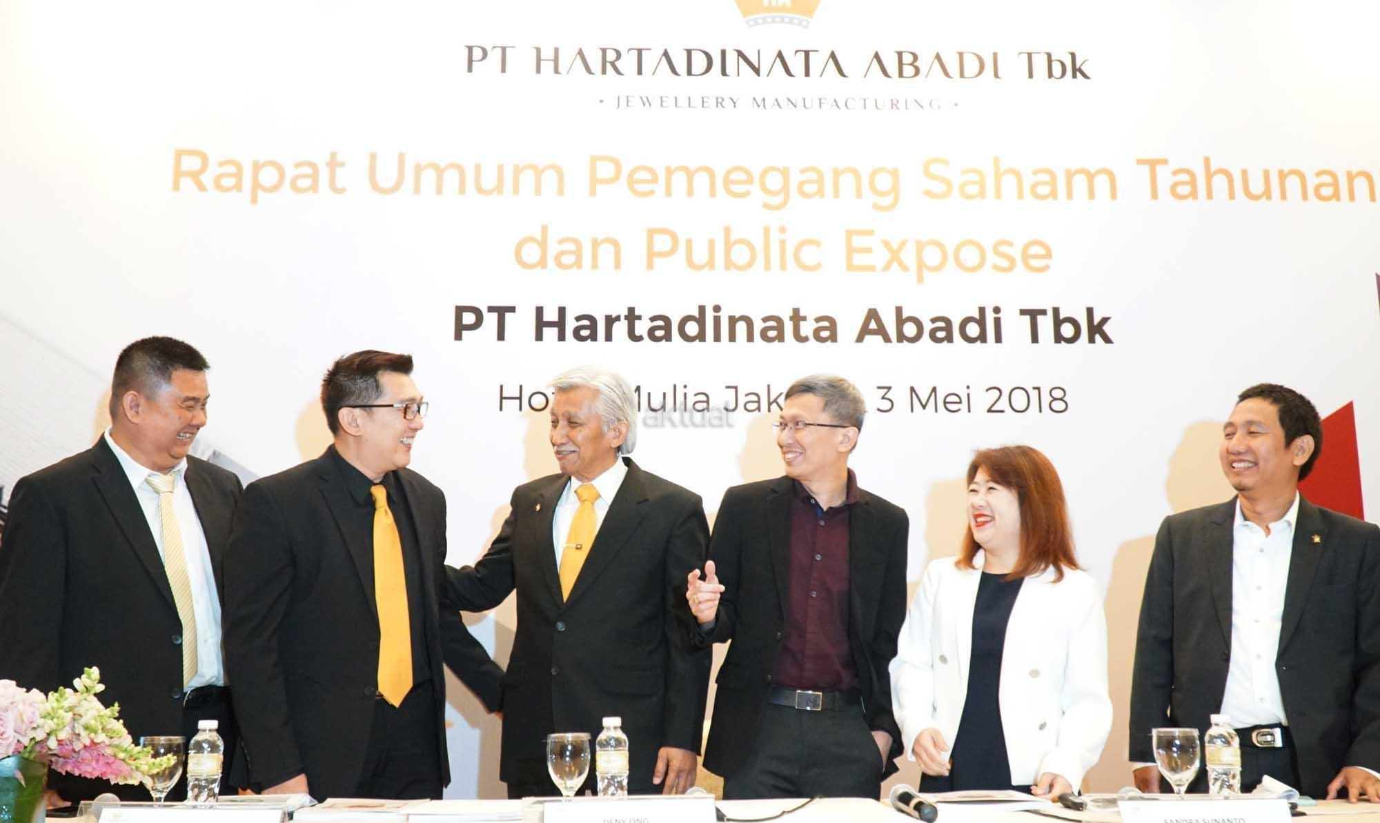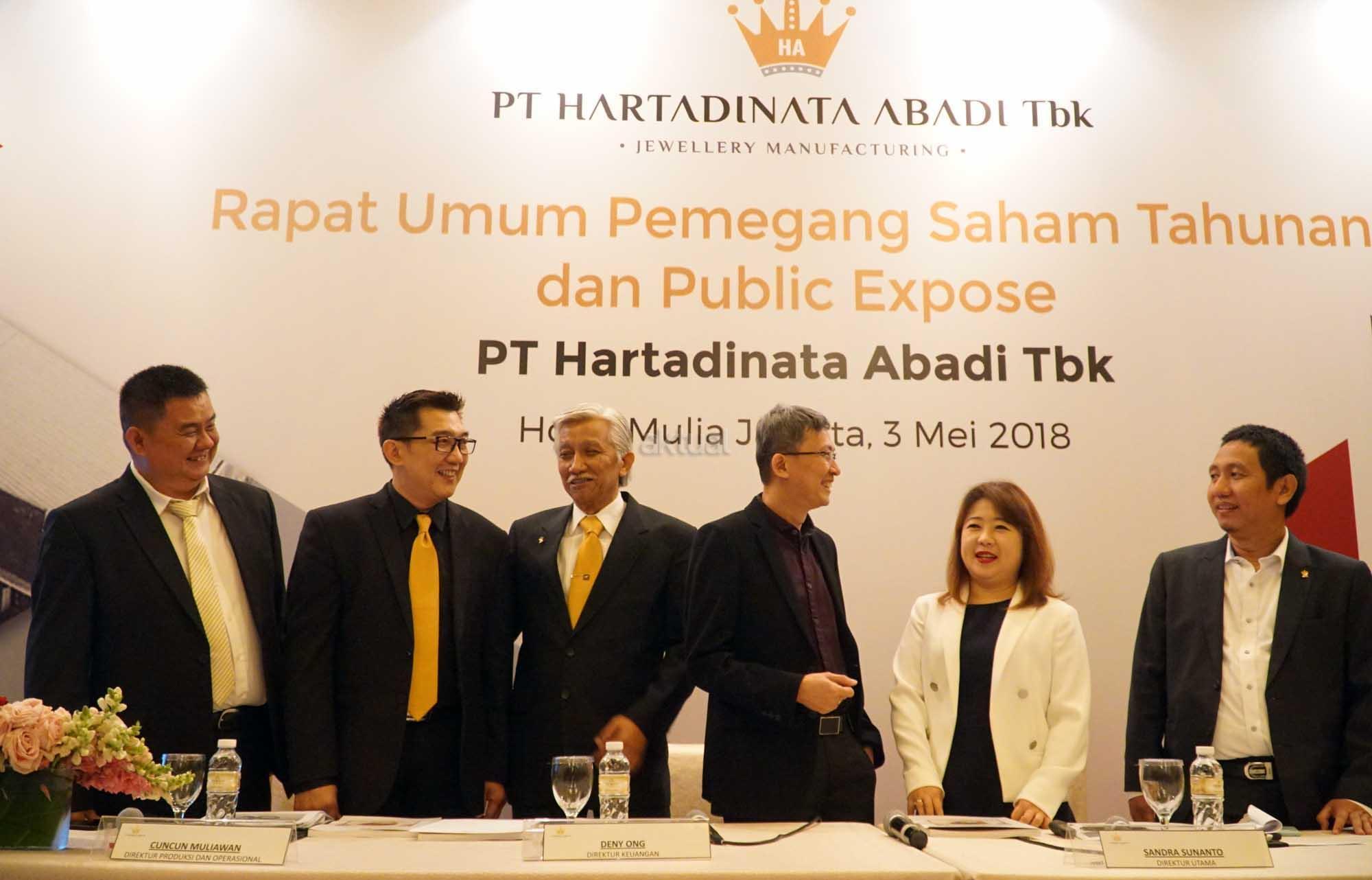 Dari kiri ke kanan, Direktur Produksi & Operasional PT Hartadinata Abadi Tbk (HRTA) Cuncun Muliawan, Direktur Keuangan HRTA Ong Deny, Komisaris Independen HRTA Suprihadi Usman, Komisaris Utama HRTA Ferriyady, Direktur Utama HRTA Sandra Sunanto, Corporate Secretary M. Ath Thoriq saat hadir dalam paparan publik usai RUPS Tahunan di Jakarta, Kamis (3/5).Dalam rapat tersebut, pemegang saham emiten dengan kode perdagangan HRTA tersebut telah menyetujui beberapa rencana, salah satunya terkait penggunaan laba bersih tahun lalu.Rapat juga telah memutuskan bahwa penggunaan laba bersih perseroan sebagian diperuntukkan untuk dividen tunai kepada para pemegang saham perseroan sebesar yaitu sebesar Rp27,6 miliar. AKTUAL/Eko S Hilman
