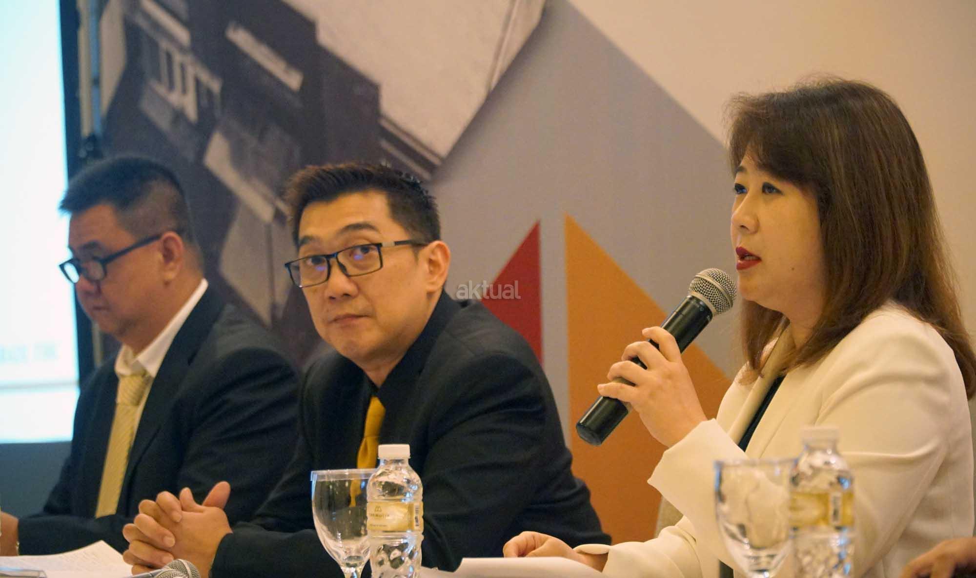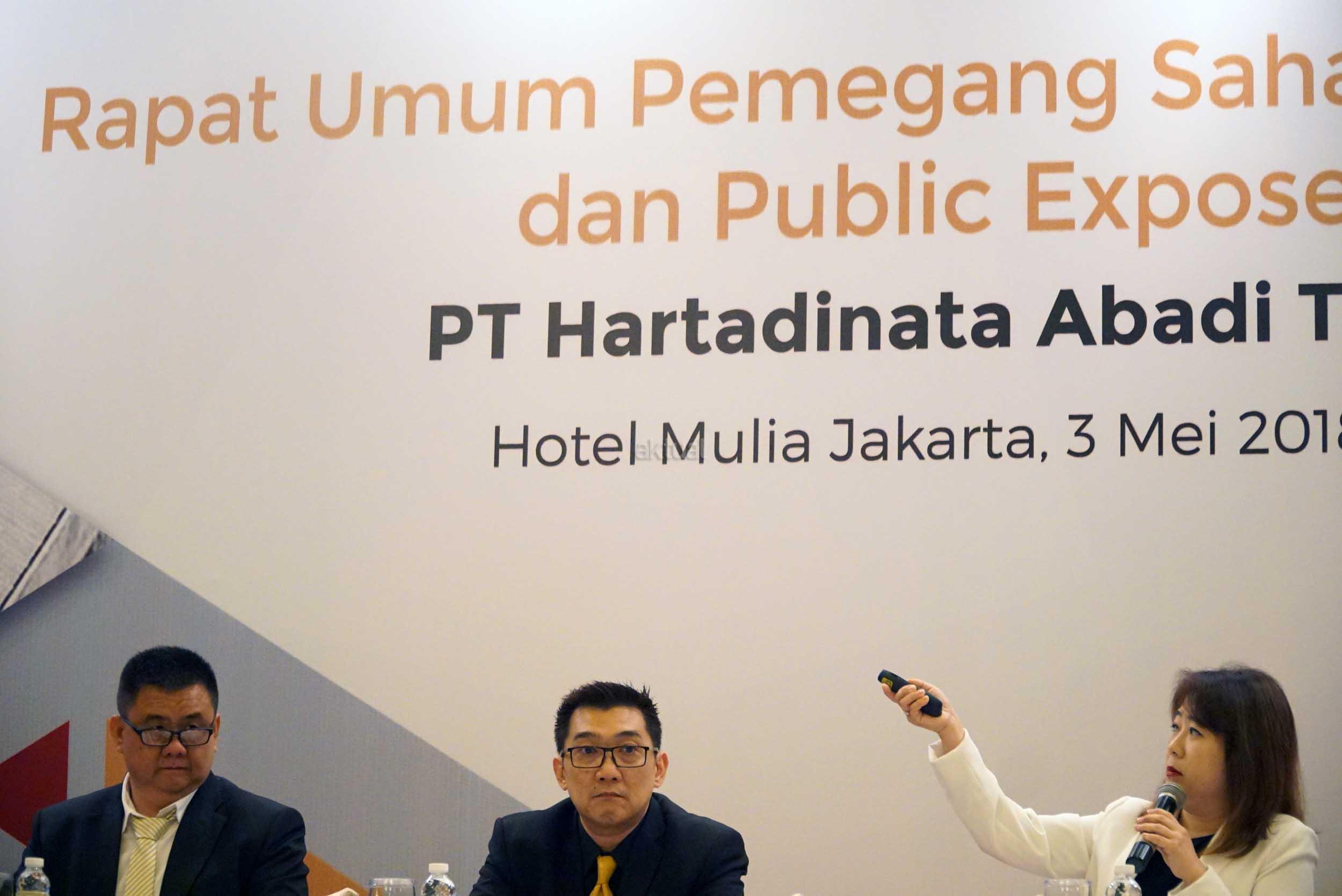 Dari kiri ke kanan, Direktur Produksi & Operasional PT Hartadinata Abadi Tbk (HRTA) Cuncun Muliawan, Direktur Keuangan HRTA Ong Deny, Direktur Utama HRTA Sandra Sunanto, saat hadir dalam paparan publik usai RUPS Tahunan di Jakarta, Kamis (3/5). Dalam rapat tersebut, pemegang saham emiten dengan kode perdagangan HRTA tersebut telah menyetujui beberapa rencana, salah satunya terkait penggunaan laba bersih tahun lalu. Rapat juga telah memutuskan bahwa penggunaan laba bersih perseroan sebagian diperuntukkan untuk dividen tunai kepada para pemegang saham perseroan sebesar yaitu sebesar Rp27,6 miliar. AKTUAL/Eko S Hilman