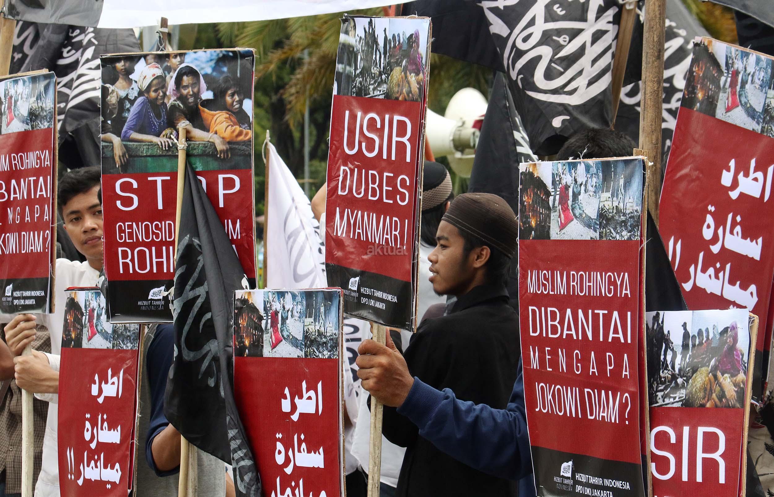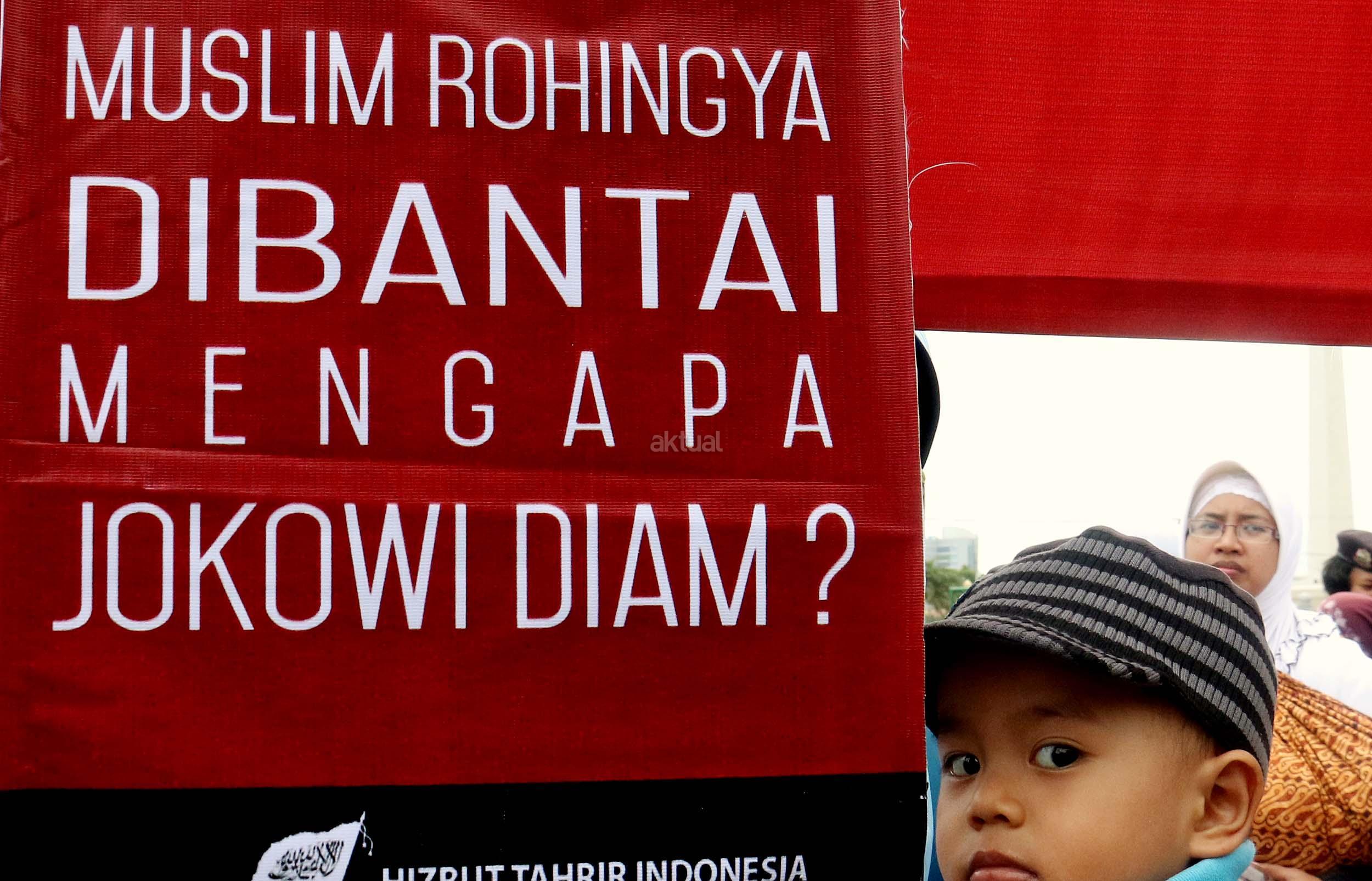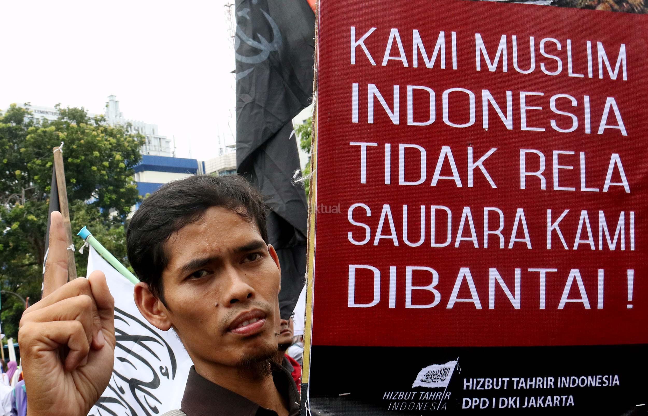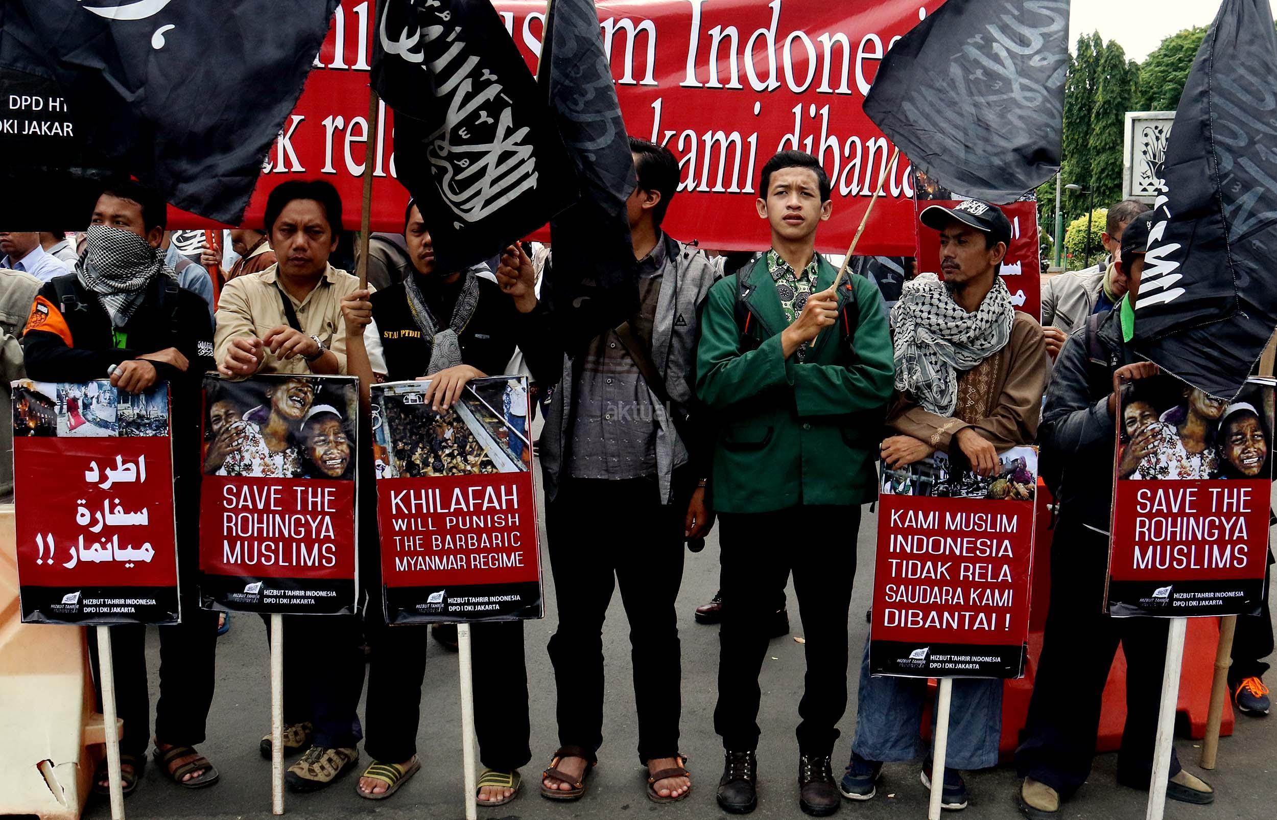 Ratusan massa Hizbut Tahrir Indonesia melakukan aksi tolak pembantaian muslim Rohingya di depan Istana Merdeka, Jakarta, Kamis (24/11/2016). Dalam aksinya Hizbut Tahrir Indonesia mendesak Jokowi untuk segera mengusir Duta Besar Myanmar dari Indonesia. AKTUAL/Munzir