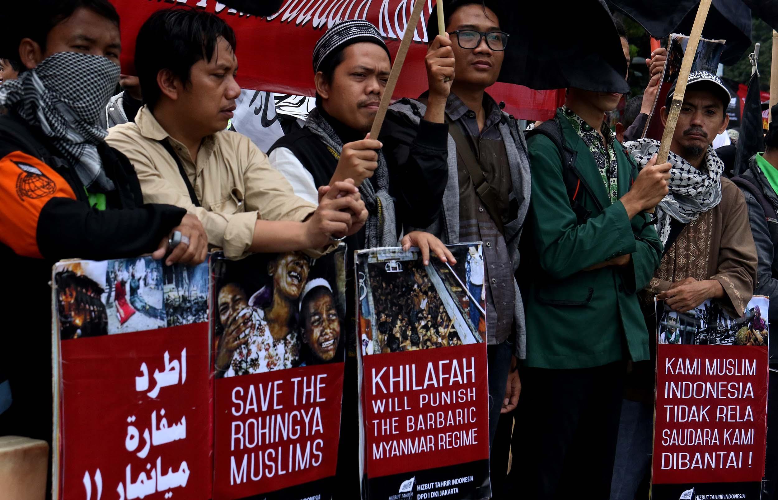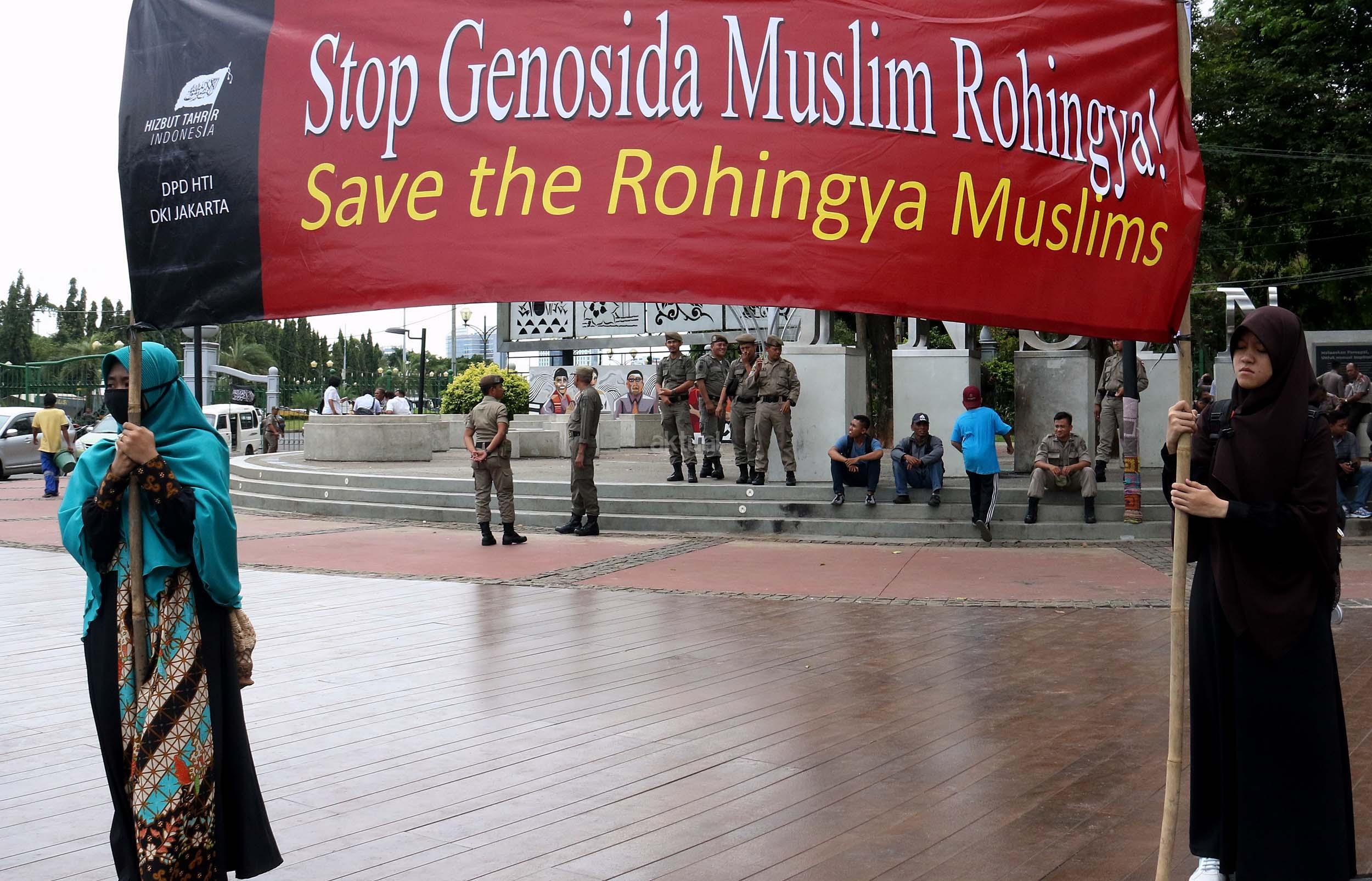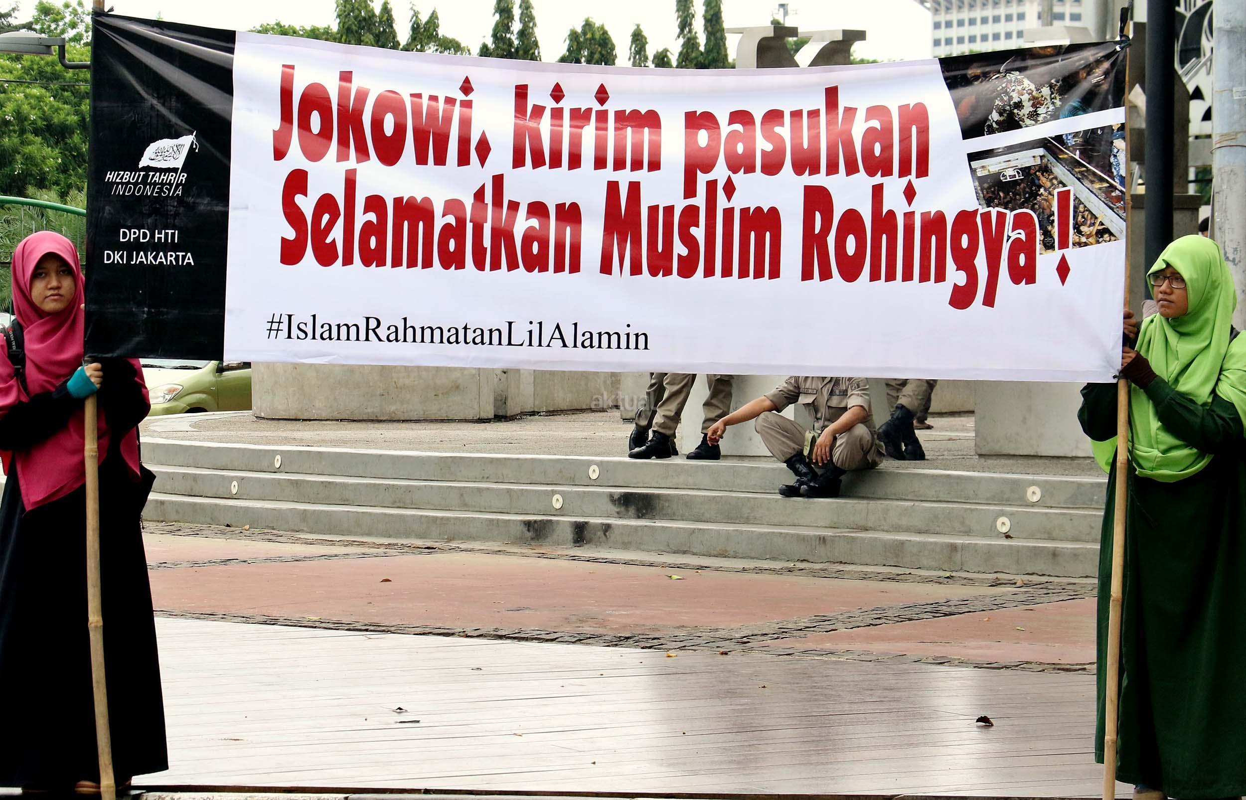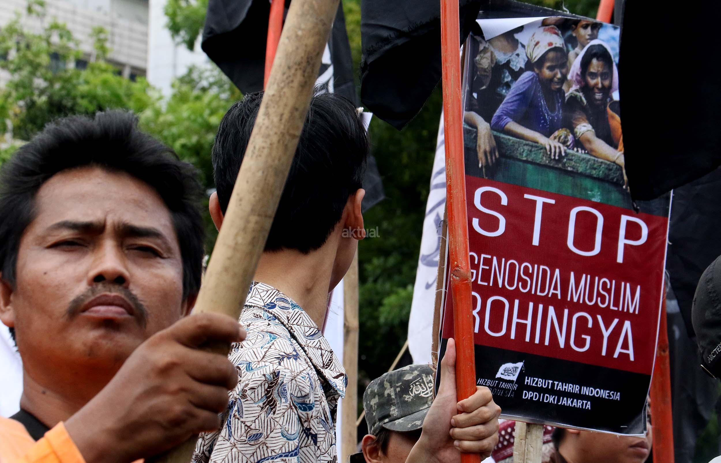 Ratusan massa Hizbut Tahrir Indonesia melakukan aksi tolak pembantaian muslim Rohingya di depan Istana Merdeka, Jakarta, Kamis (24/11/2016). Dalam aksinya Hizbut Tahrir Indonesia mendesak Jokowi untuk segera mengusir Duta Besar Myanmar dari Indonesia. AKTUAL/Munzir