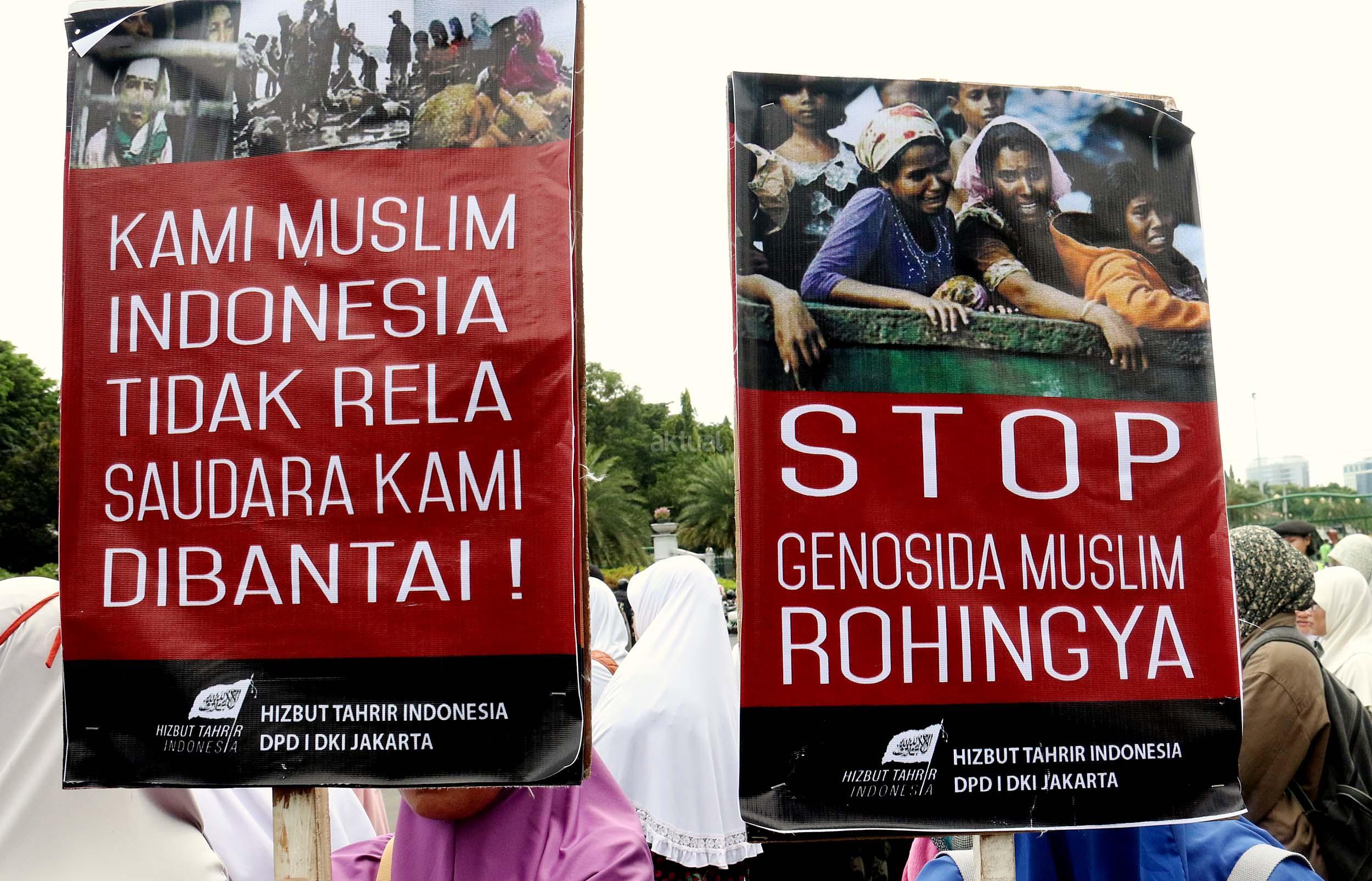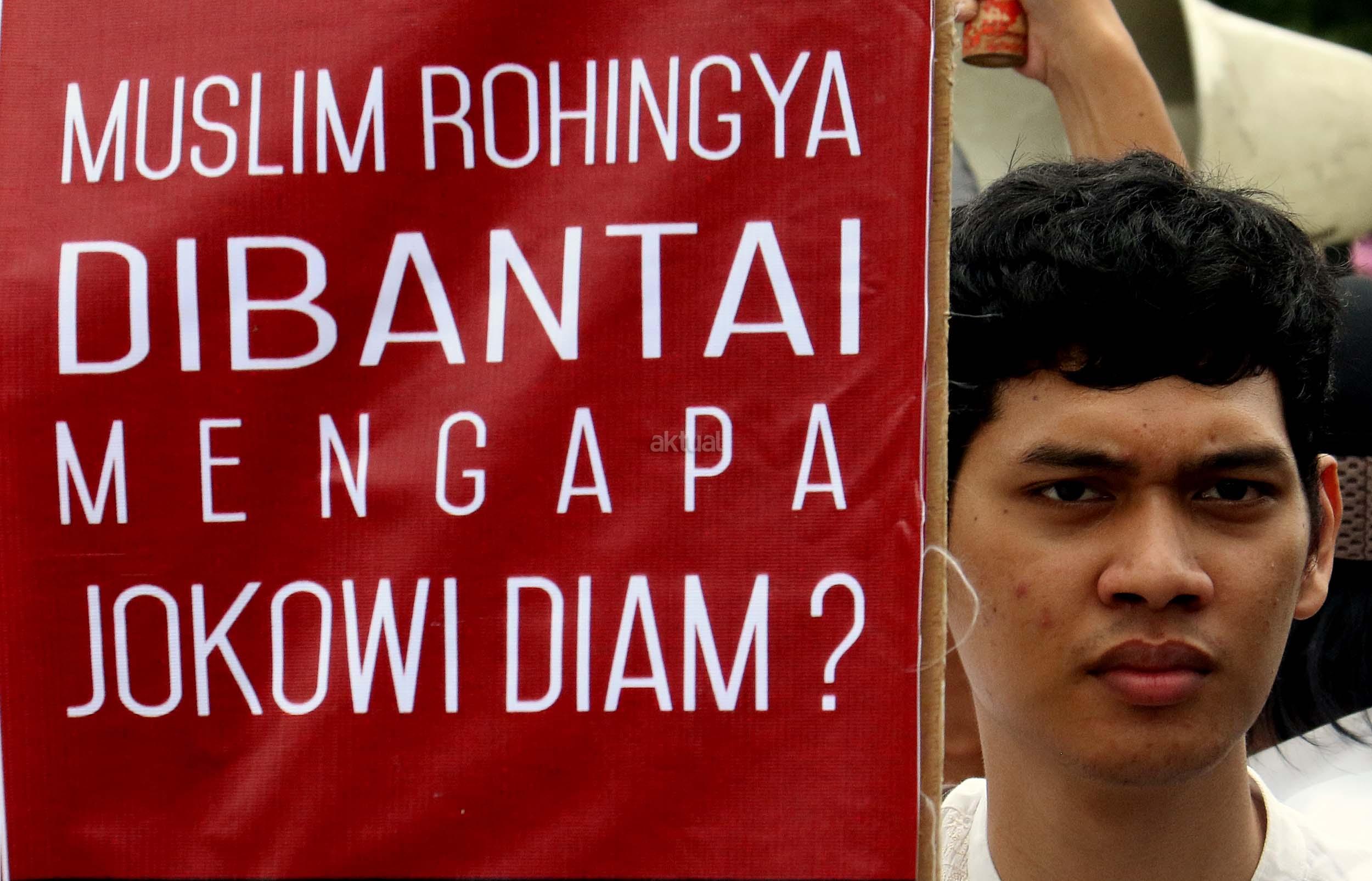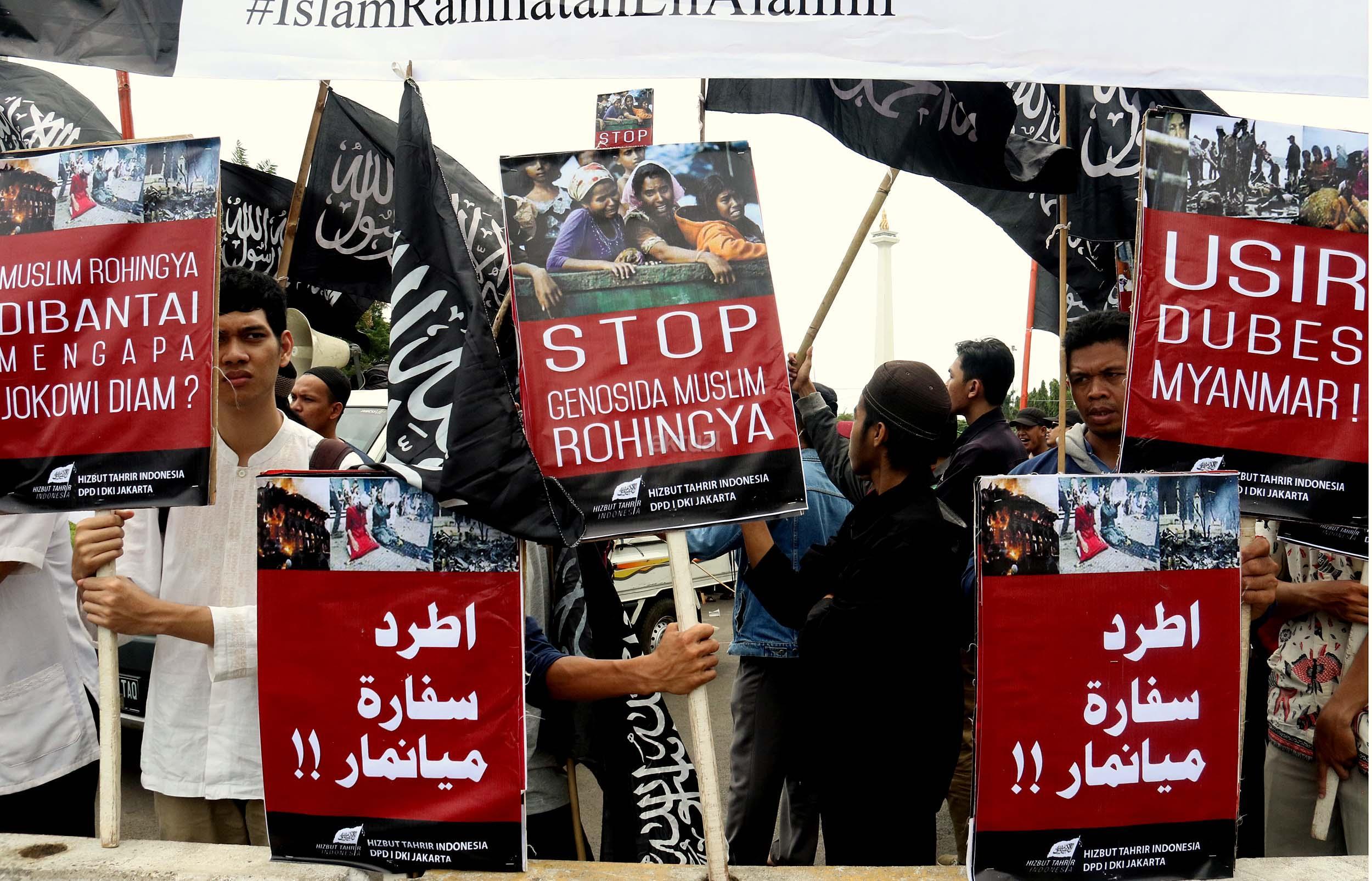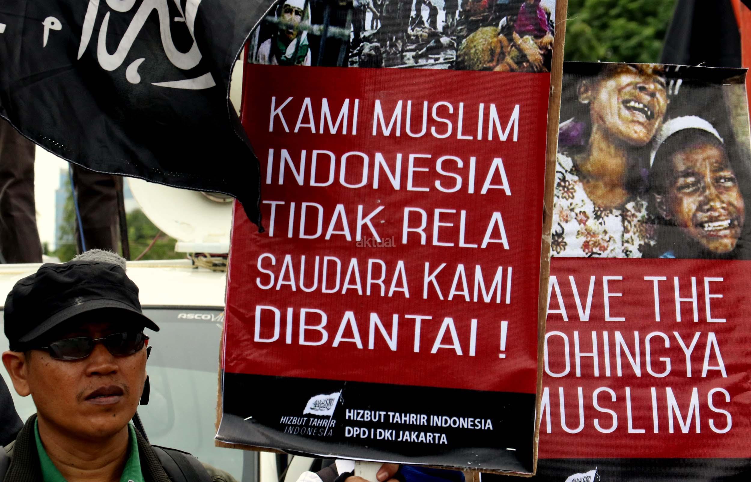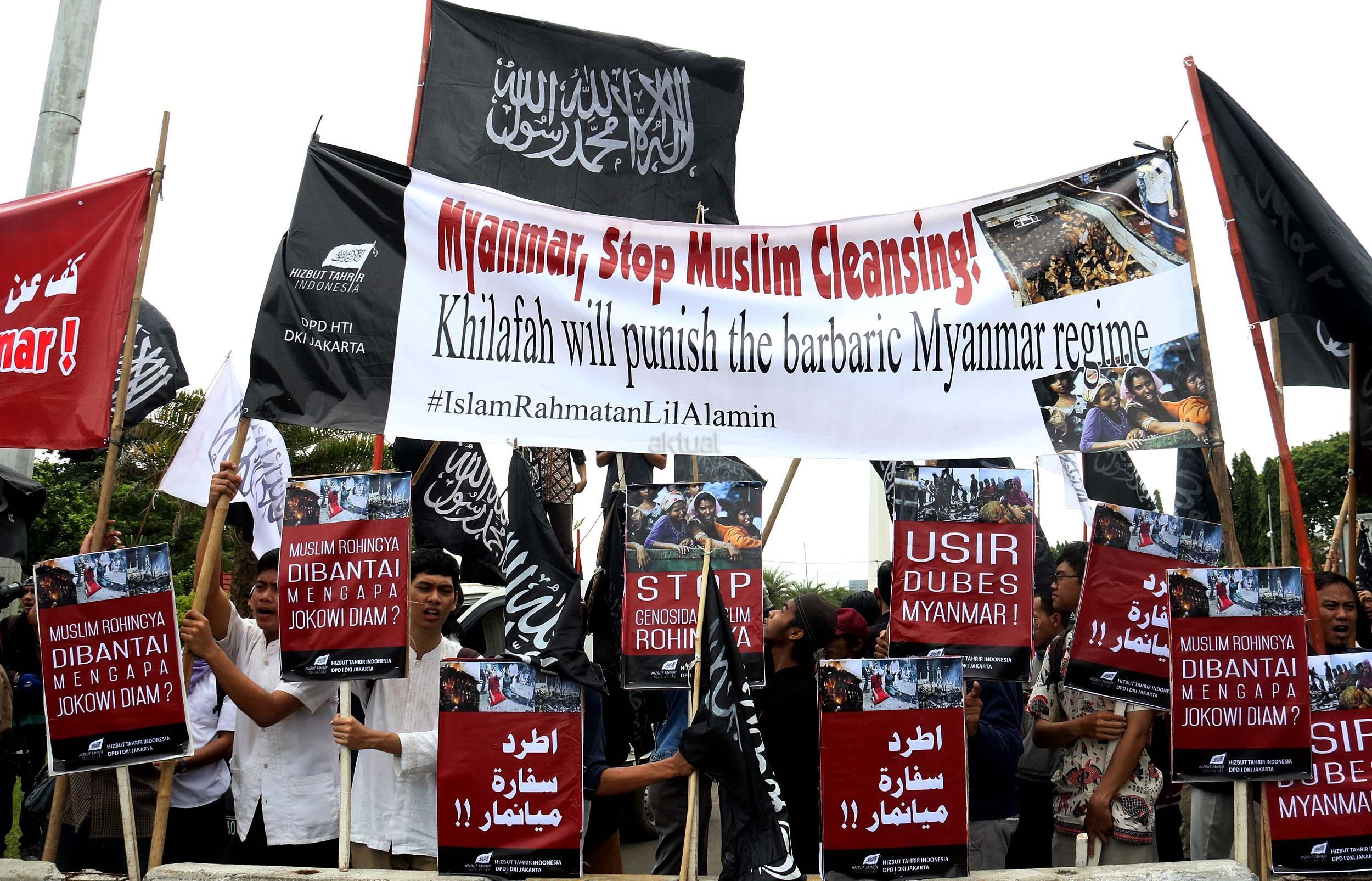 Ratusan massa Hizbut Tahrir Indonesia melakukan aksi tolak pembantaian muslim Rohingya di depan Istana Merdeka, Jakarta, Kamis (24/11/2016). Dalam aksinya Hizbut Tahrir Indonesia mendesak Jokowi untuk segera mengusir Duta Besar Myanmar dari Indonesia. AKTUAL/Munzir