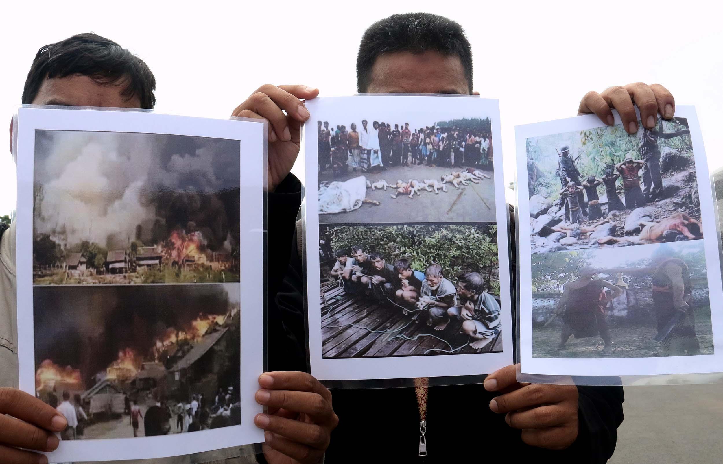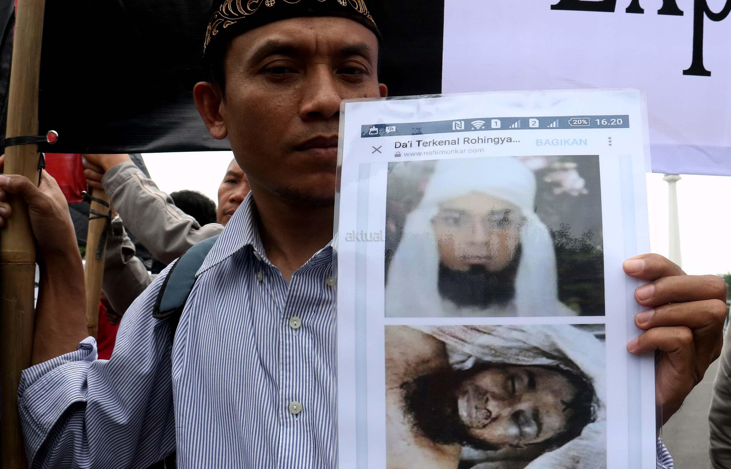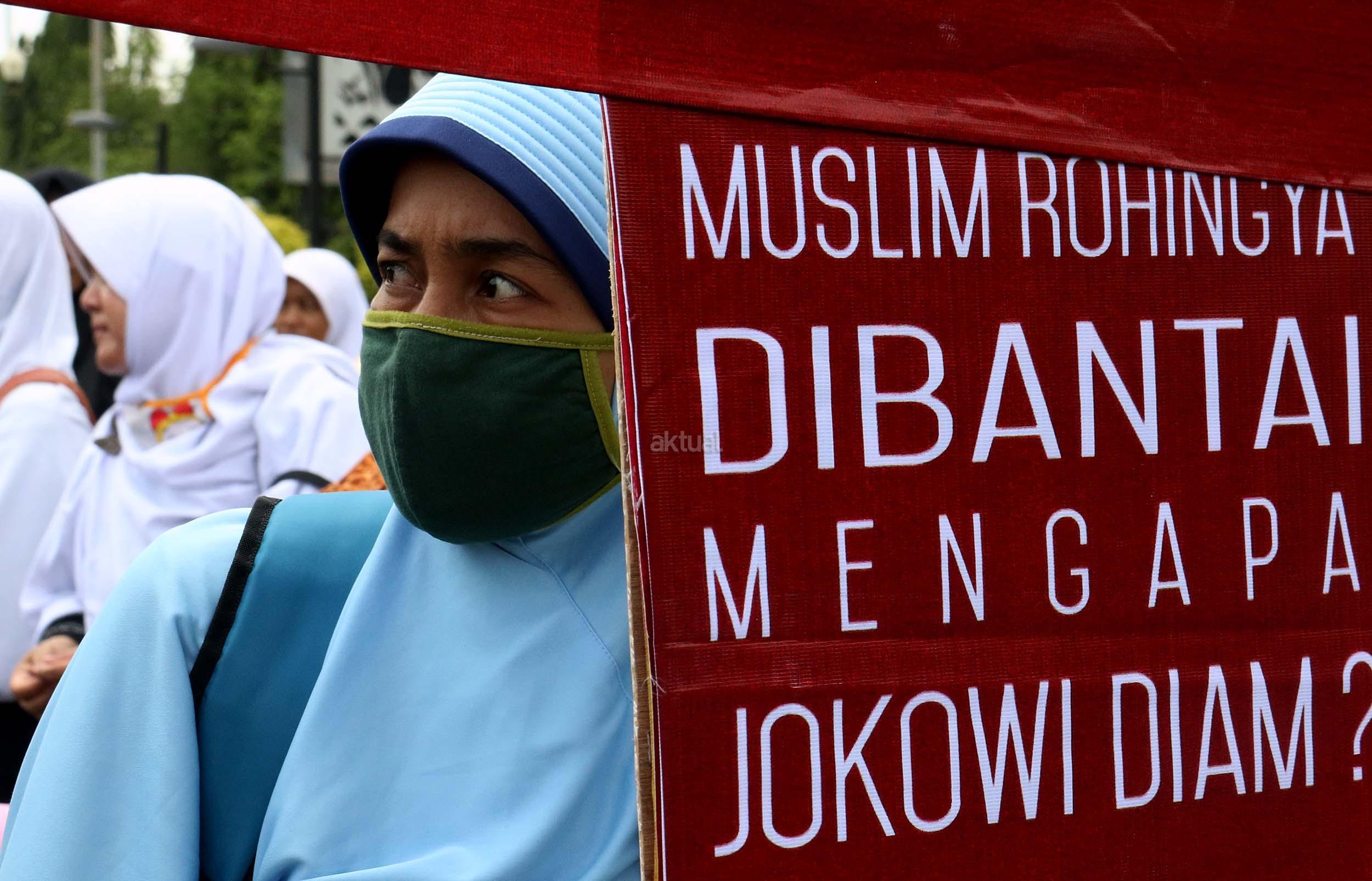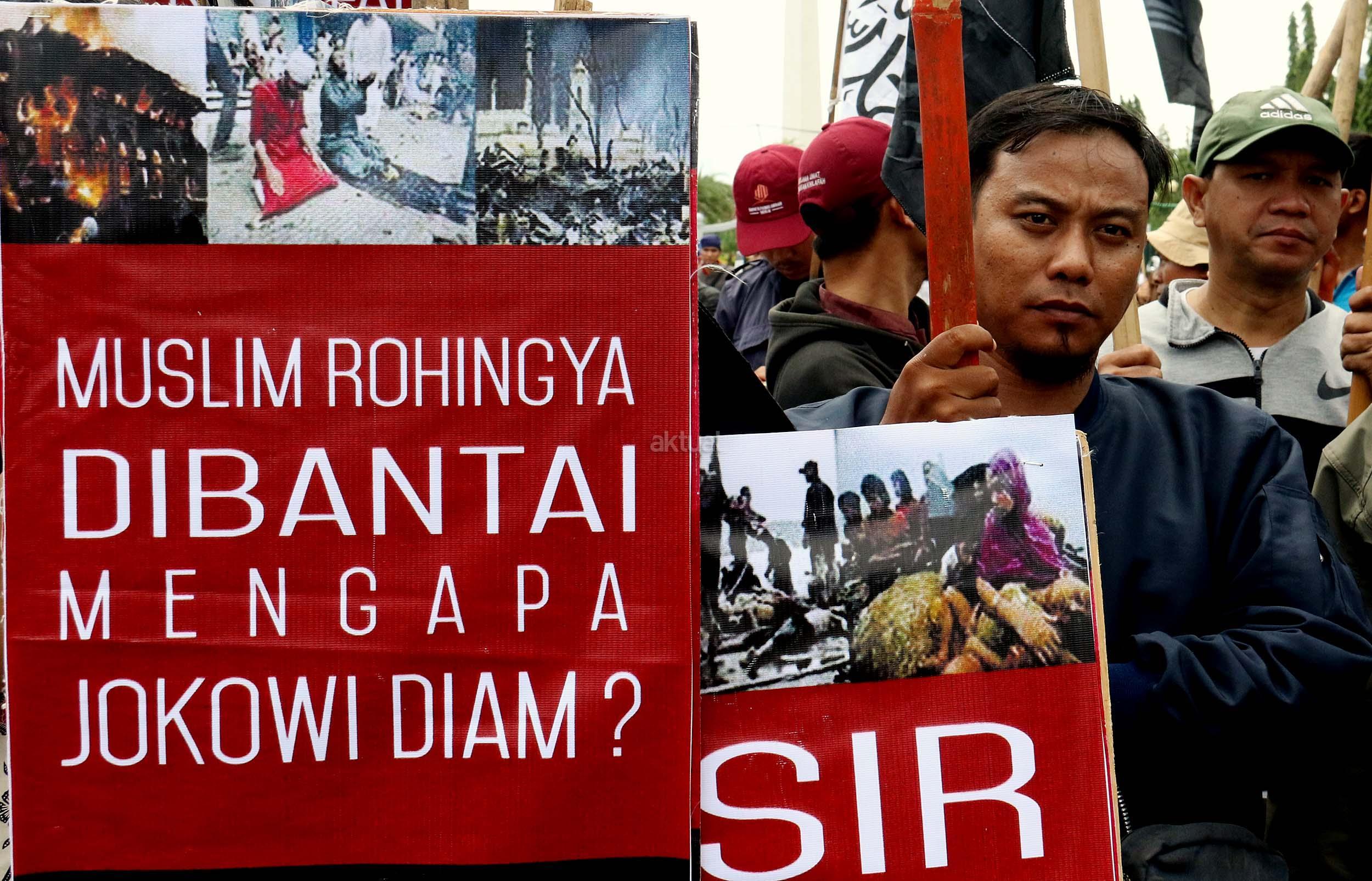 Ratusan massa Hizbut Tahrir Indonesia melakukan aksi tolak pembantaian muslim Rohingya di depan Istana Merdeka, Jakarta, Kamis (24/11/2016). Dalam aksinya Hizbut Tahrir Indonesia mendesak Jokowi untuk segera mengusir Duta Besar Myanmar dari Indonesia. AKTUAL/Munzir