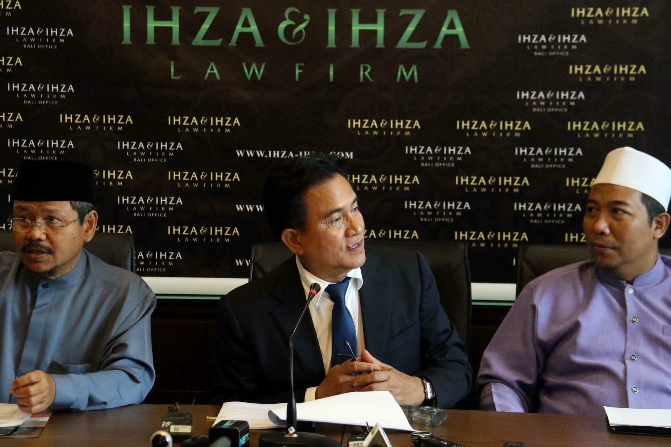 Koordinator Kuasa Hukum pembela HTI Yusril Ihza Mahendara (tengah) yang didampingi perwakilan Hizbut Tahrir Indonesia (HTI) saat menggelar jumpa persnya terkait pembubaran organisasi
