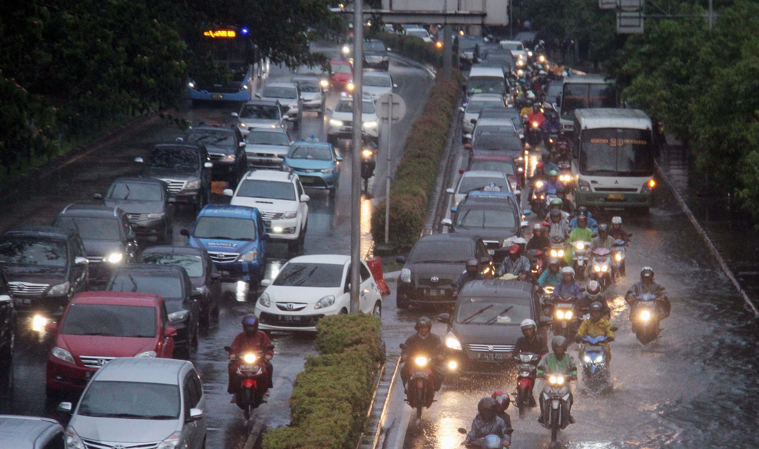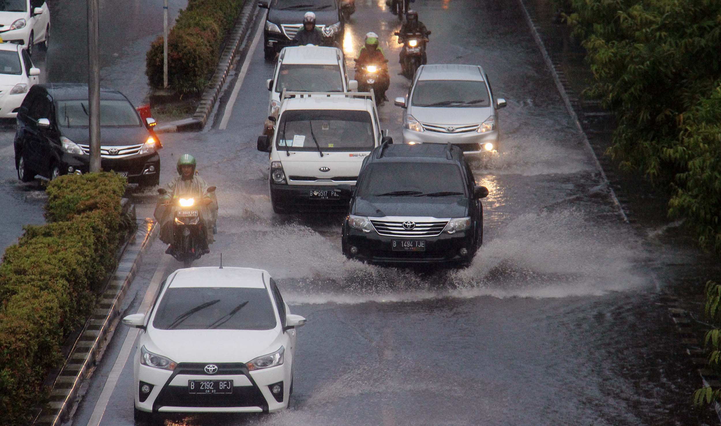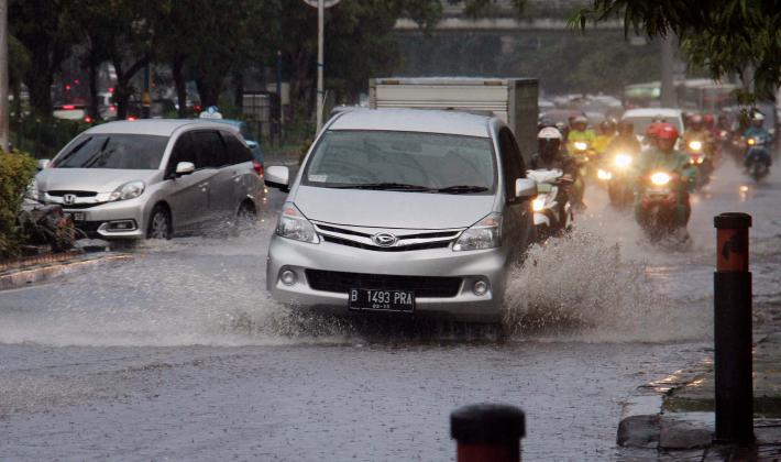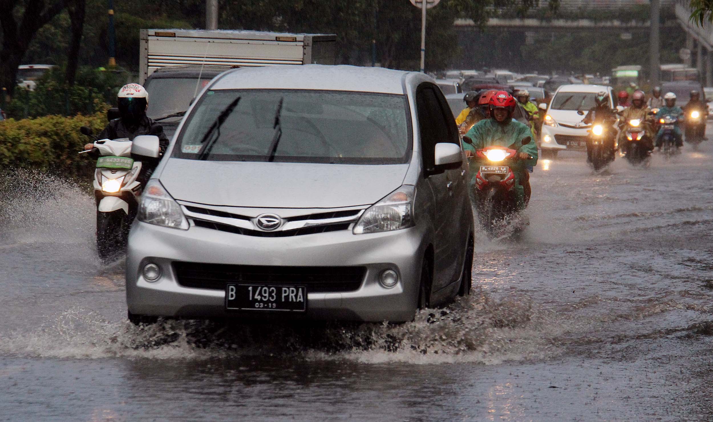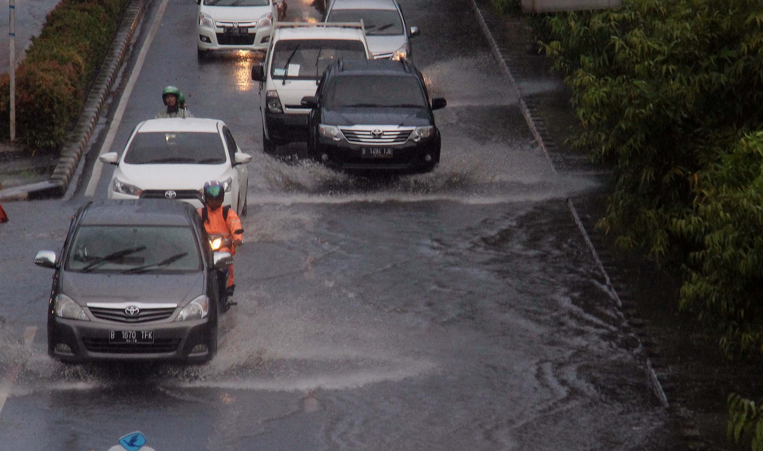 Sejumlah kendaran mencoba menerobos genangan air di kawasan Kuningan, Jakarta, Rabu (1/6/2016). Jalur lambat di Jalan HR Rasuna Said, Kuningan, tampak dihindari pengendara karena terdapat genagan air setinggi 20 cm.