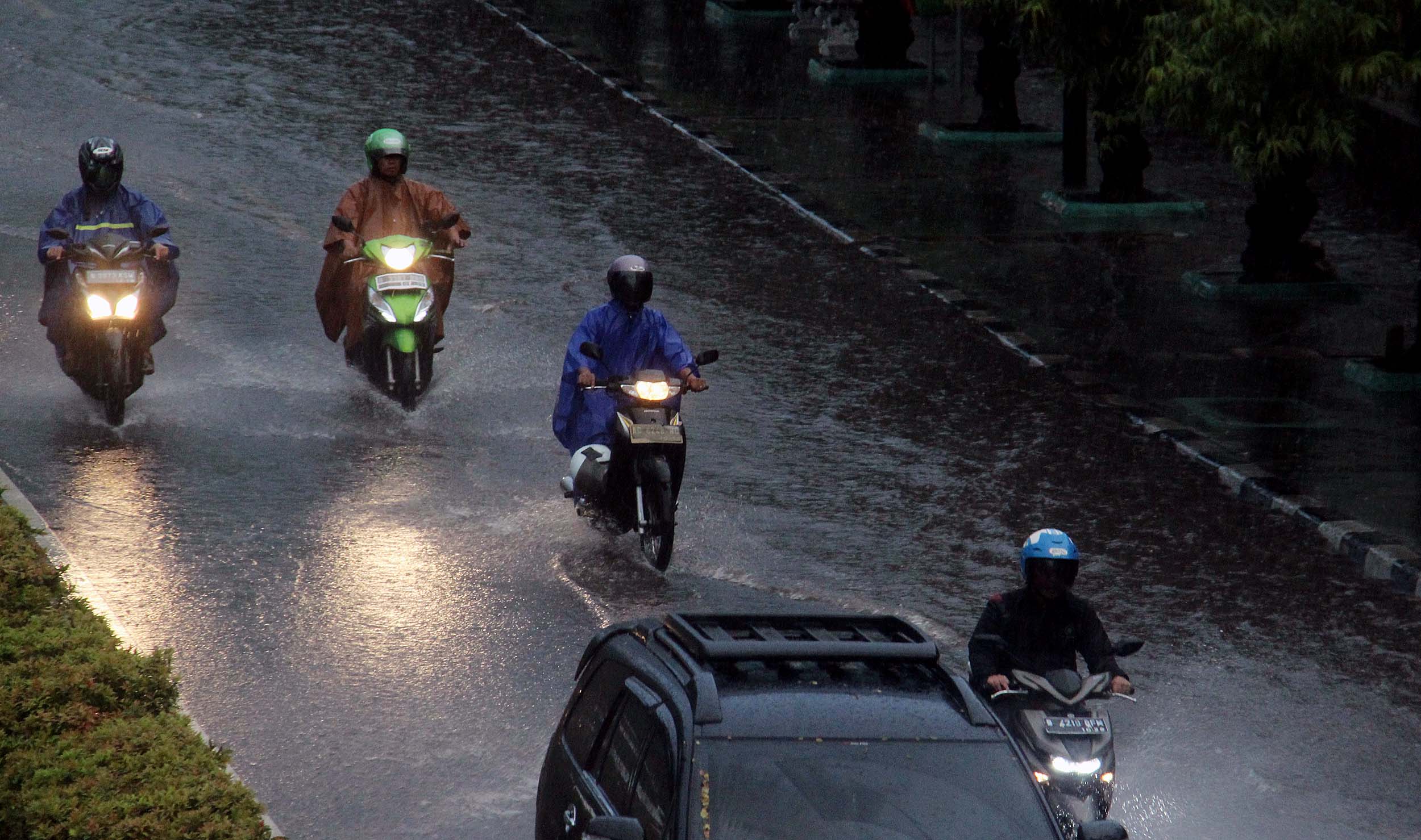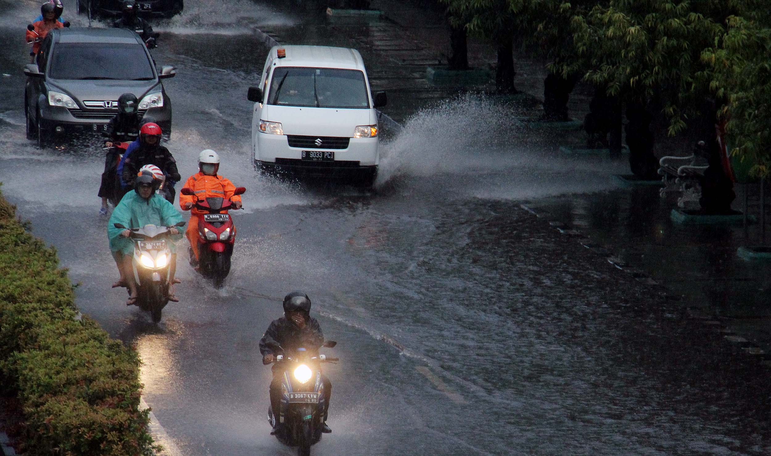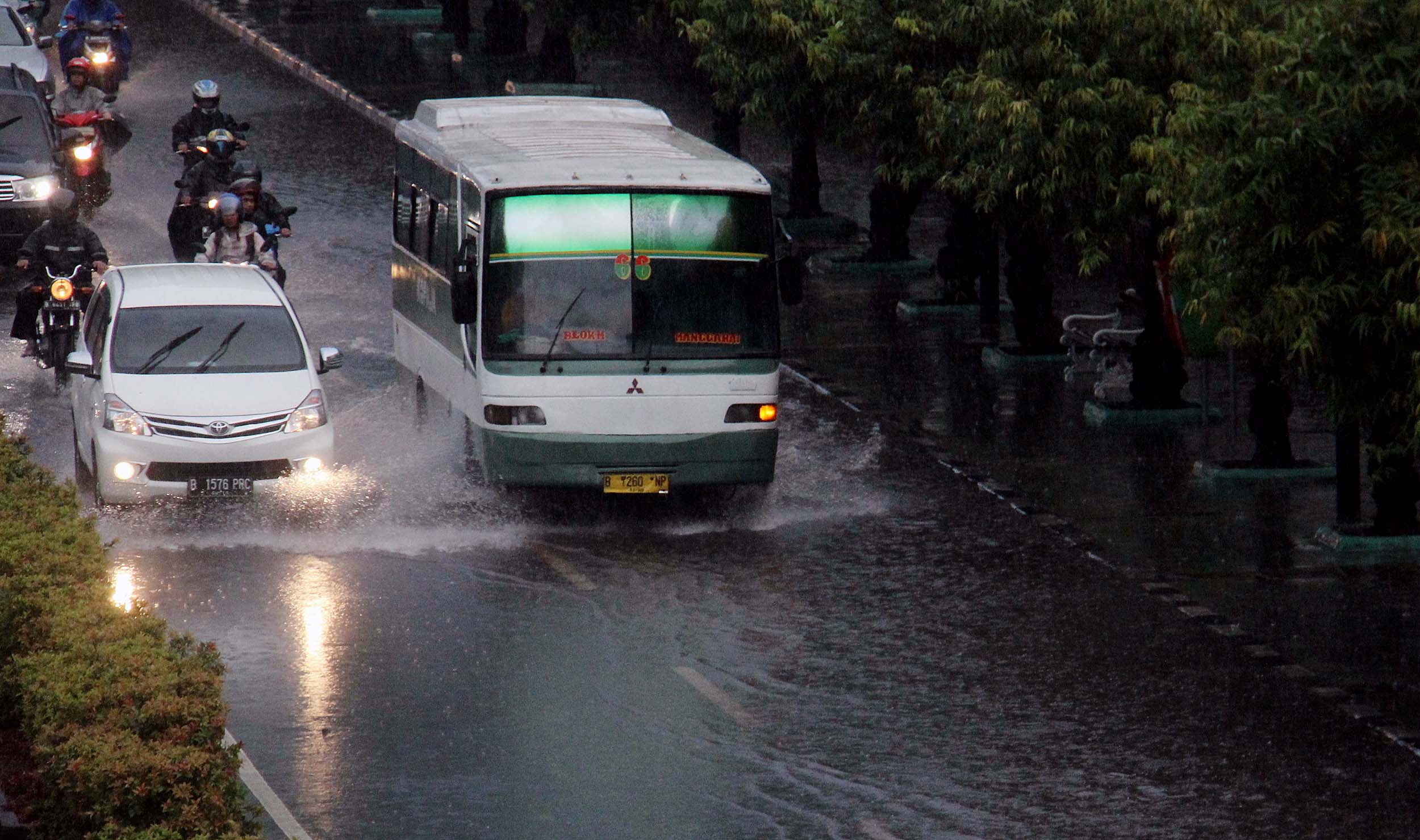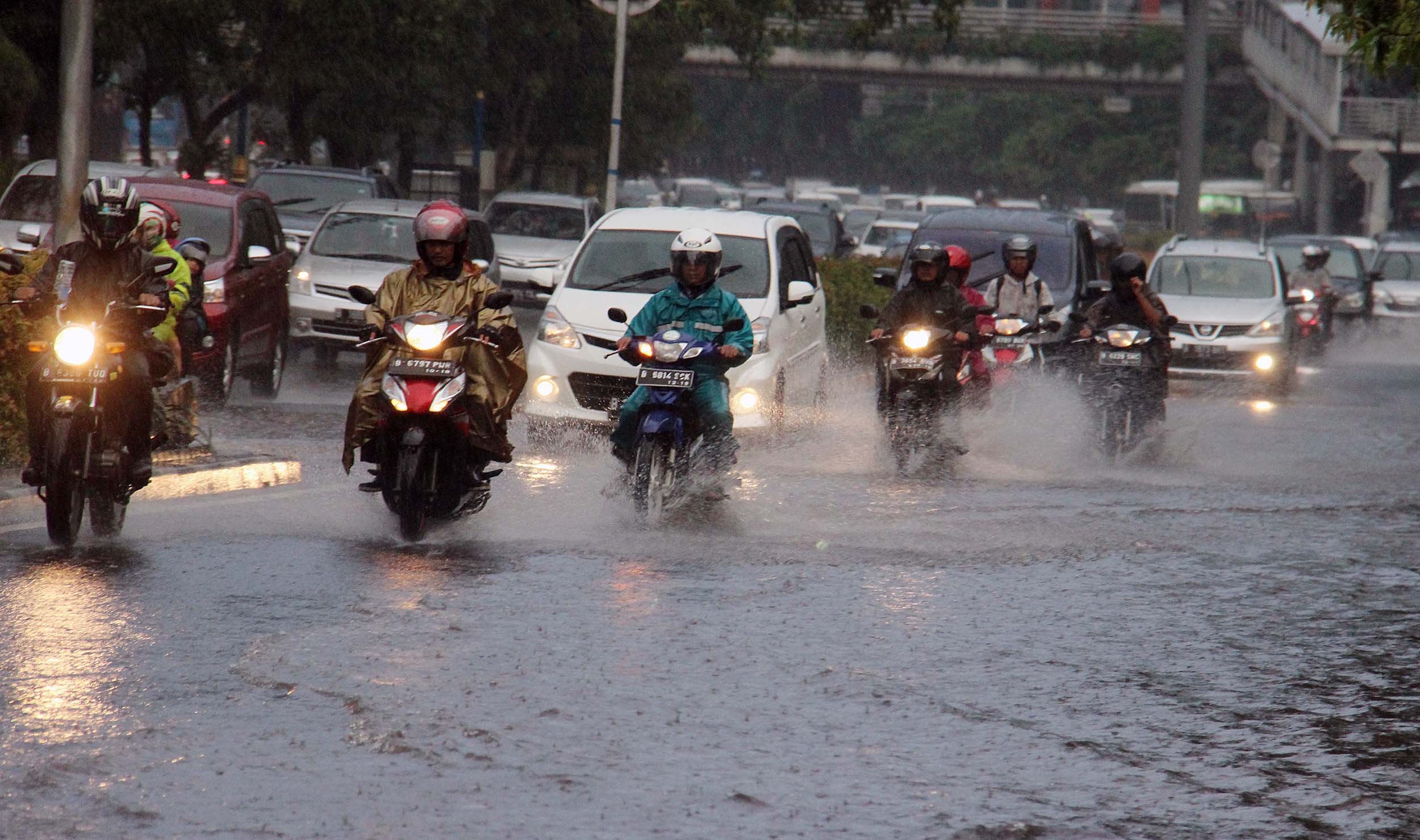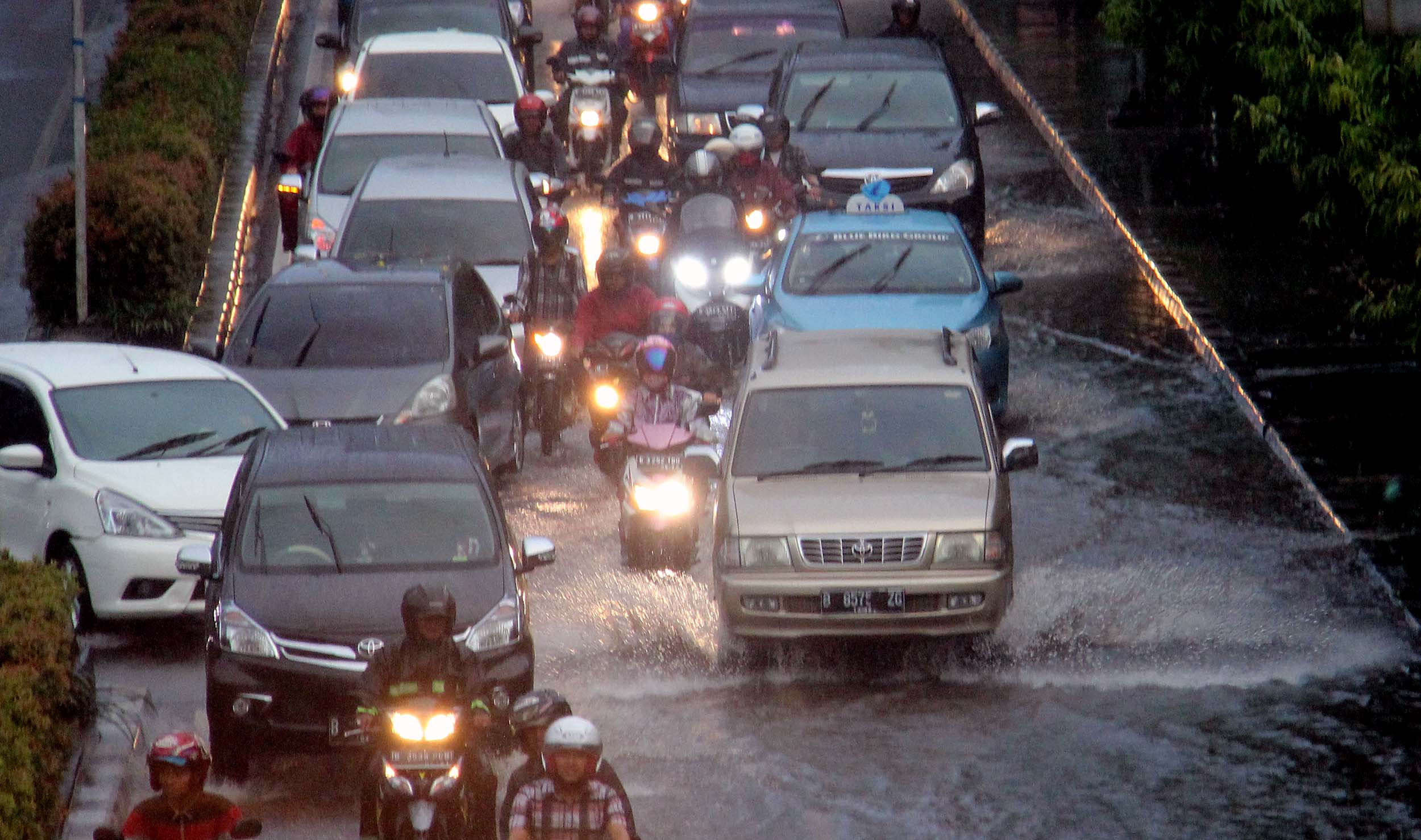 Sejumlah kendaran mencoba menerobos genangan air di kawasan Kuningan, Jakarta, Rabu (1/6/2016). Jalur lambat di Jalan HR Rasuna Said, Kuningan, tampak dihindari pengendara karena terdapat genagan air setinggi 20 cm.