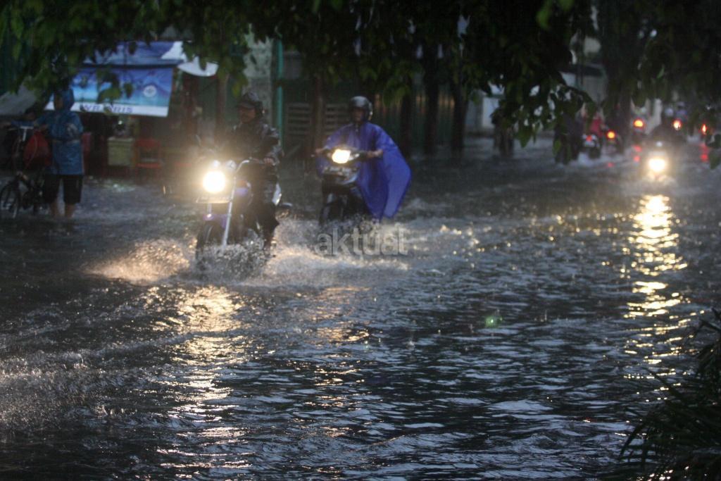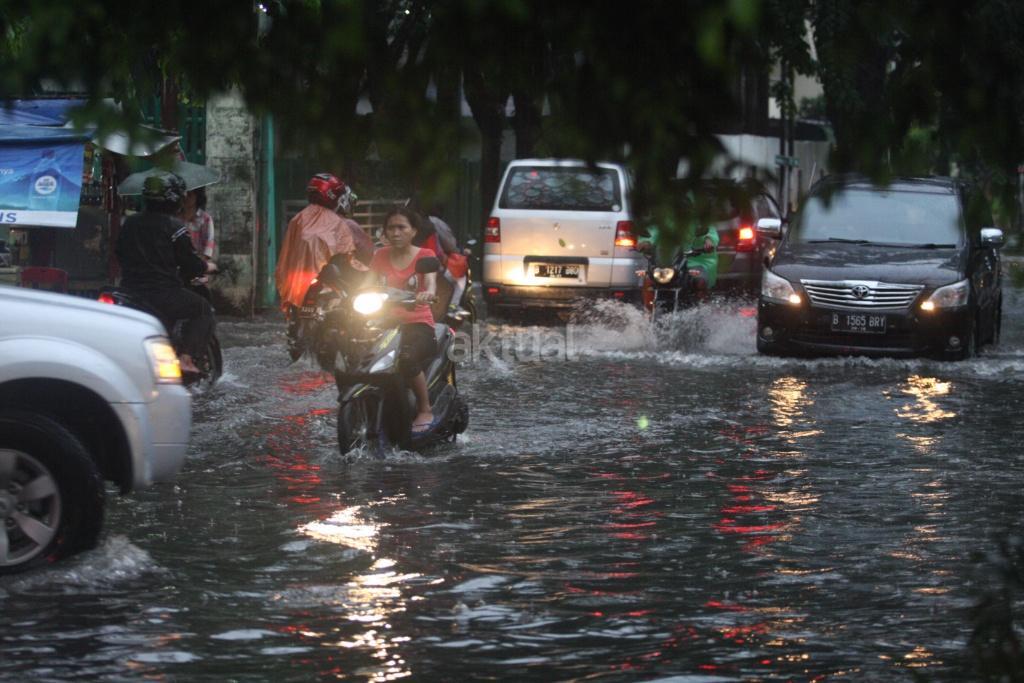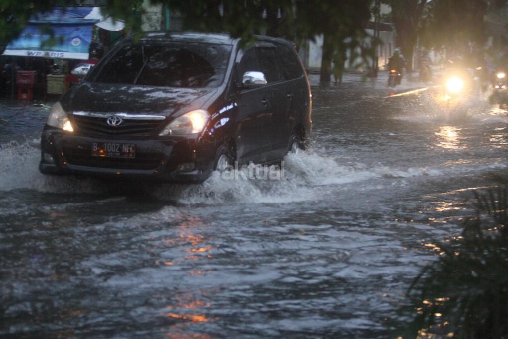 Sejumlah kendaraan menerobos genangan setinggi 30 cm saat hujan di Kawasan Green Garden, Kedoya, Jakarta Barat, Senin (13/11). Genangan air terjadi karena tingginya intensitas hujan pada sore hari dan buruknya drainase di kawasan tersebut. AKTUAL/Tino Oktaviano