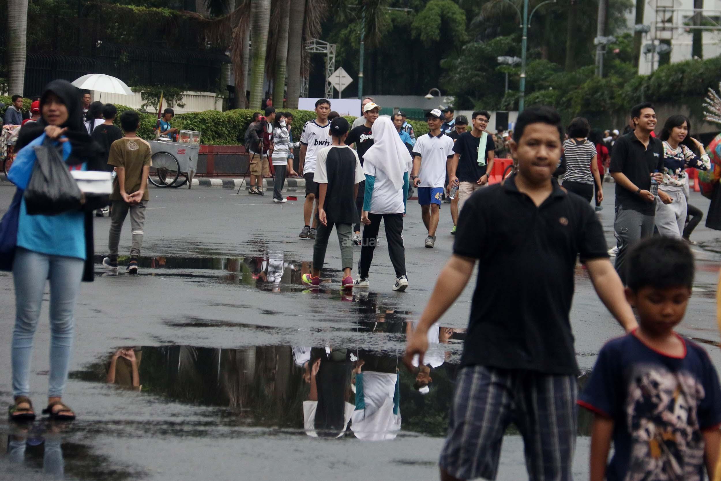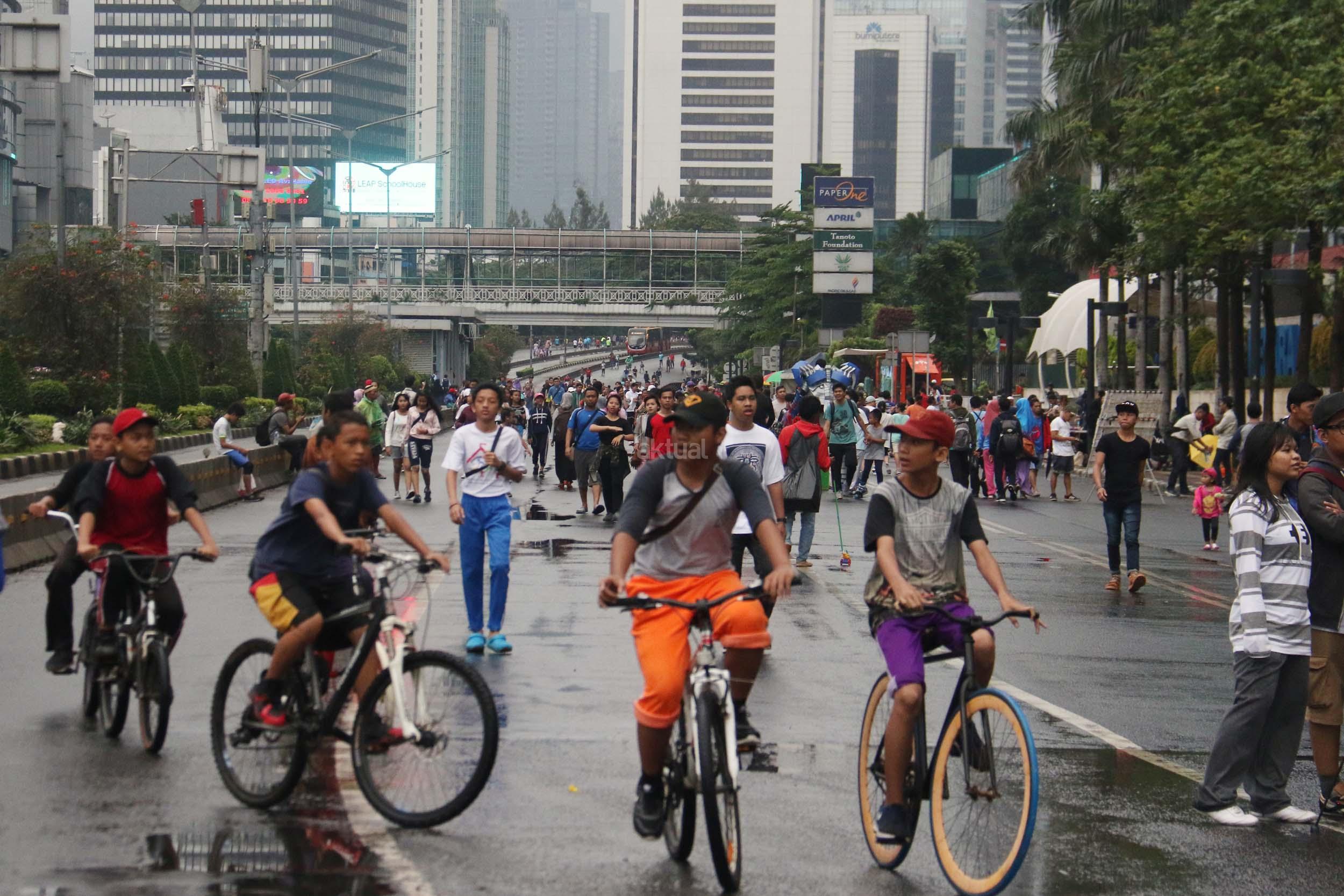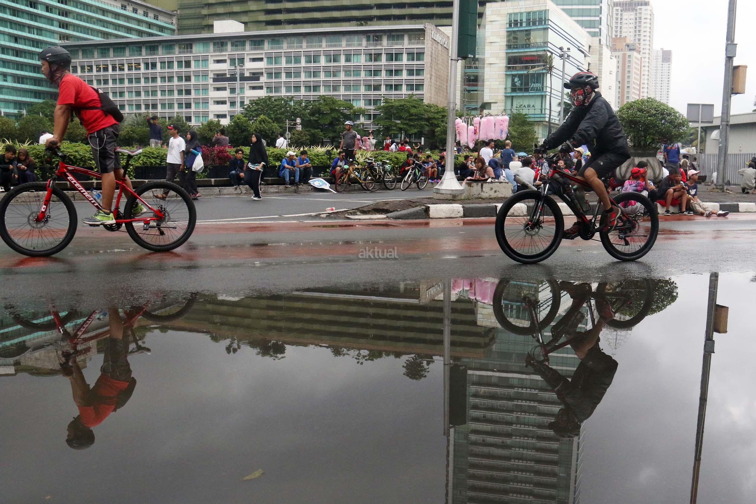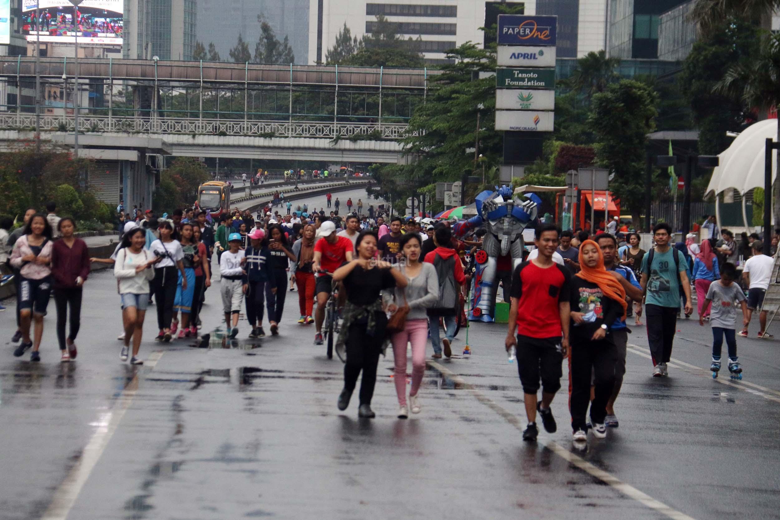 Walaupun gerimis terus menerus mengguyur Jakarta sejak pagi tadi tidak menyurutkan minat masyarakat yang melakukan kegiatan rutin hari bebas kendaraan bermotor atau car free day (CFD) di Bundaran Hotel Indonesia. AKTUAL/Munzir