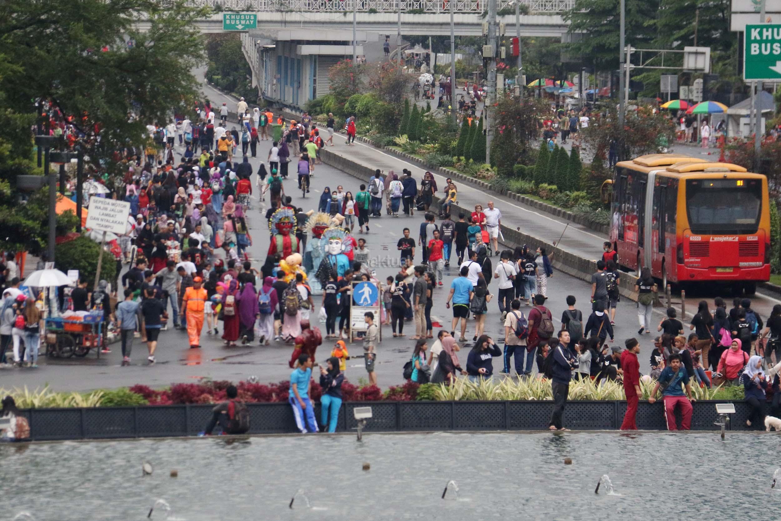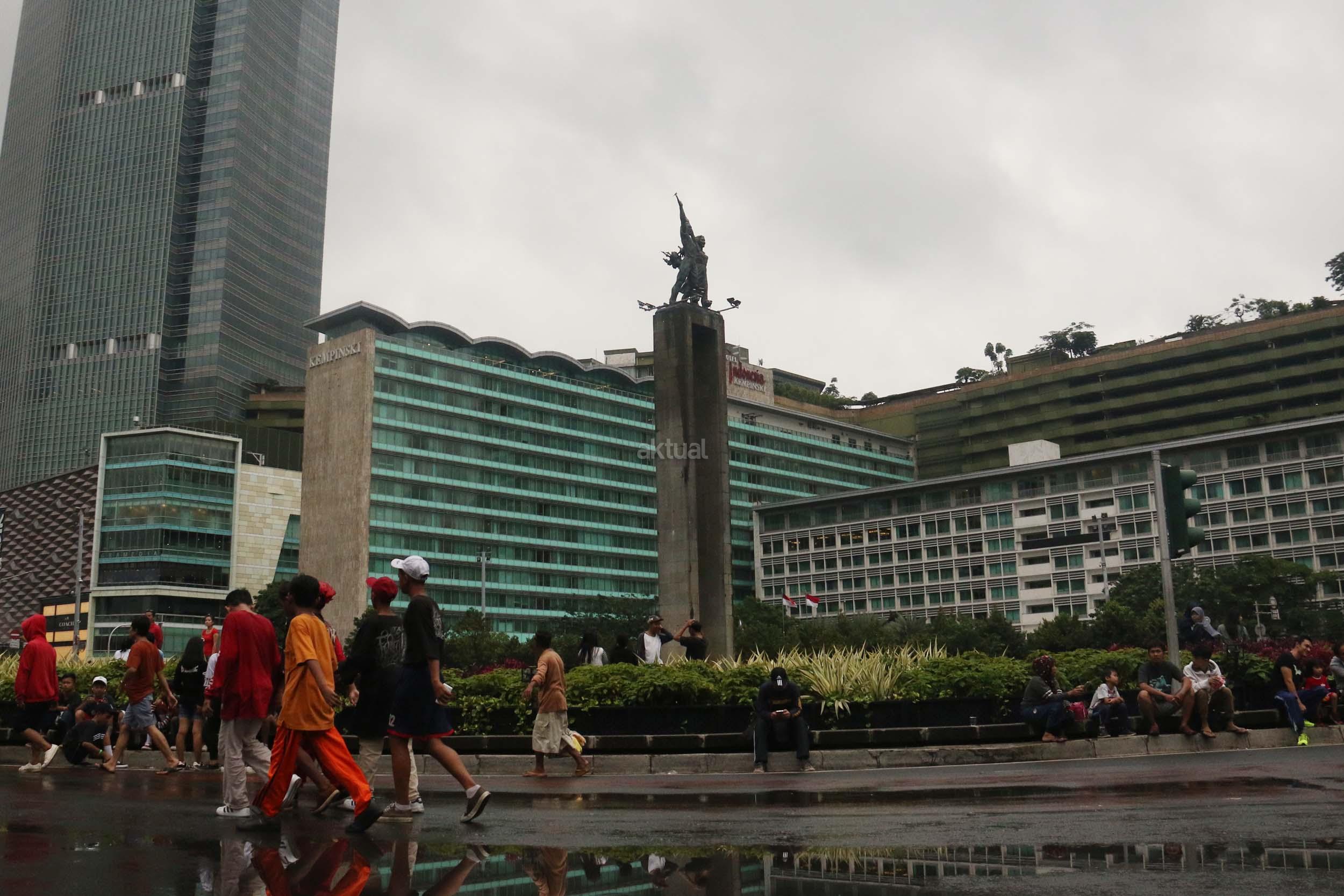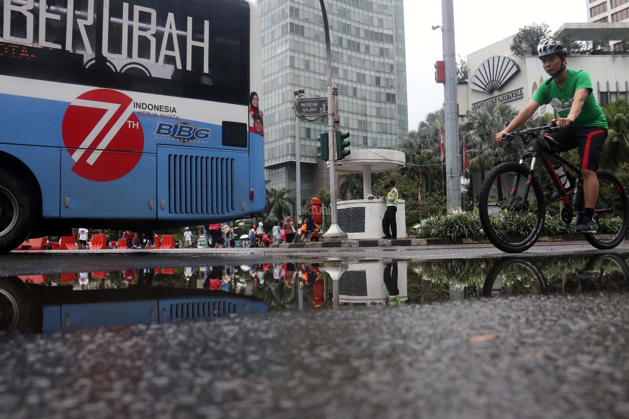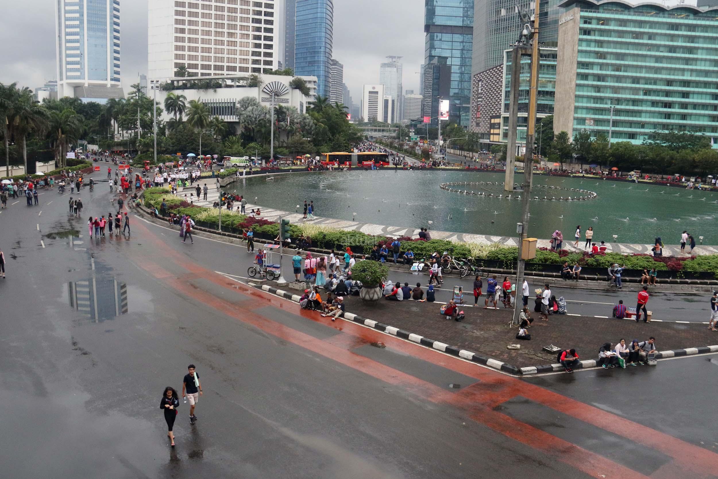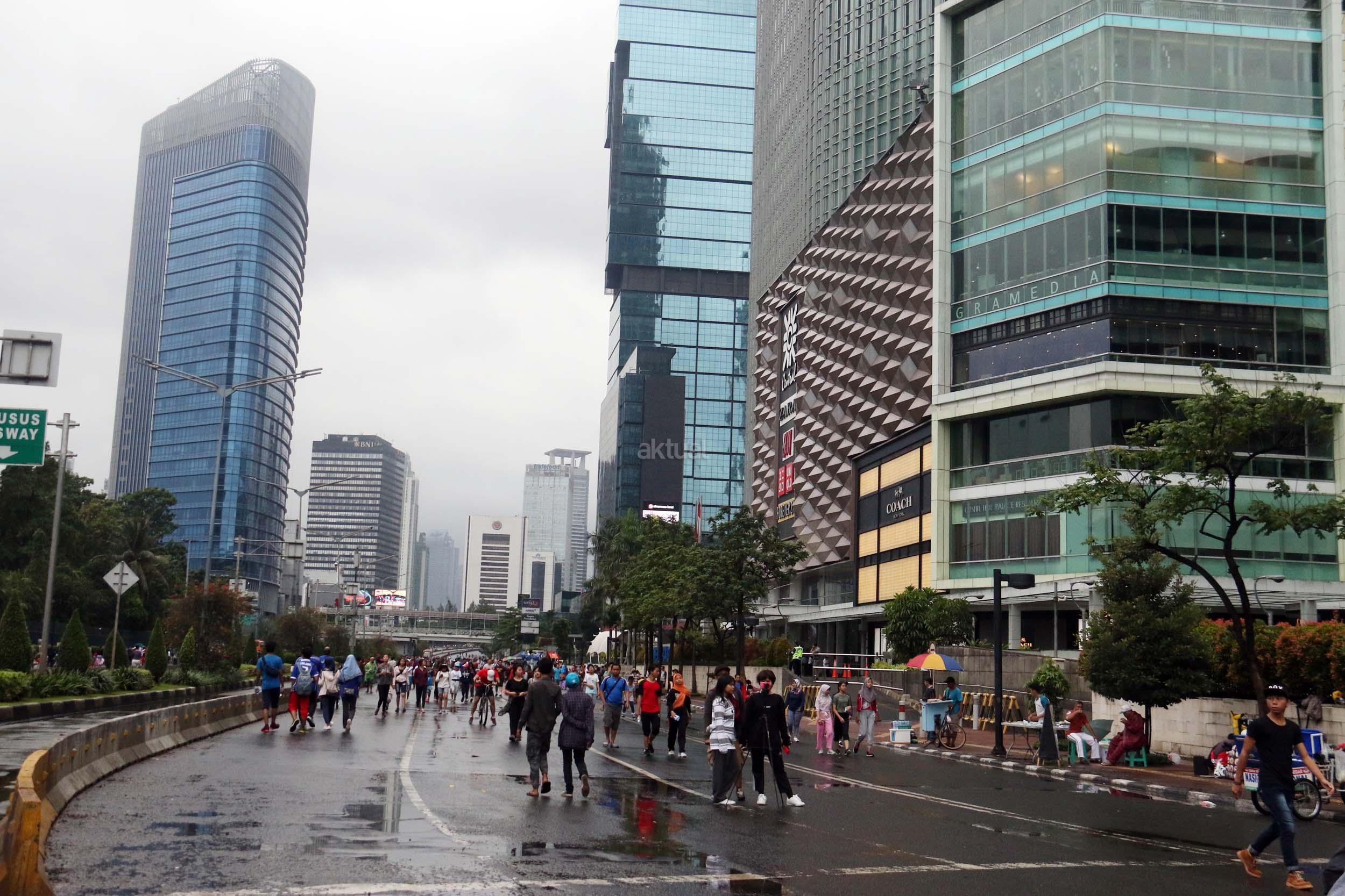 Walaupun gerimis terus menerus mengguyur Jakarta sejak pagi tadi tidak menyurutkan minat masyarakat yang melakukan kegiatan rutin hari bebas kendaraan bermotor atau car free day (CFD) di Bundaran Hotel Indonesia. AKTUAL/Munzir