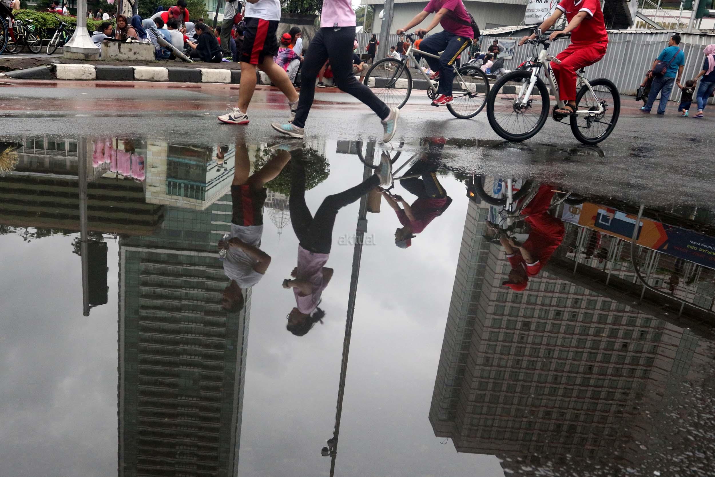 Tampak sejumlah warga tetap berktivitas di kawasan CFD, Jakarta, Minggu (19/2/2017). Walaupun gerimis terus menerus mengguyur Jakarta sejak pagi tadi tidak menyurutkan minat masyarakat yang melakukan kegiatan rutin hari bebas kendaraan bermotor atau car free day (CFD) di Bundaran Hotel Indonesia