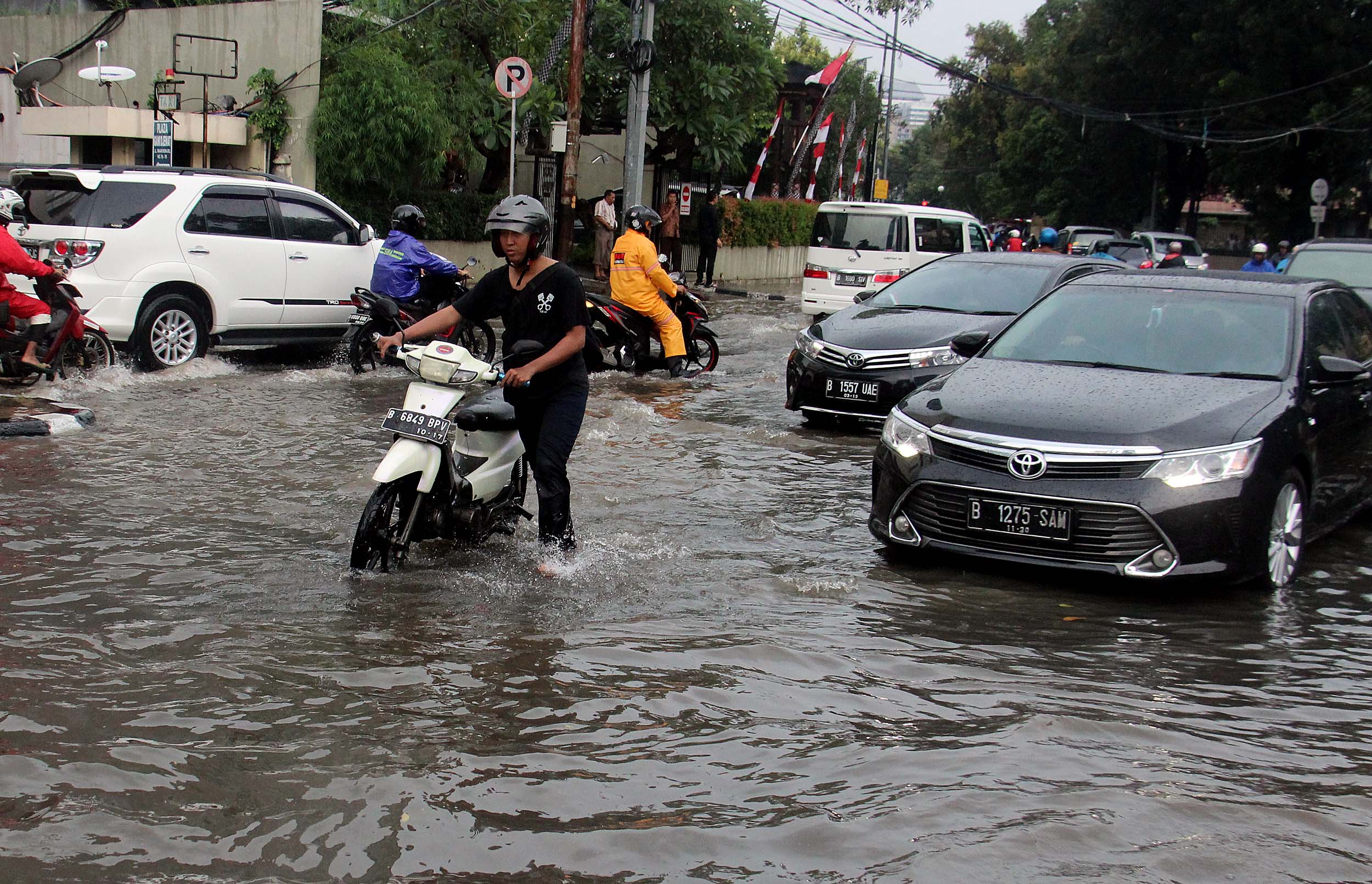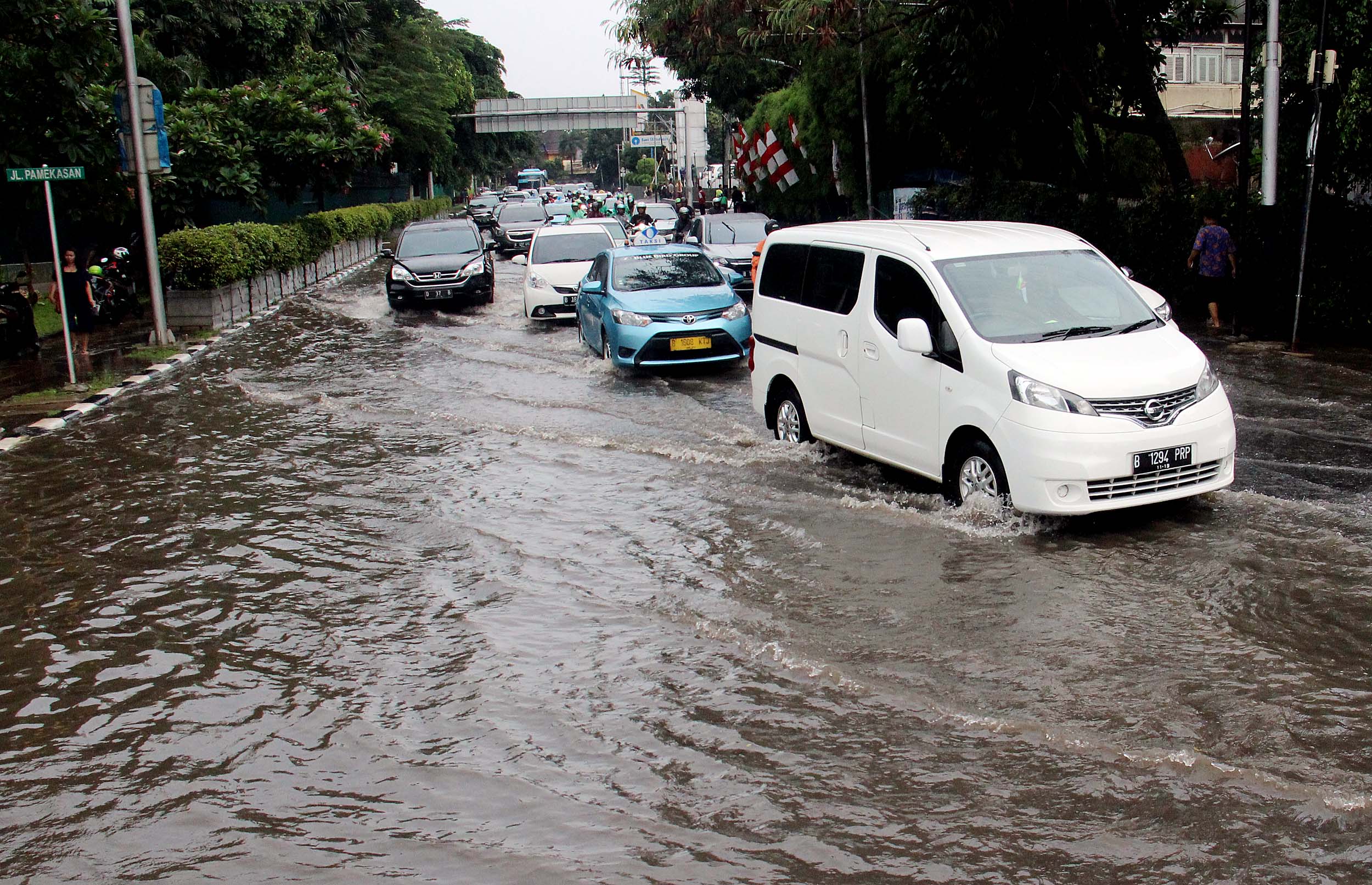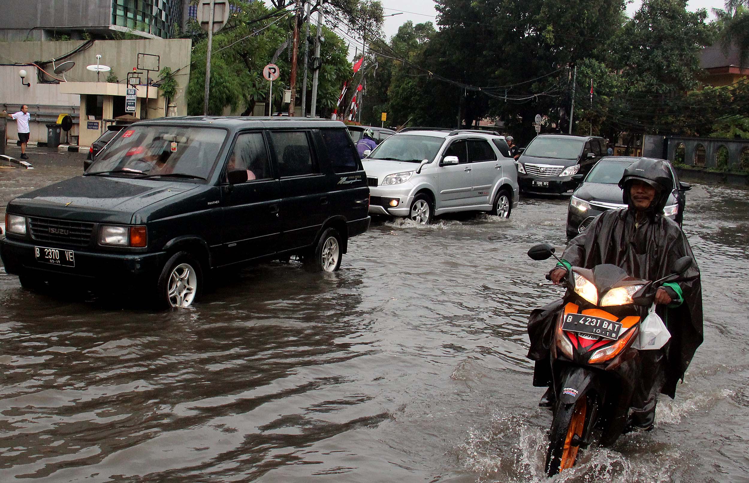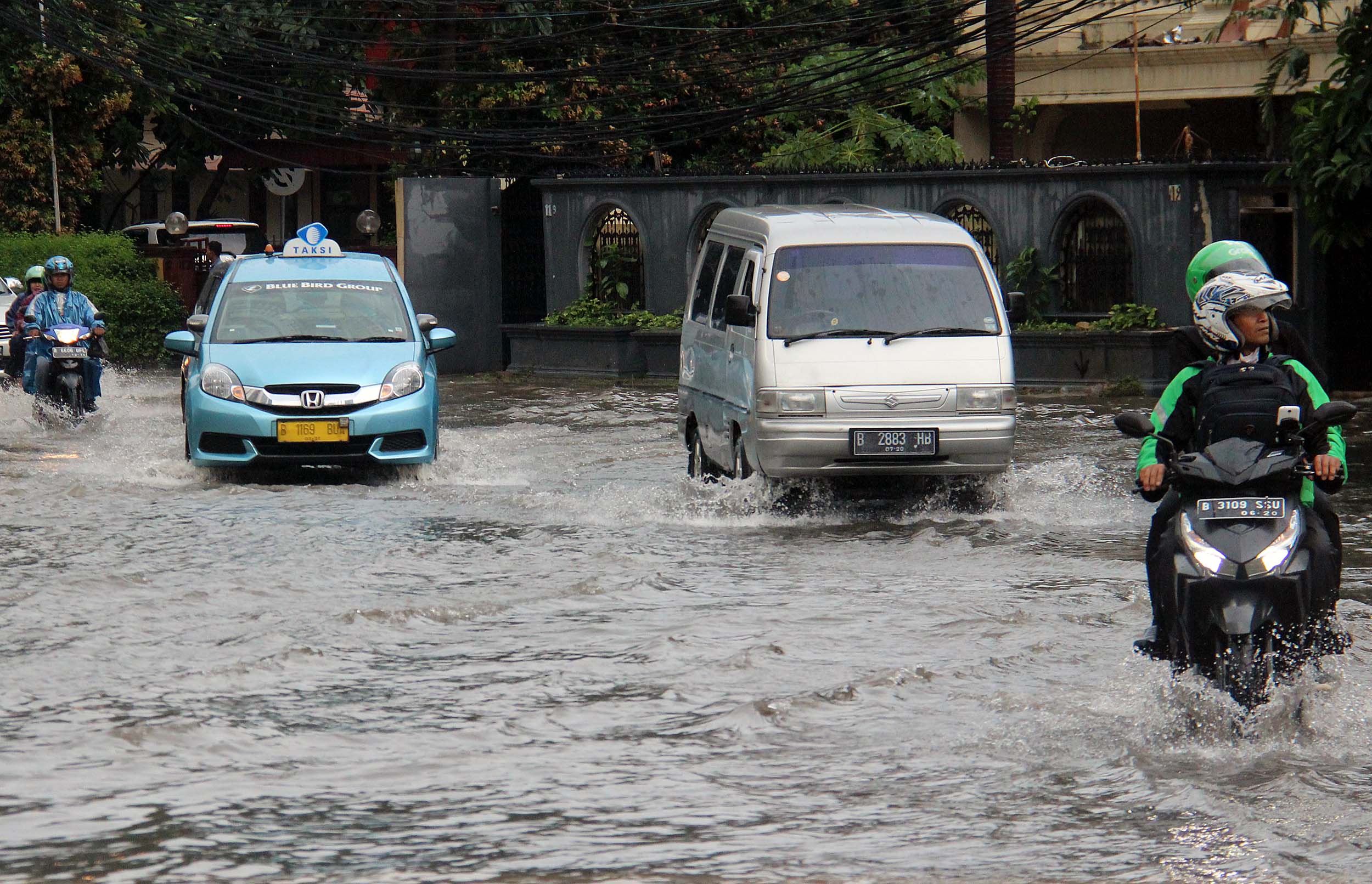 Terlihat sejumlah kendaraan menerobos banjir yang menggenangi jalan. Agus Salim dan jalan. Pamekasan, Menteng, Jakarta Pusat, Selasa (30/8/2016). Sebagian wilayah DKI Jakarta siang ini diguyur hujan lebat yang disertai badai. Akibatnya, sejumlah ruas jalan padat dan terjadi antrean kendaraan. Namun sekitar pukul 13.00 WIB, hujan di sebagian wilayah Ibu Kota mulai mereda.