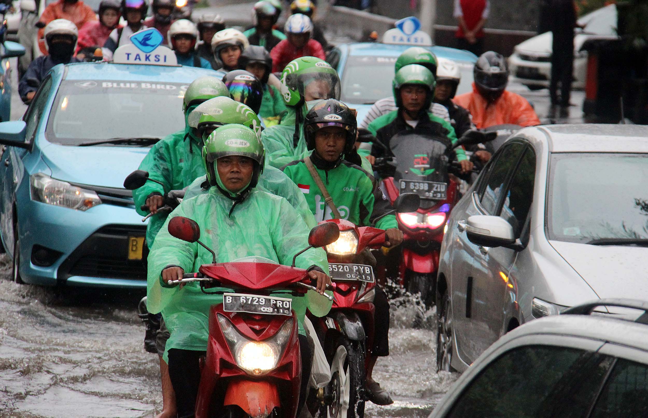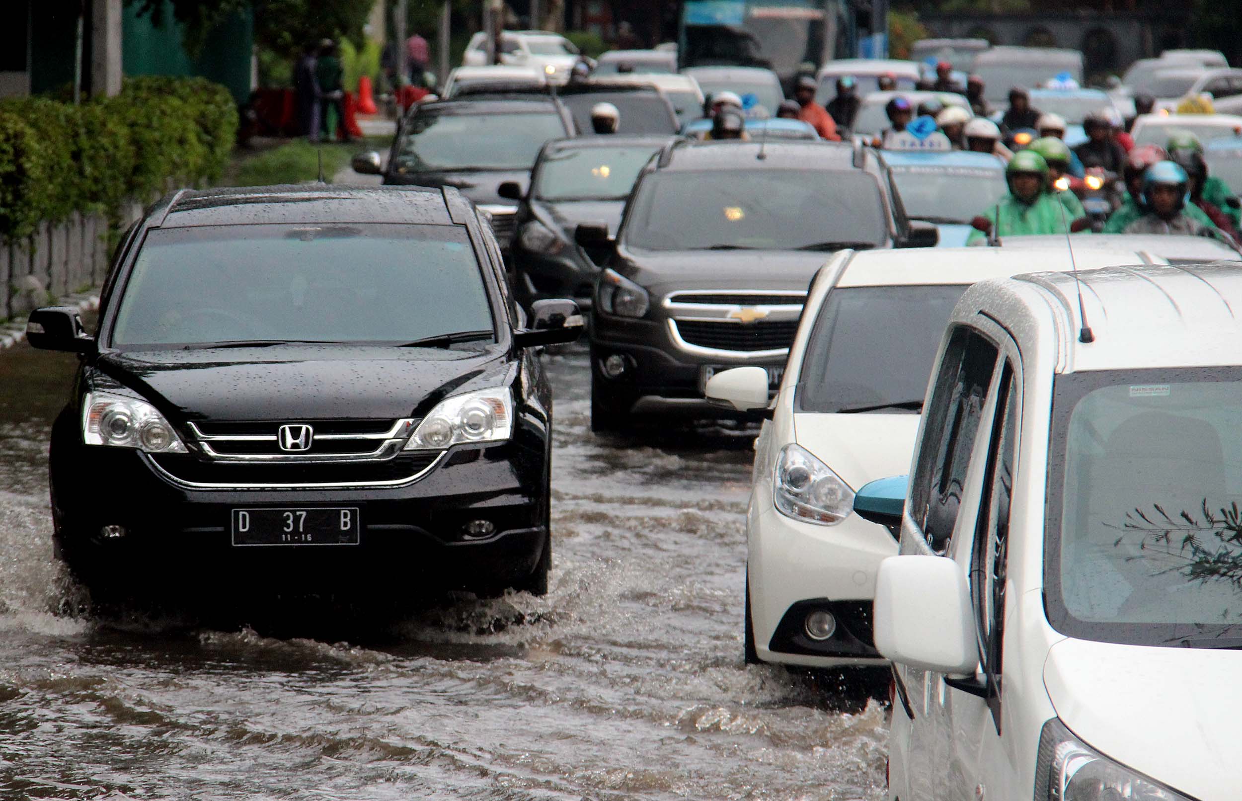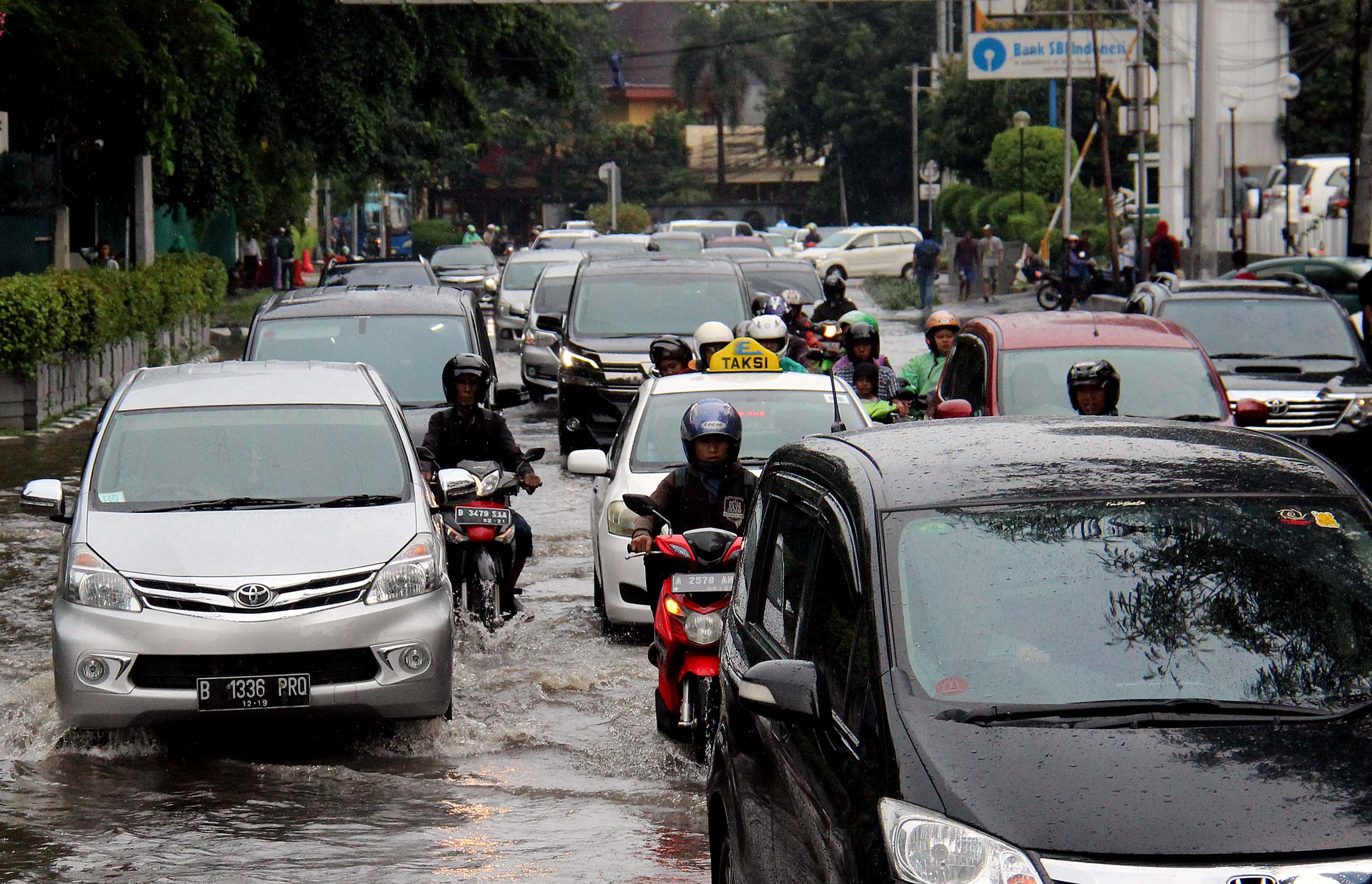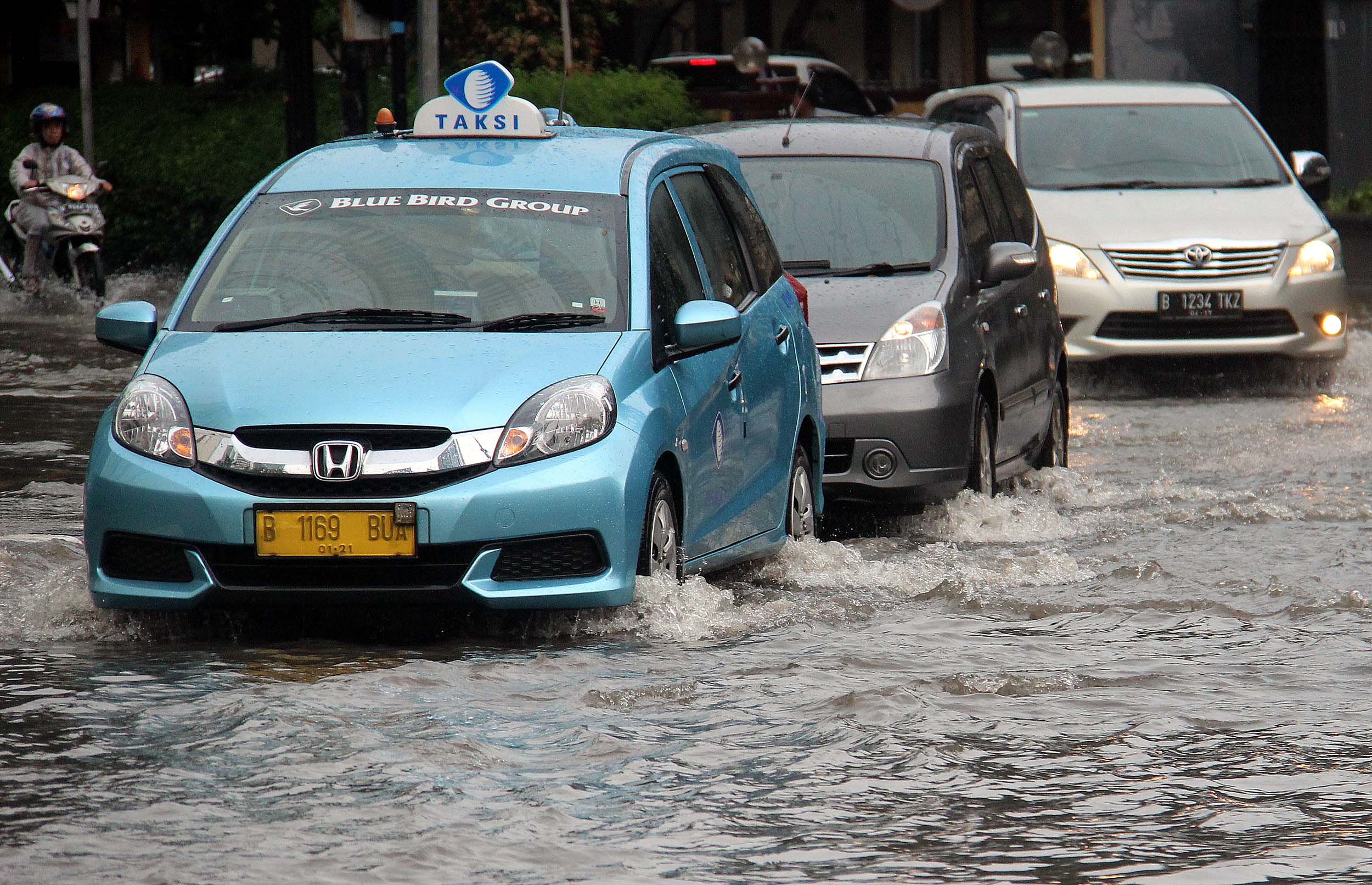 Terlihat sejumlah kendaraan menerobos banjir yang menggenangi jalan. Agus Salim dan jalan. Pamekasan, Menteng, Jakarta Pusat, Selasa (30/8/2016). Sebagian wilayah DKI Jakarta siang ini diguyur hujan lebat yang disertai badai. Akibatnya, sejumlah ruas jalan padat dan terjadi antrean kendaraan. Namun sekitar pukul 13.00 WIB, hujan di sebagian wilayah Ibu Kota mulai mereda.