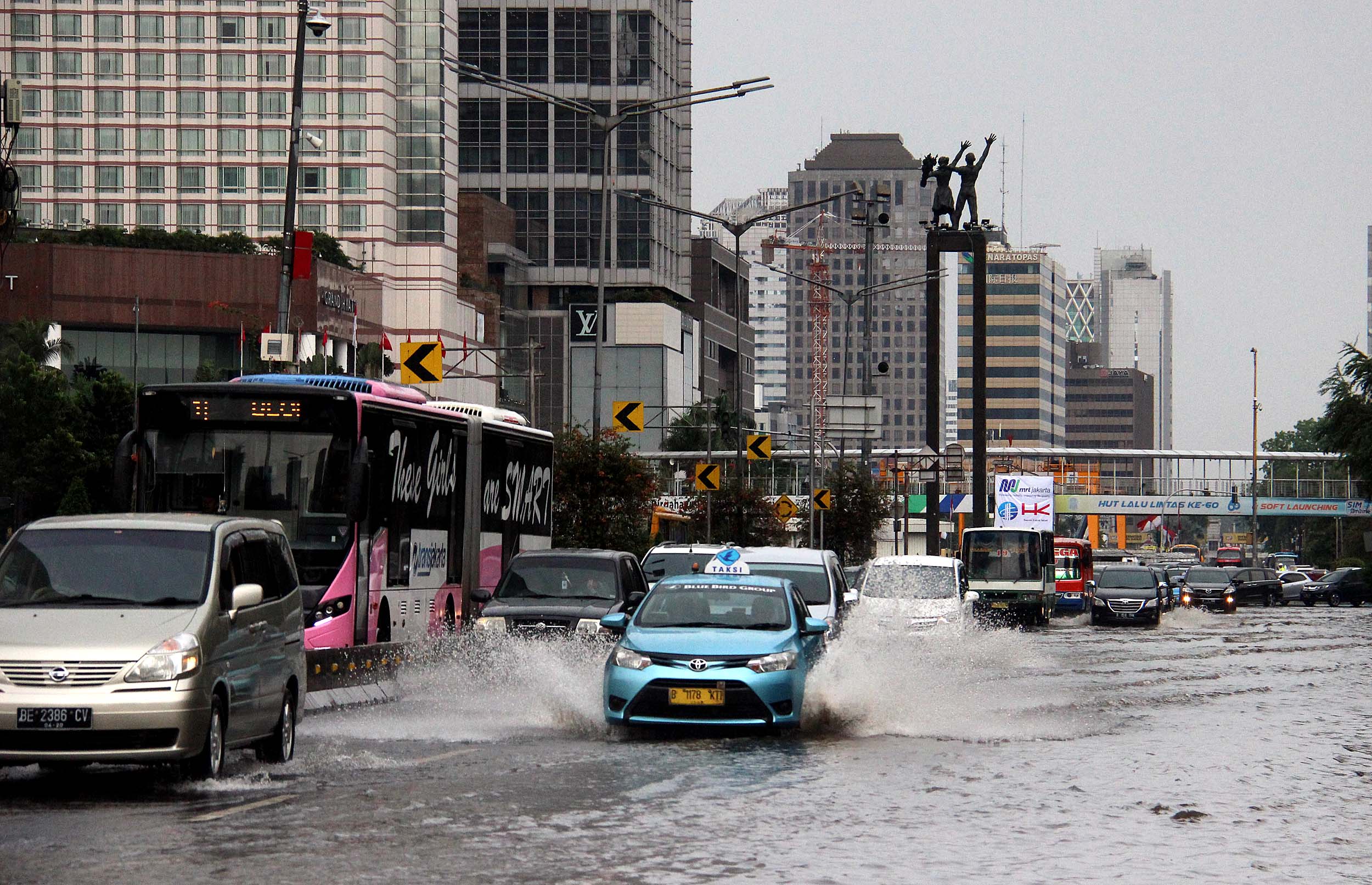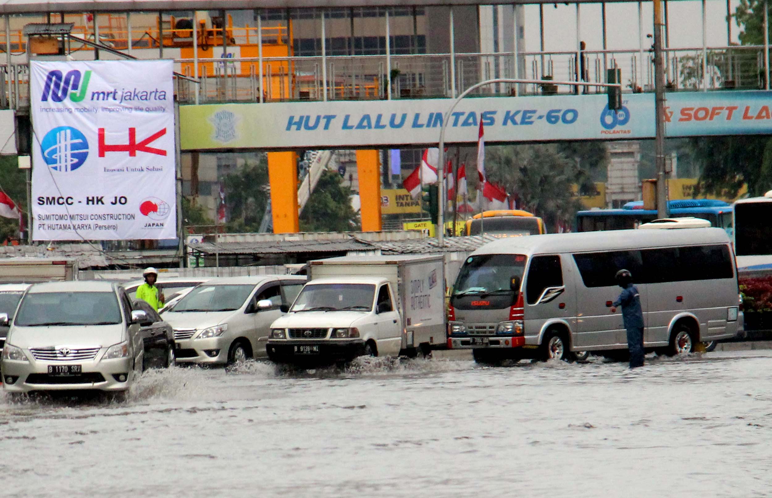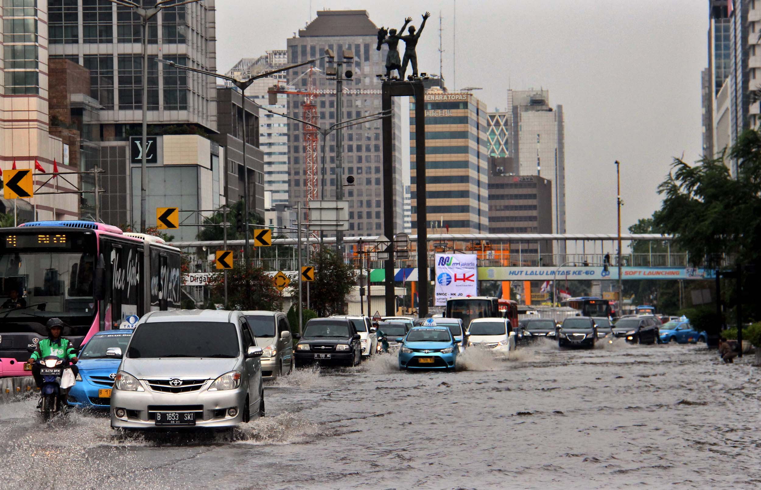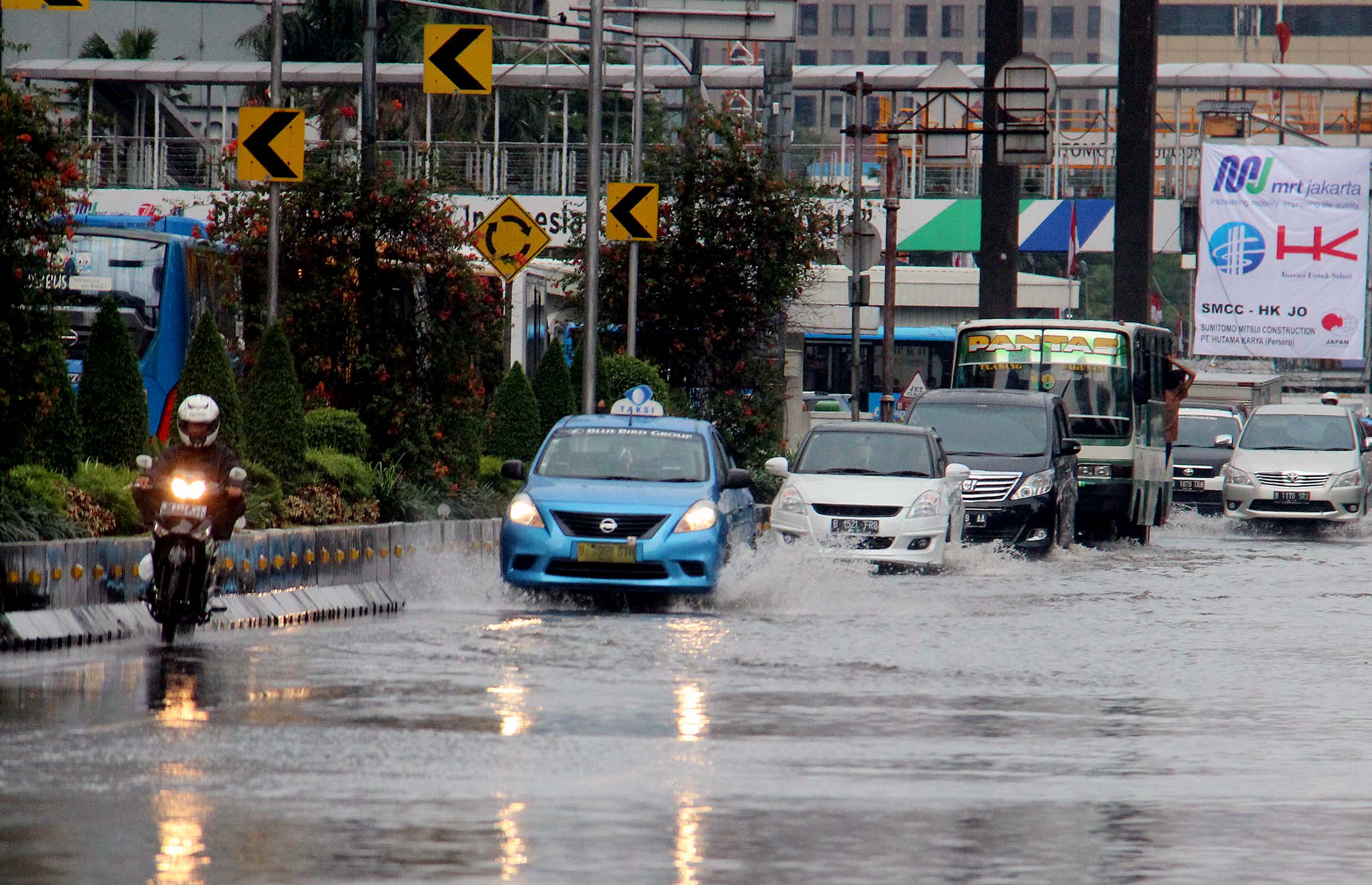 Terlihat sejumlah kendaraan kejebak banjir yang menggenangi seputaran kawasan Bunderan HI di Jalan. Jenderal Sudirman, Jakarta, Selasa (30/8/2016). Sebagian wilayah DKI Jakarta siang ini diguyur hujan lebat yang disertai badai. Akibatnya, sejumlah ruas jalan padat dan terjadi antrean kendaraan. Namun sekitar pukul 13.00 WIB, hujan di sebagian wilayah Ibu Kota mulai mereda.