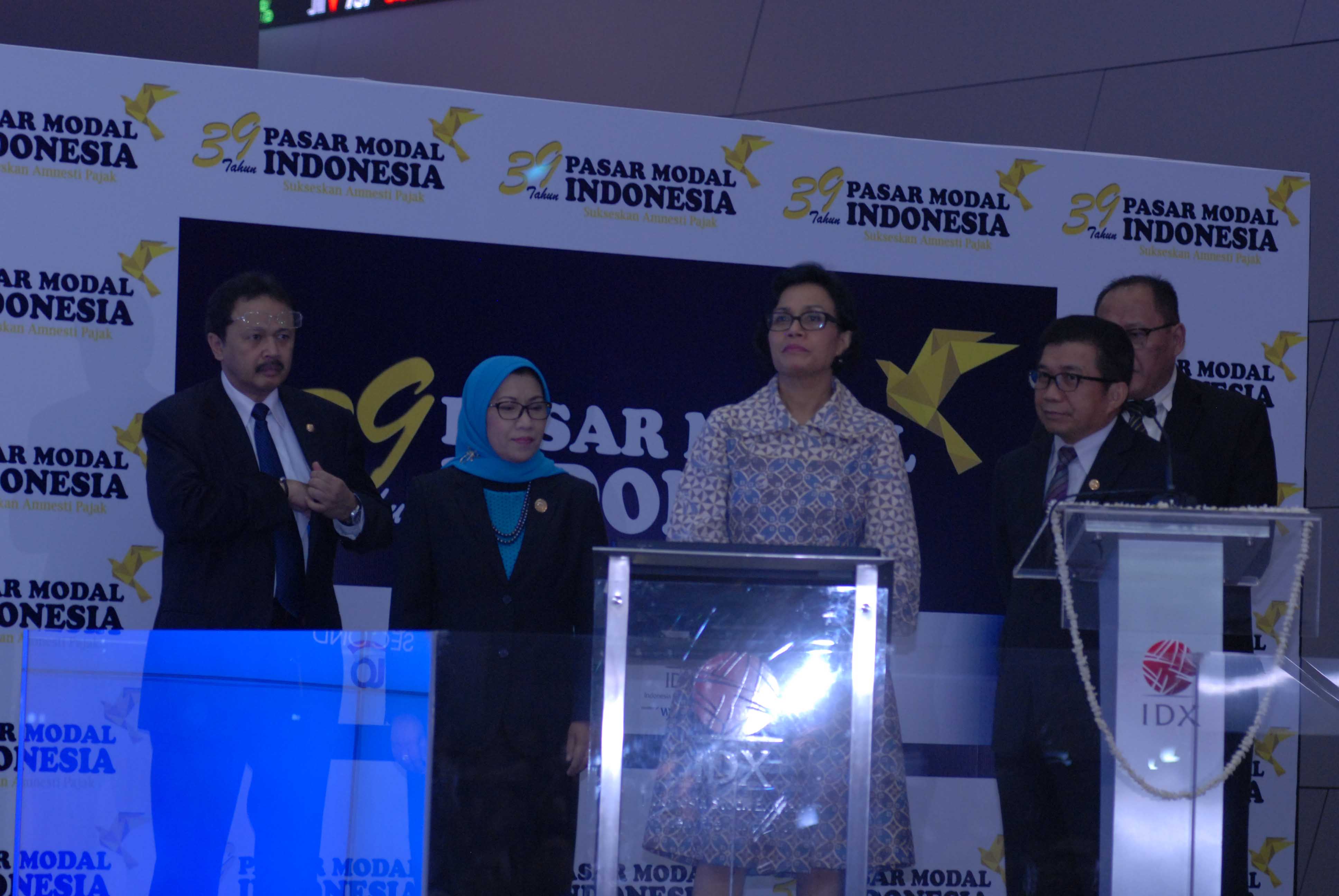 Menteri Keuangan ,Sri Mulayani Indrawati didampingi Dirut BEI, Tito Sulistio (kiri) dan Anggota Dewan Komisioner Otoritas Jasa Keuangan Merangkap Kepala Eksekutif Pengawas Pasar Modal, Nurhaida (kedua dari kiri) dan Ketua Dewan Komisioner OJK Muliaman D Hadad (kanan) saat membuka perdagangan saham sesi pagi di Main Hall, Gedung BEI, Jakarta, Rabu (10/8). Kegiatan tersebut dilakukan berkaitan dengan 39 Tahun diaktifkannya kembali Pasar Modal Indonesia.