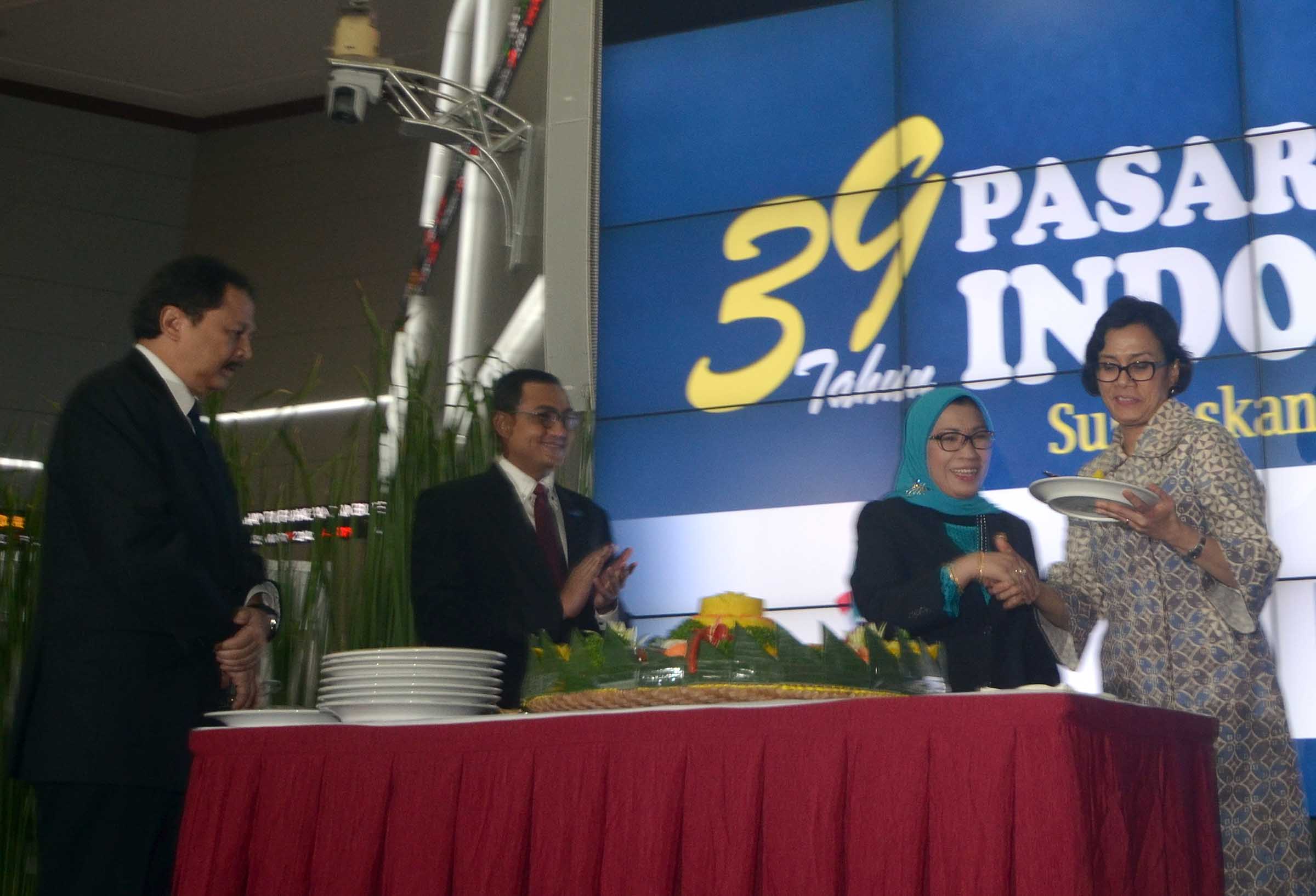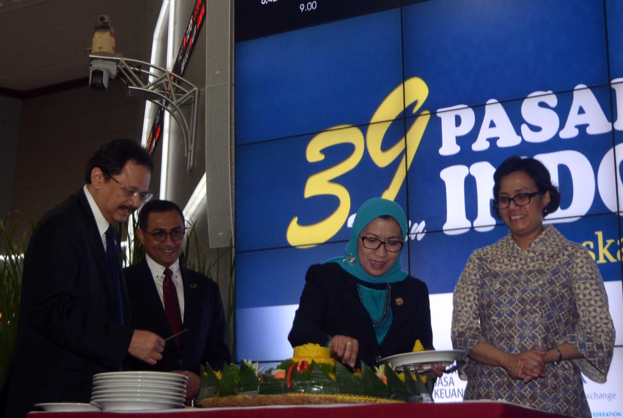 Anggota Dewan Komisioner Otoritas Jasa Keuangan Merangkap Kepala Eksekutif Pengawas Pasar Modal, Nurhaida (ketiga dari kiri) disaksikan Menteri Keuangan, Sri Mulyani Indrawati (kanan) dan Dirut BEI, Tito Sulistio (kiri) , serta Dirut KPEI, Hasan Fawzi melakukan pemotongan tumpeng yang akan diserahkan kepada Menkeu disela Peringatan HUT ke 39 Tahun Pasar Modal Indonesia di Main Hall, Gedung BEI, Jakarta, Rabu (10/8).