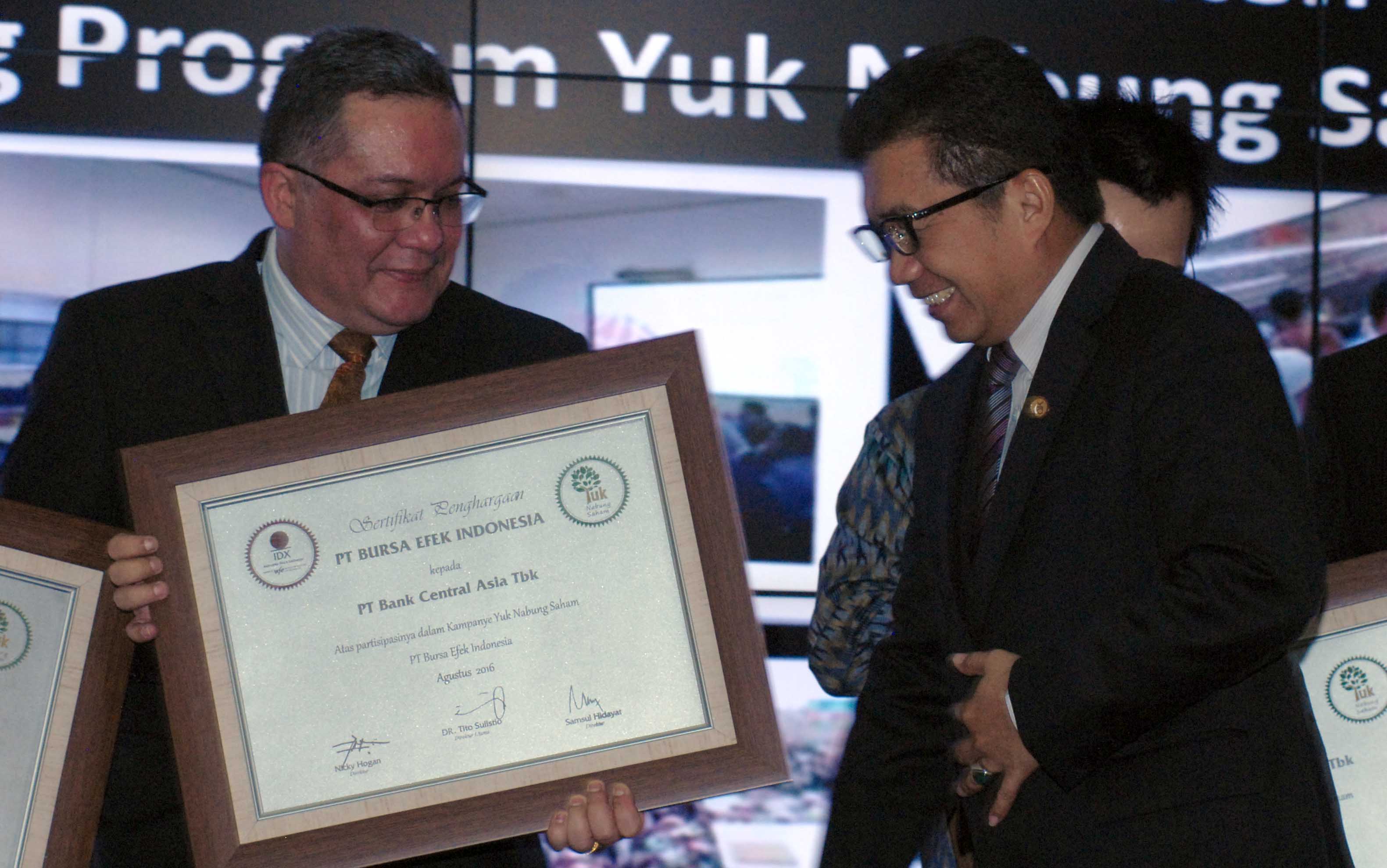 Ketua Dewan Komisioner OJK Muliaman D Hadad (kanan) menyerahkan penghargaan atas komitmen BCA dalam mendukung program kampanye ” Yuk Nabung Saham ” kepada Kepala Divisi Tresuri PT Bank Central Asia Tbk (BCA), Branko Windoe di Main Hall, Gedung BEI, Jakarta, Rabu (10/8) pada acara HUT ke 39 Pasar Modal Indonesia . Dukungan BCA pada kampanye ini diwujudnyatakan dengan mendorong dan memfasilitasi karyawan menjadi investor saham melalui pembelian saham di Bursa Efek Indonesia
