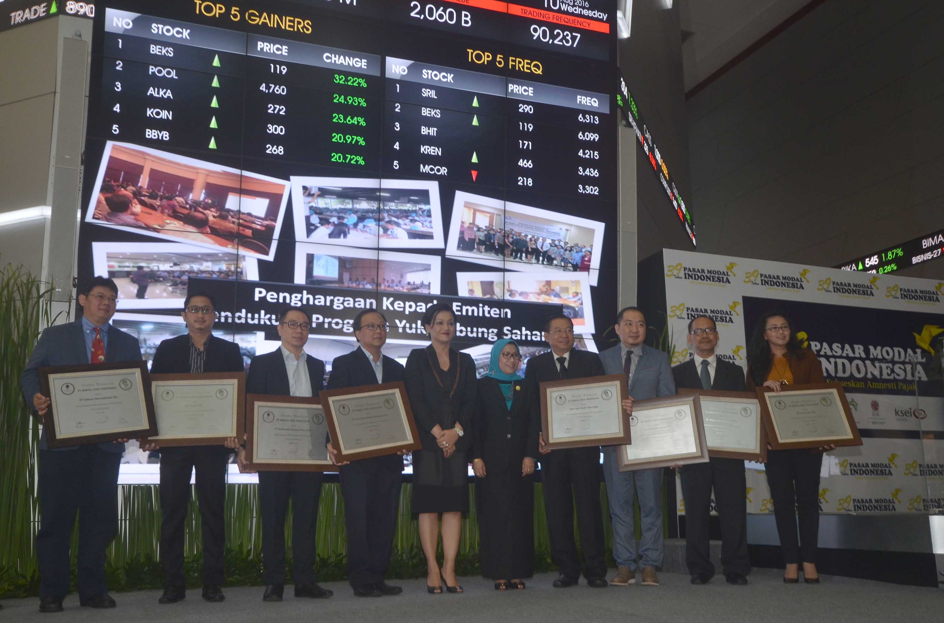 Anggota Dewan Komisioner Otoritas Jasa Keuangan Merangkap Kepala Eksekutif Pengawas Pasar Modal, Nurhaida (kelima dari kanan) bersama Dirut KSEI, Frederica Widyasari (kelima dari kiri) berfoto bersama dengan para peneriama penghargaan dalam mendukung program kampanye ” Yuk Nabung Saham ” di Main Hall, Gedung BEI, Jakarta, Rabu (10/8).Kegiatan tersebut dilakukan berkaitan dengan 39 Tahun diaktifkannya kembali Pasar Modal Indonesia.