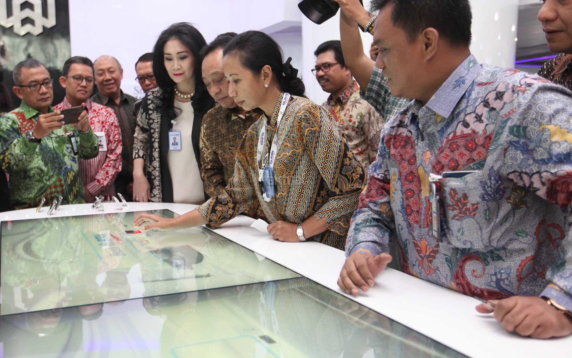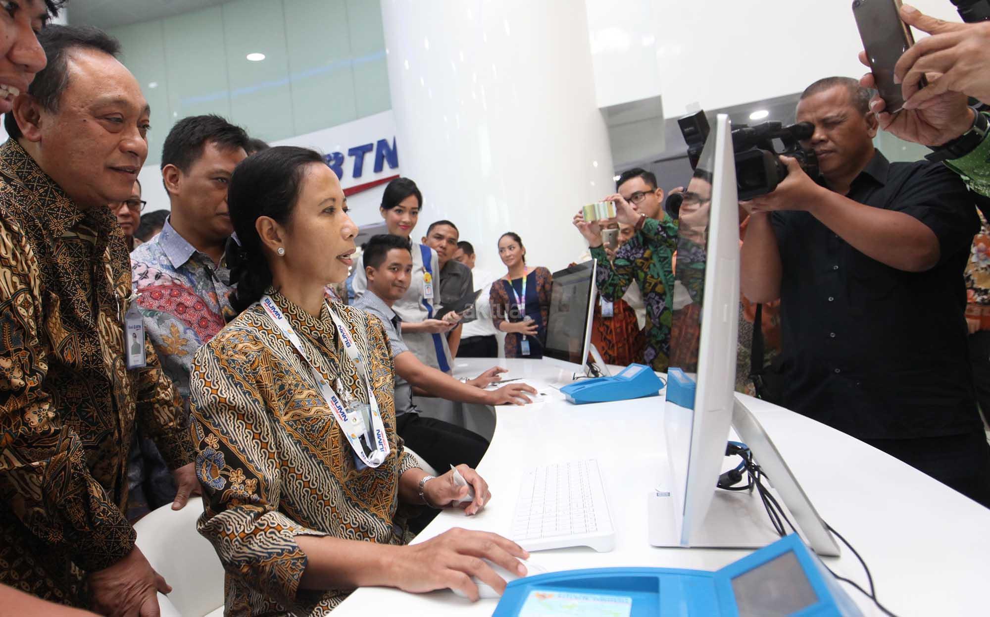 Menteri BUMN Rini M Soemarno (kedua dari kanan) bersama Direktur Utama BTN Maryono (ketiga dari kanan) mencoba mesin digital yang berada di ruang Smart Branch Bank BTN kantor Cabang Harmoni saat peresmian di Jakarta, Kamis (9/2). Peresmian Smart Branch yang dilakukan dalam rangka HUT ke-67 Bank BTN tersebut untuk memberikan fasilitas baru bagi nasabah dalam mengakses layanan perbankan seperti pembukaan rekening, transaksi perbankan hingga pengajuan pembiayaan. AKTUAL/Eko S Hilman