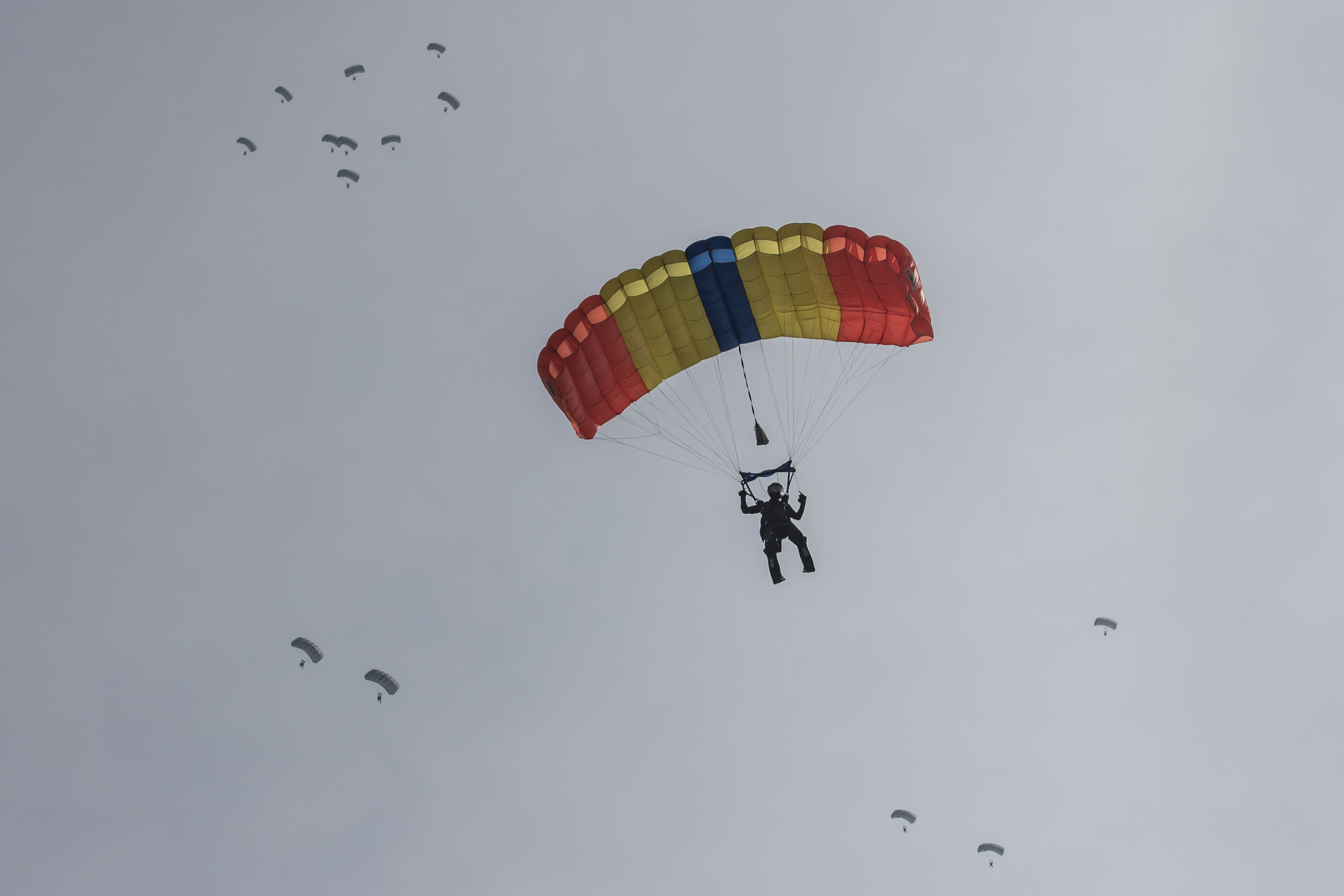 Pasukan Khas TNI AU melakukan simulasi pembebasan sandera dalam upacara HUT Ke-70 TNI AU di Pangkalan Udara Halim Perdanakusuma, Jakarta, Sabtu (9/4). Acara tersebut dimeriahkan dengan demo atraksi udara, terjun payung, marching band dan simulasi pembebasan sandera. ANTARA FOTO/Sigid Kurniawan/foc/16.