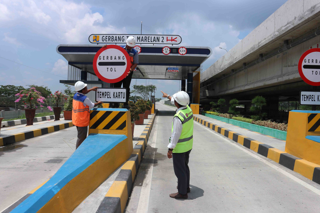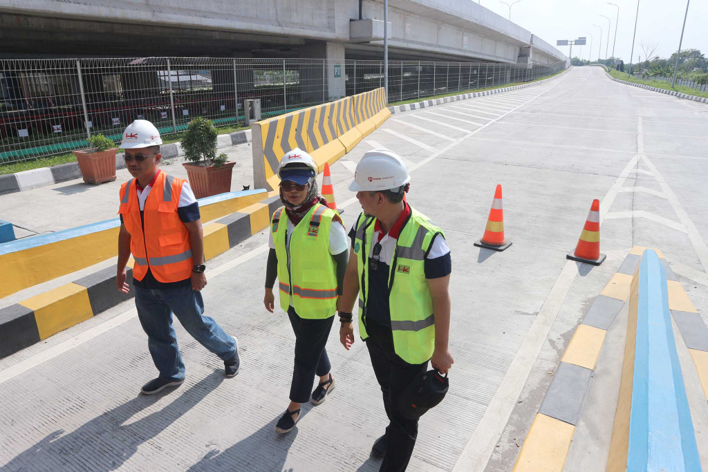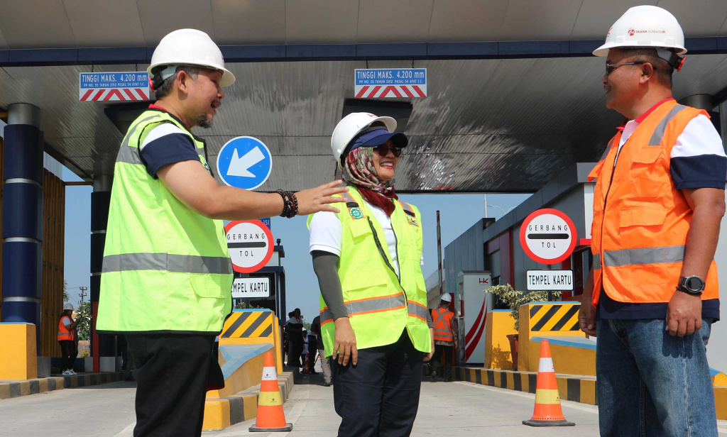 Anis Anjayani, Direktur Keuangan PT Hutama Karya (Persero) (tengah) bersama Direktur Perumusan Kebijakan dan Evaluasi Kemen PUPR Herry Trisaputra Zuna (kanan) dan Direktur Pengelolaan Risiko Keuangan Negara, Direktorat Jenderal Pengelolaan Pembiayaan dan Risiko, Kemenkeu Brahmantio Isdijoso (kiri) meninjau Jalan Tol Medan - Binjai seksi I di Deli Serdang, Sumatera Utara, Rabu (6/3/2019). Jalan Tol sepanjang 2700 Km yang ditargetkan akan rampung ditahun 2024 dimana saat ini PT Hutama Karya (Persero) (HK) sudah selesai membangun 180 Km termasuk 140 Km Bakauheni - Terbanggi Besar, Lampung yang akan di resmikan oleh presiden Joko Widodo Jumat, 8 maret 2019. AKTUAL/STR-Eko S Hilman