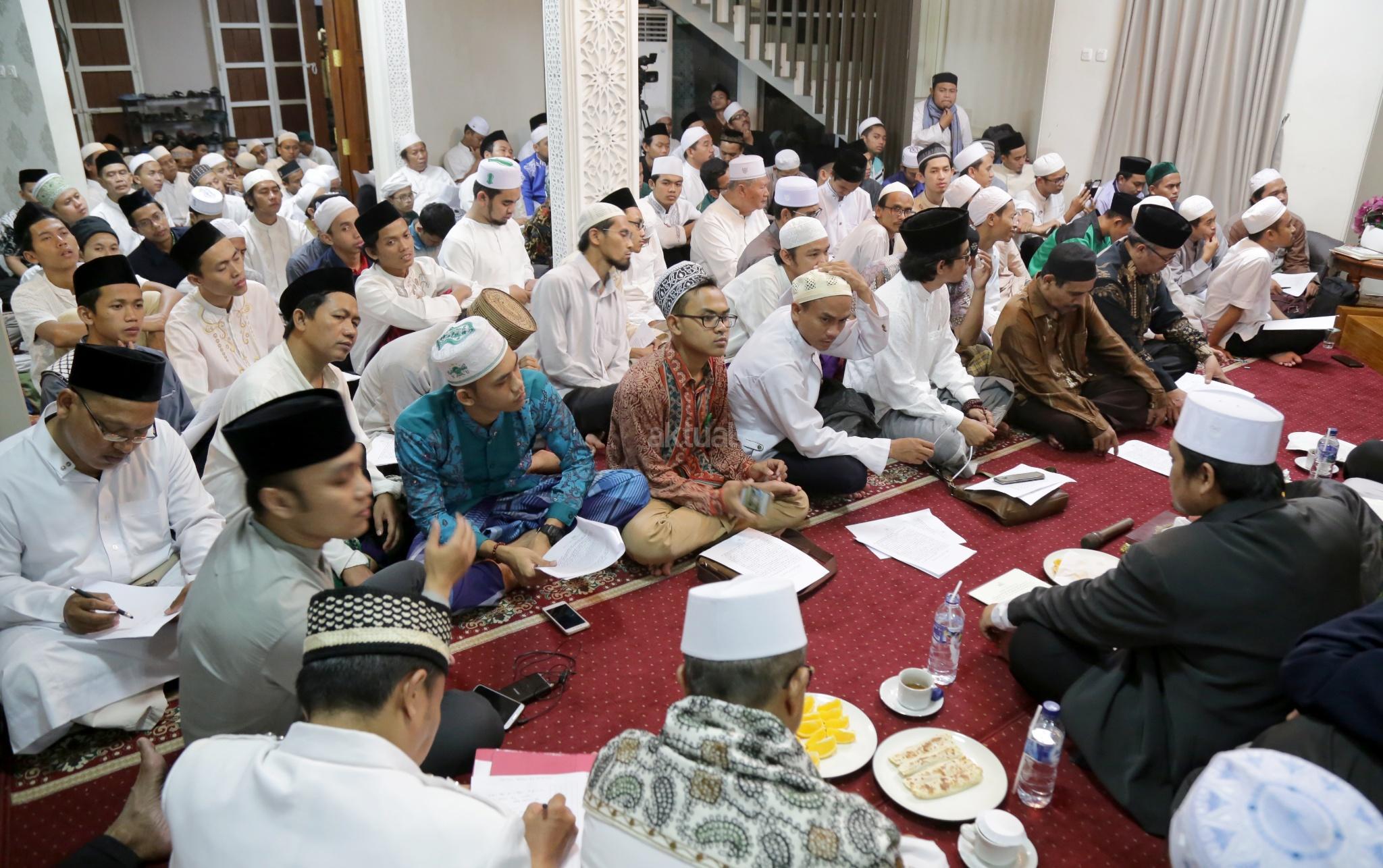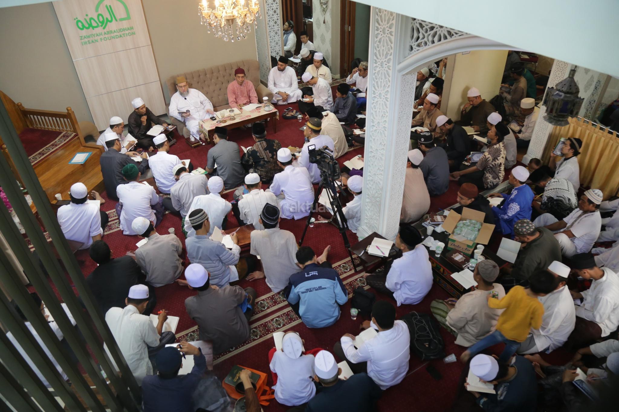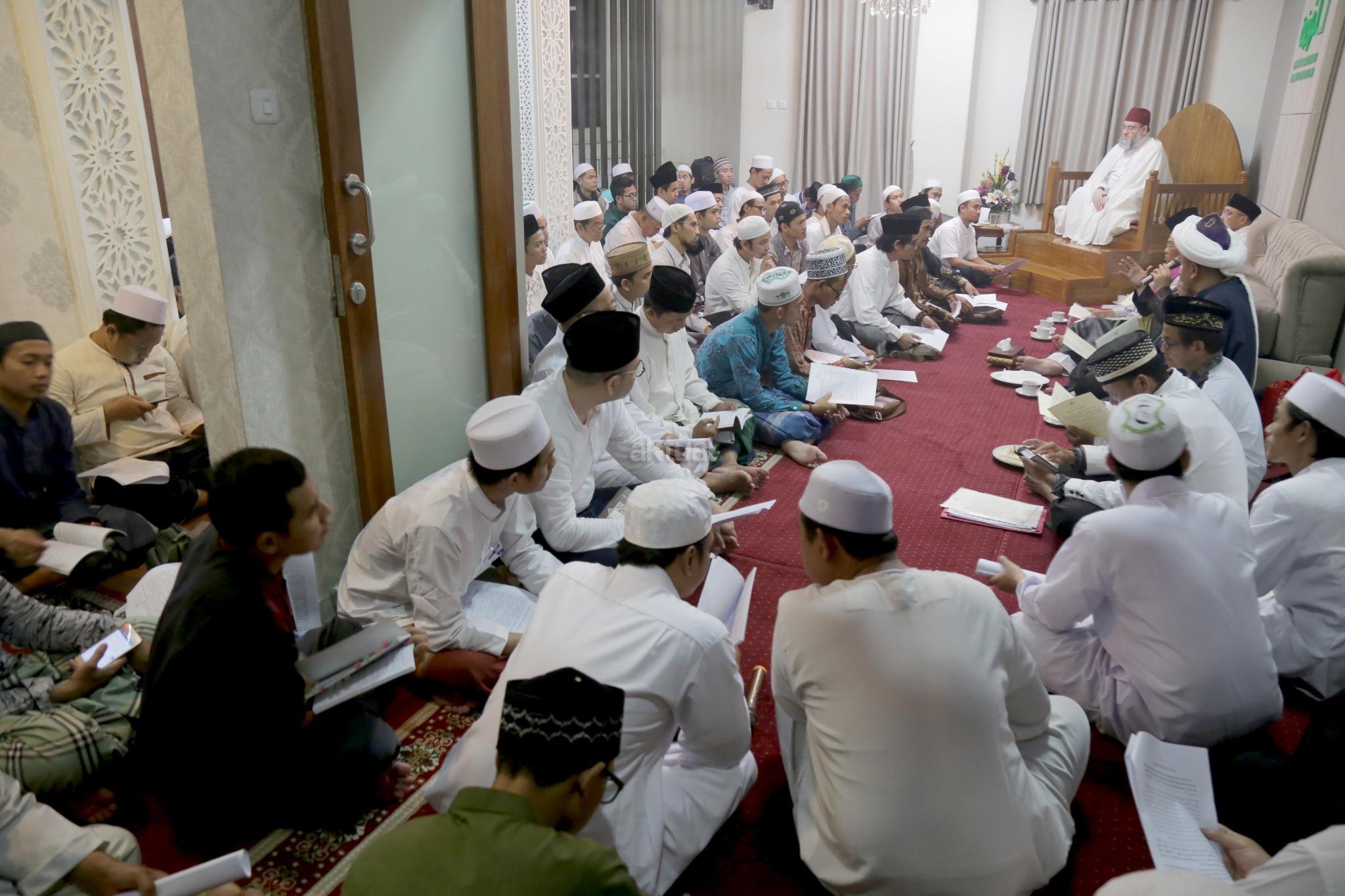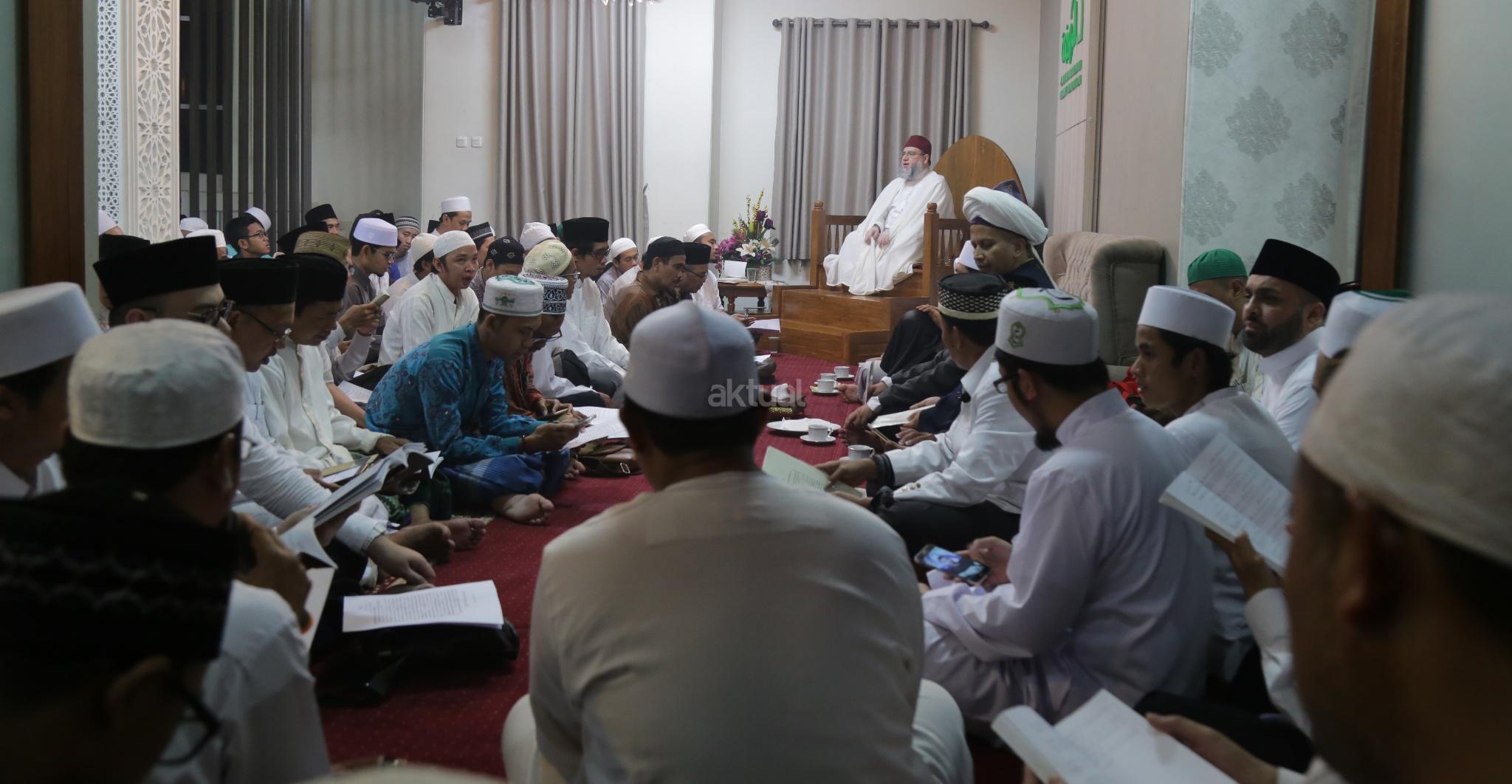 Suasana acara tajuk Malam Ijazah dan Mujahadah Kubro, JATMAN DKI di Zawiyah Arraudhah, Tebet, Jakarta Selatan, Minggu (29/4/18). Acara ini diisi dengan taushiyah dan pemberian ijazah kepada jemaah Majelis Ilmu Bulan Sya’ban. JATMAN DKI Jakarta mengelar acara Kajian Rutin Hadits Sunan Tirmidzi oleh KH. Ahmad Marwazie. Diikuti hampir seratus orang jamaah, acara hanya dijeda ishoma lalu dilanjut Pembacaan Khataman Kitab Hadist Arbaun Buldaniyah karya Syekh Yasin Fadani oleh Syeikh Dr. Yahya bin Abdurrazaq Ghoutsani, MA dan khotmil Qur’an jama’i. Ba’da Maghrib, Mudir Wustho DKI, KH. Muhammad Danial Nafis, M.Si memandu dzikir asasi/mujahadah. AKTUAL/Tino Oktaviano