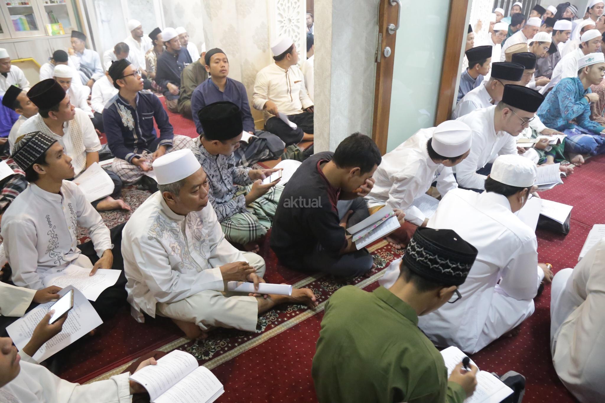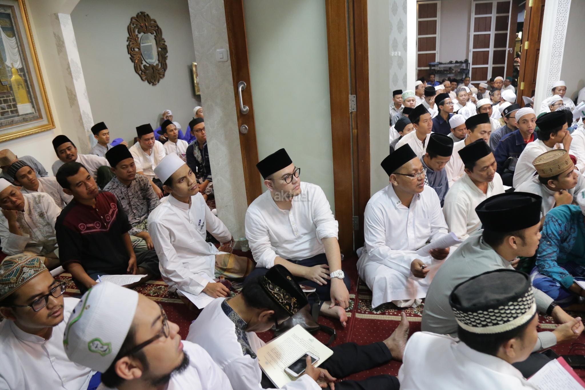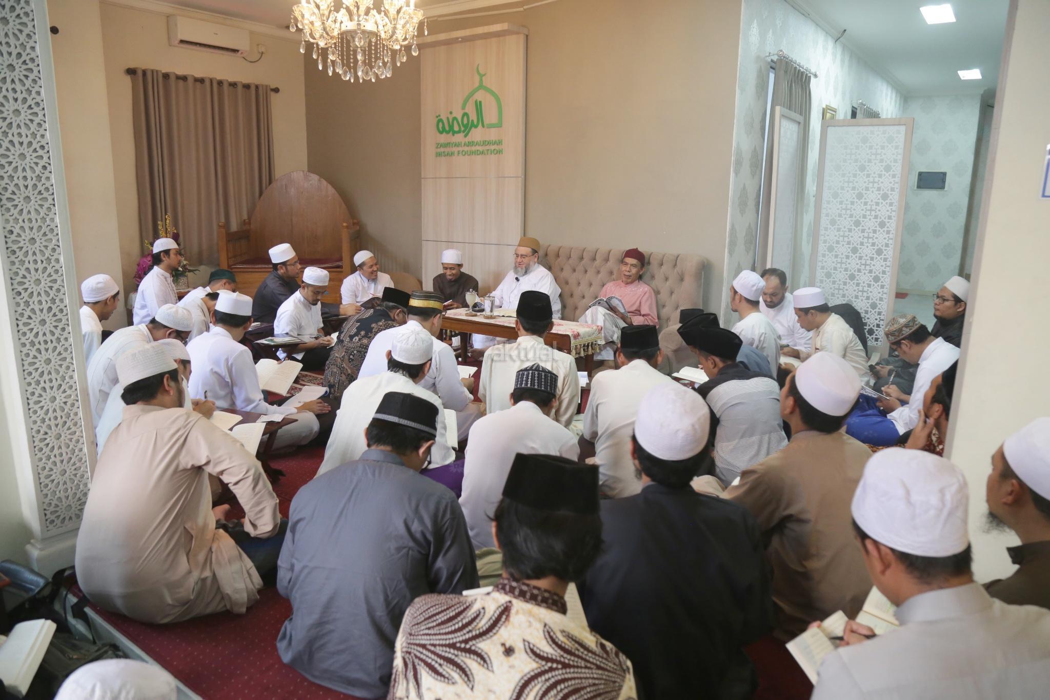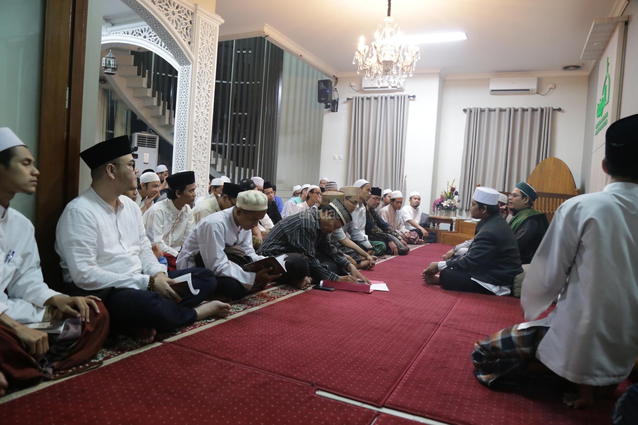 Suasana acara tajuk Malam Ijazah dan Mujahadah Kubro, JATMAN DKI di Zawiyah Arraudhah, Tebet, Jakarta Selatan, Minggu (29/4/18). Acara ini diisi dengan taushiyah dan pemberian ijazah kepada jemaah Majelis Ilmu Bulan Sya’ban. JATMAN DKI Jakarta mengelar acara Kajian Rutin Hadits Sunan Tirmidzi oleh KH. Ahmad Marwazie. Diikuti hampir seratus orang jamaah, acara hanya dijeda ishoma lalu dilanjut Pembacaan Khataman Kitab Hadist Arbaun Buldaniyah karya Syekh Yasin Fadani oleh Syeikh Dr. Yahya bin Abdurrazaq Ghoutsani, MA dan khotmil Qur’an jama’i. Ba’da Maghrib, Mudir Wustho DKI, KH. Muhammad Danial Nafis, M.Si memandu dzikir asasi/mujahadah. AKTUAL/Tino Oktaviano