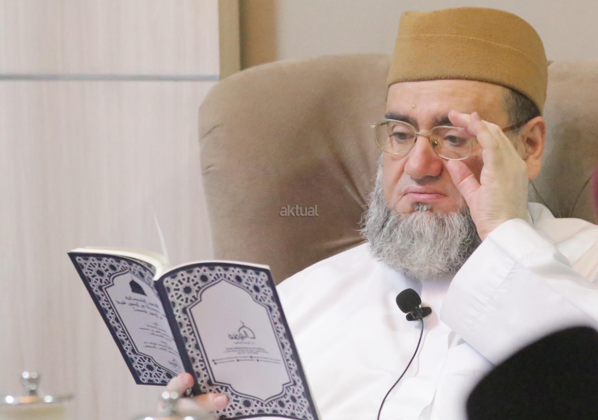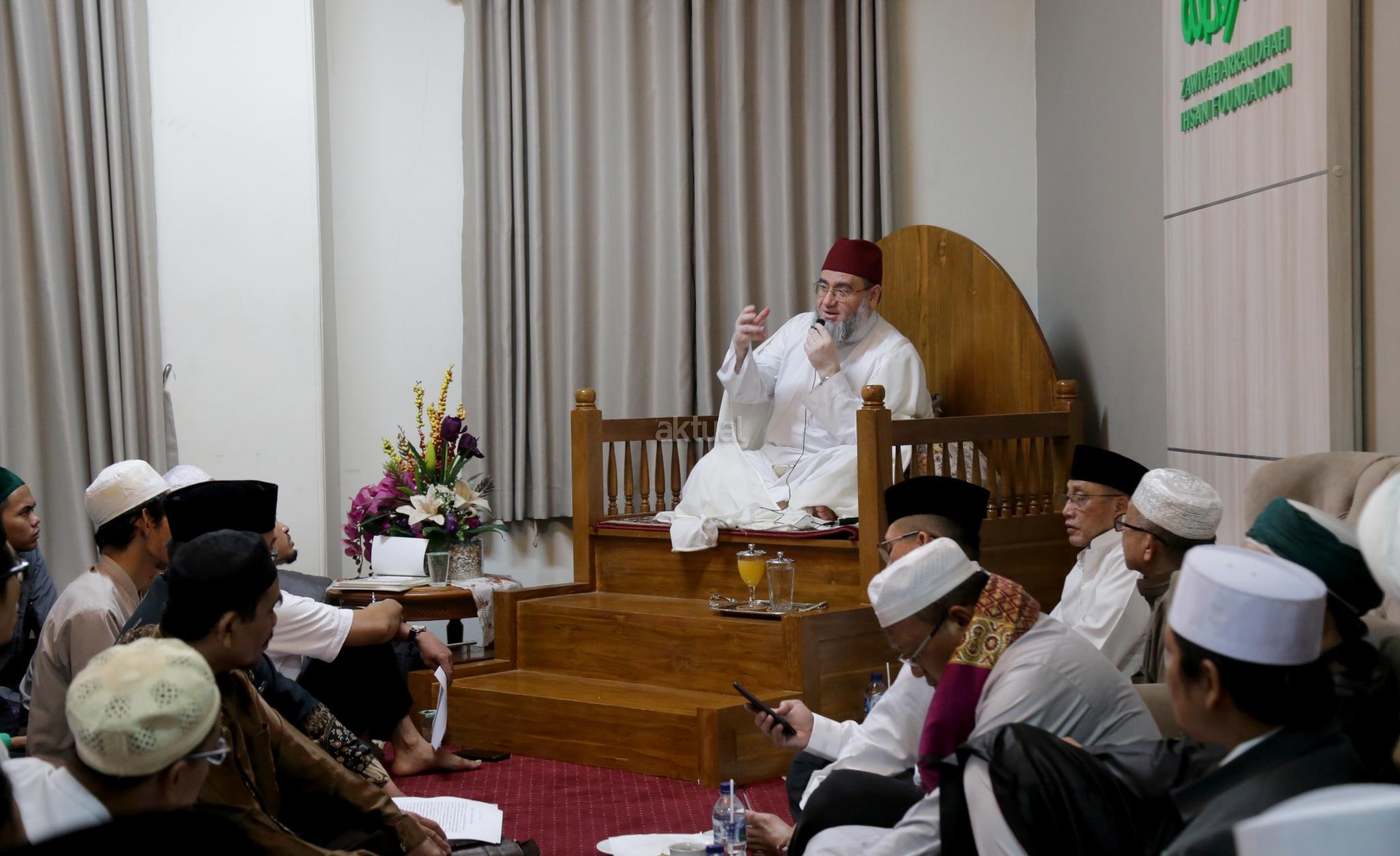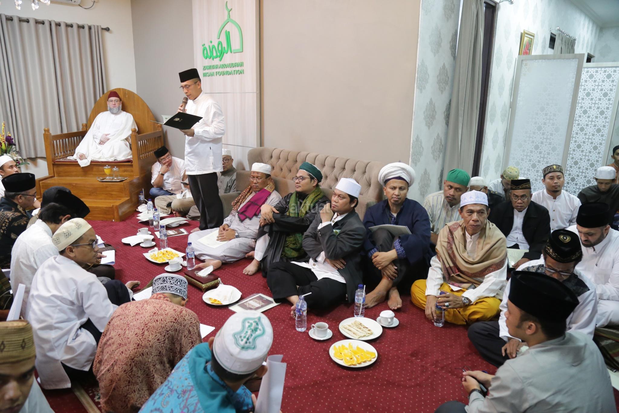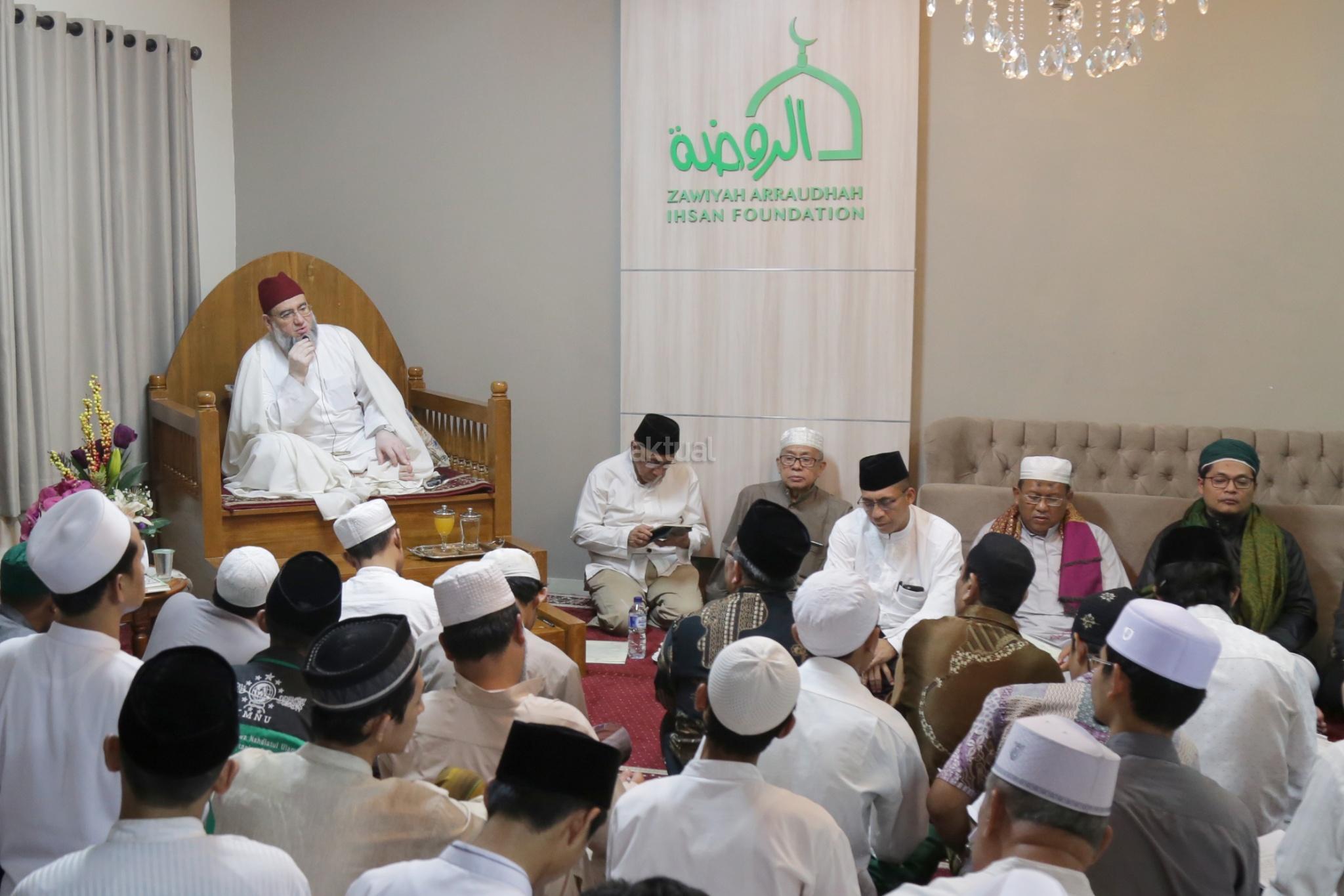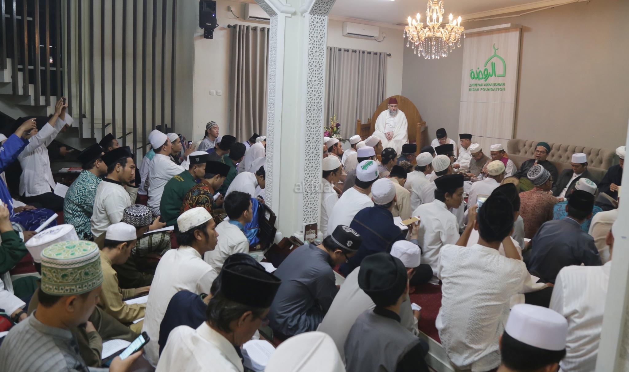 Ulama dari Madinah Munawarah Syekh Dr. Yahya bin Abdurrazaq Ghoutsani memberikan tausiyah saat acara tajuk Malam Ijazah dan Mujahadah Kubro, Ahad, di Zawiyah Arraudhah, Tebet, Jakarta Selatan Minggu (29/4/18).