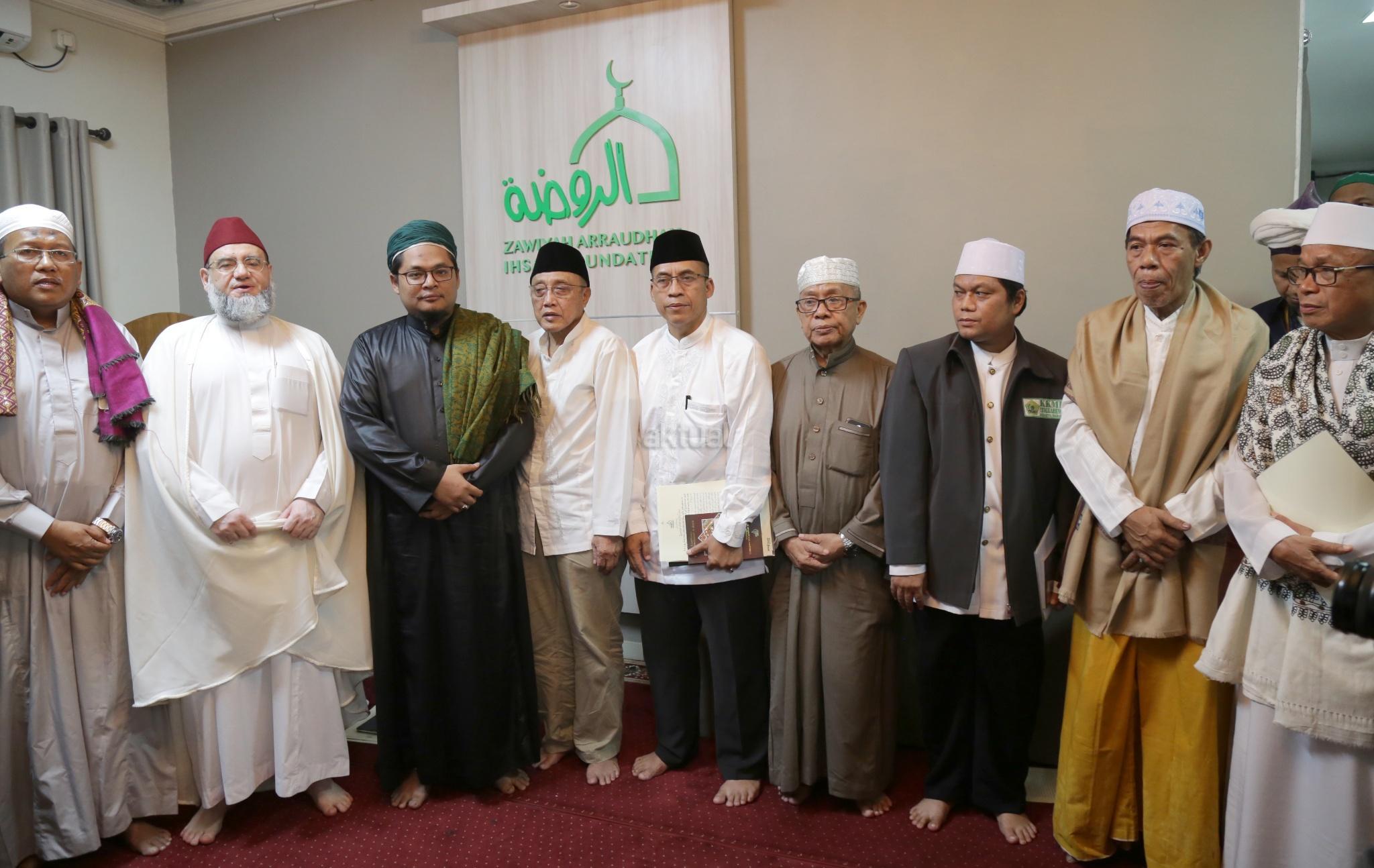 Ulama dari Madinah Munawarah Syekh Dr. Yahya bin Abdurrazaq Ghoutsani dan Mudir Idaroh Wusthi Jamiyyah Ahlith Thoriqoh Al Mu’tabarah An Nahdliyyah (JATMAN) DKI Jakarta KH Muhammad Danial Nafis, didampingi undangan dan perwakilan Jamiyyah Ahlith Thoriqoh foto bersama usai acara tajuk Malam Ijazah dan Mujahadah Kubro, JATMAN DKI di Zawiyah Arraudhah, Tebet, Jakarta Selatan, Minggu (29/4/18).