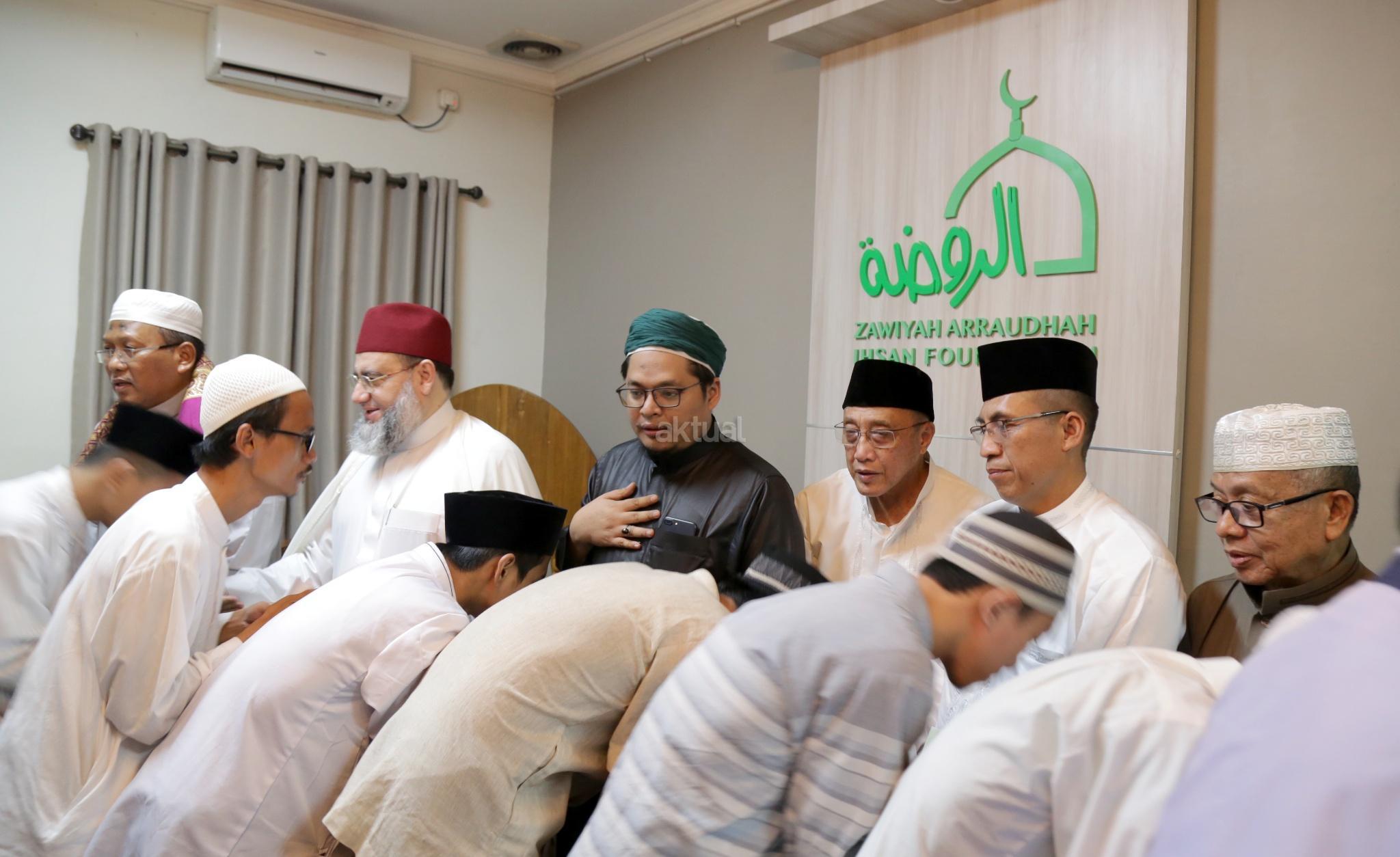 Ulama dari Madinah Munawarah Syekh Dr. Yahya bin Abdurrazaq Ghoutsani dan Mudir Idaroh Wusthi Jamiyyah Ahlith Thoriqoh Al Mu’tabarah An Nahdliyyah (JATMAN) DKI Jakarta KH Muhammad Danial Nafis, didampingi undangan dan perwakilan Jamiyyah Ahlith Thoriqoh bersalaman usai acara tajuk Malam Ijazah dan Mujahadah Kubro, JATMAN DKI di Zawiyah Arraudhah, Tebet, Jakarta Selatan, Minggu (29/4/18).