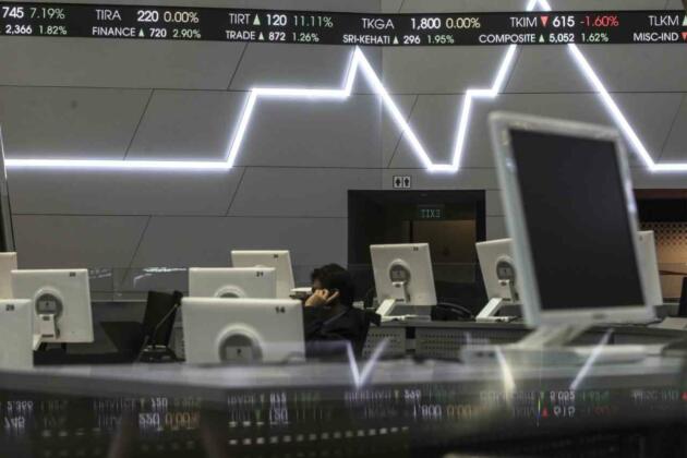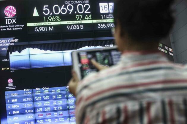 Karyawan mengamati pergerakan Indeks Harga Saham Gabungan (IHSG) di Bursa Efek Indonesia, Jakarta, Senin (11/7). Setelah sepekan libur Lebaran, Indeks Harga Saham Gabungan melesat di hari pertama perdagangan. Indeks ditutup menguat 1,96% menjadi 5.069,02 dengan volume transaksi sebesar 6,09 miliar saham dan nilai transaksi mencapai Rp 9,18 triliun. ANTARA FOTO/Muhammad Adimaja/foc/16.