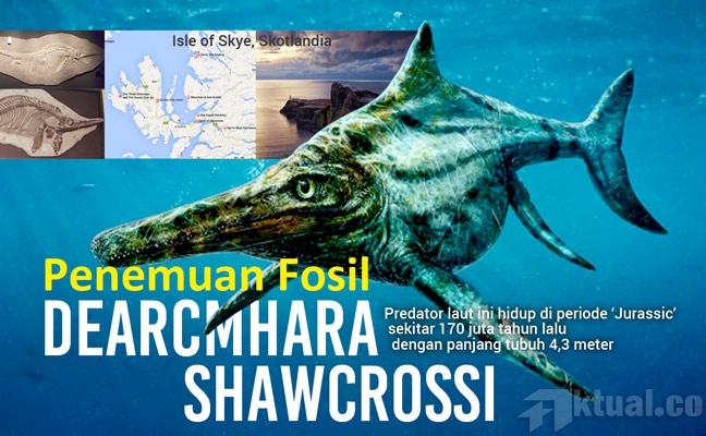 Makhluk bernama “Dearcmhara shawcrossi”, merupakan anggota dari kelompok spesies Ichthyosaurus dari jenis reptil laut yang begitu dominan, sama seperti Dinosaurus yang menguasai daratan. Ichthyosaurus, beberapa jenis diantaranya menyerupai hewan yang sangat mengerikan, mengalahkan satwa ikan paus saat ini.