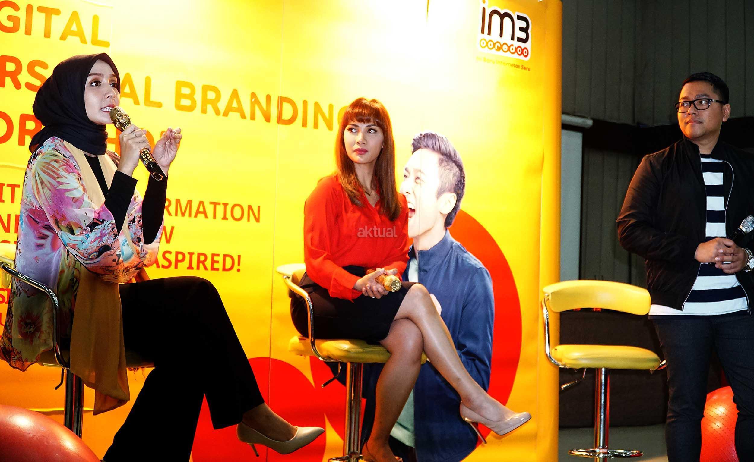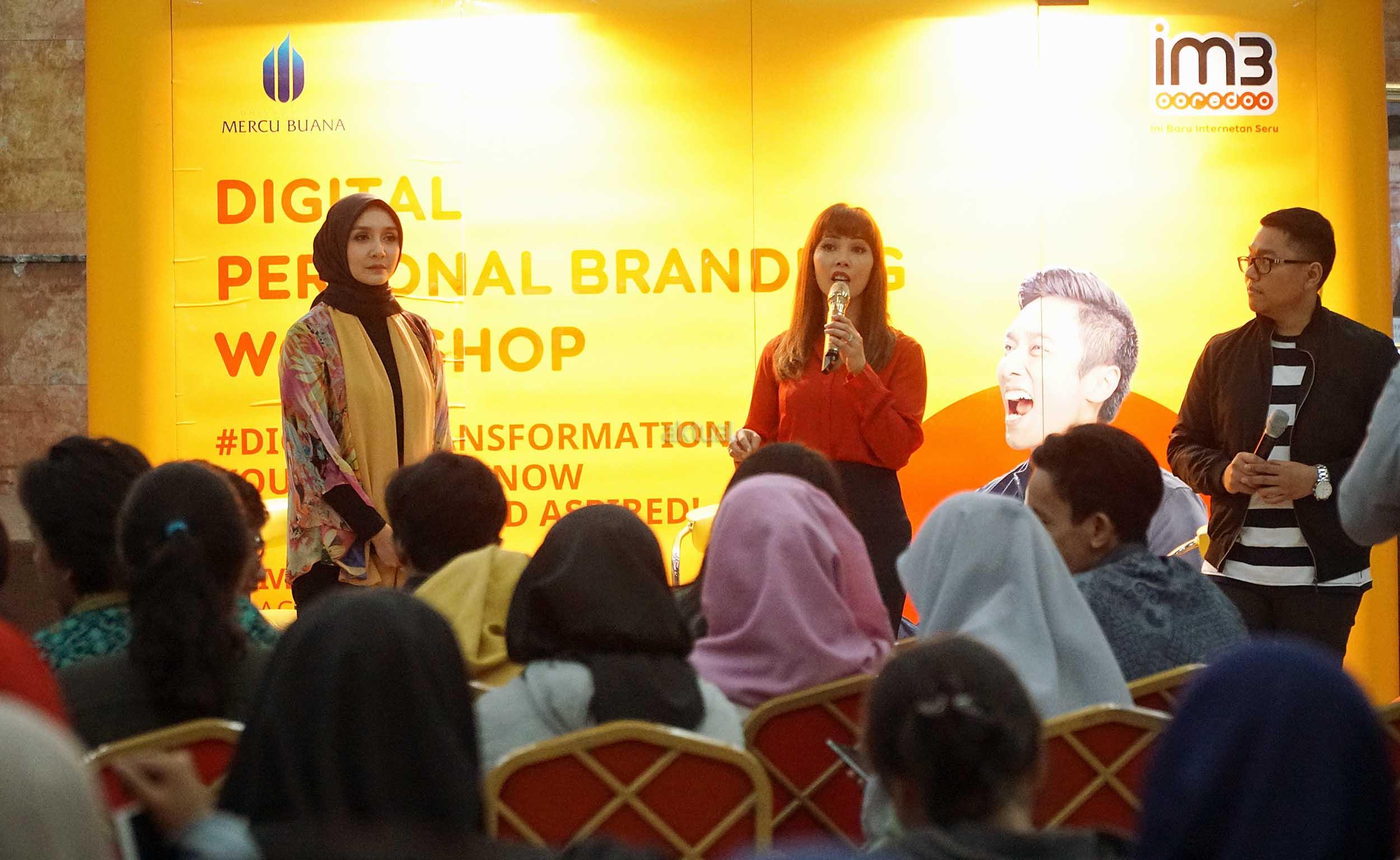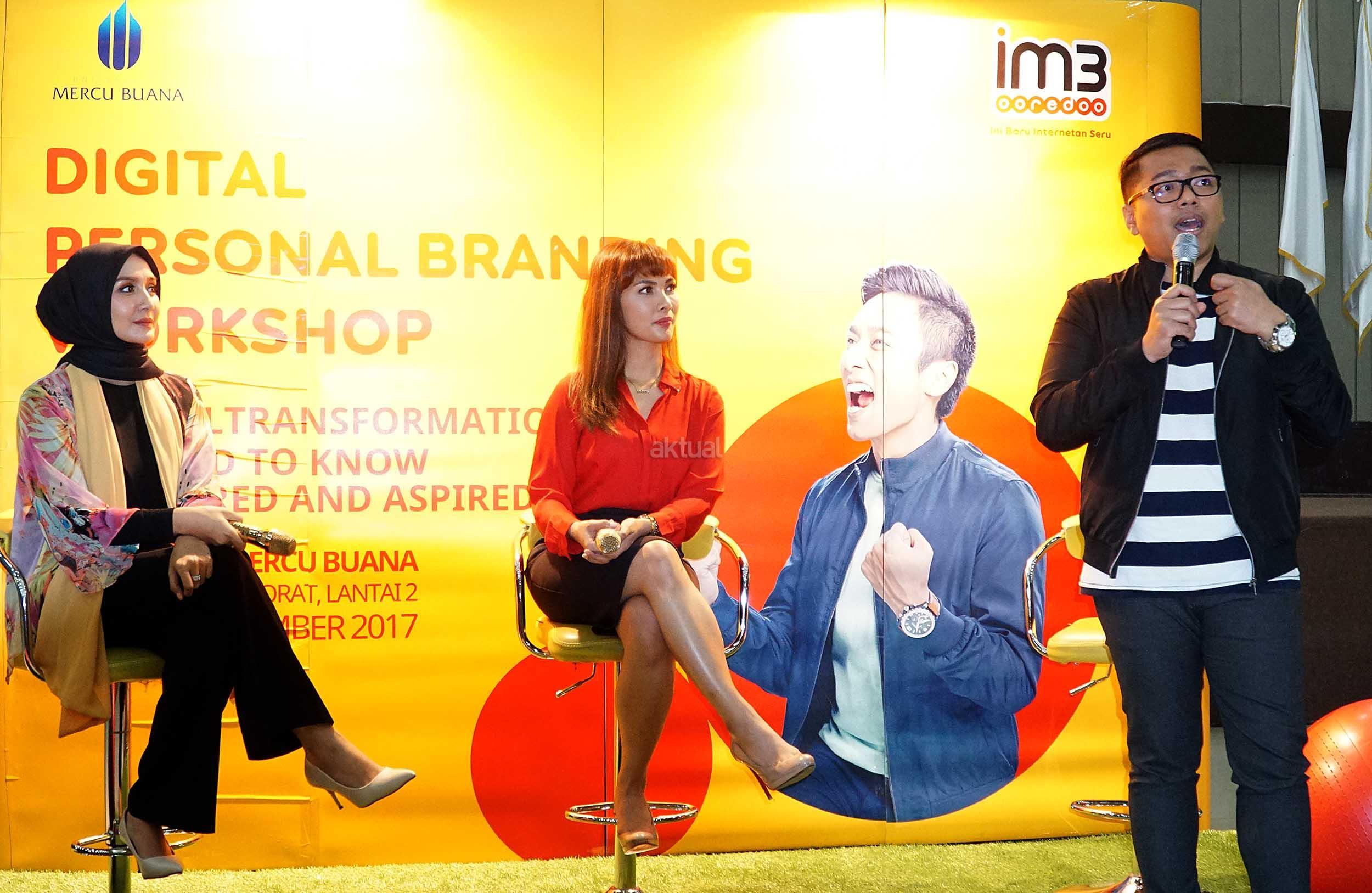 Head of Dept Non-Dig Media, PR & Internal Comm Indosat Ooredoo Romano Bhaktinegara (kanan) bersama Digital Endorser & TV Host, Nadia Mulya (tengah) serta Digital Endorser & Psycholist, Intan Erlita (kiri) saat menjawab pertanyaan peserta Workshop Digital Personal Branding di Universitas Mercubuana, Kamis (21/12/2017). IM3 Ooredoo menyadari bahwa era digital telah mengubah tingkah laku dan karakter masyarakat, sekaligus menciptakan generasi digital. AKTUAL/Eko S Hilman