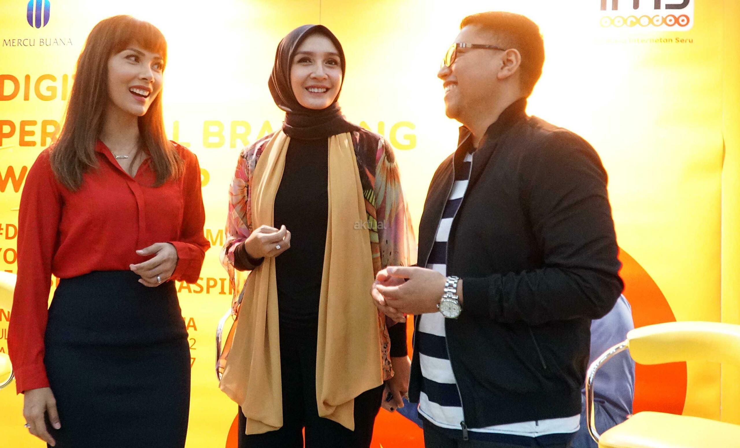 Head of Dept. Non-Dig. Media, PR & Internal Comm. Indosat Ooredoo Romano Bhaktinegara (kanan) berbincang dengan Digital Endorser & TV Host, Nadia Mulya (kiri) serta Digital Endorser & Psycholist, Intan Erlita (tengah) seusai Workshop Digital Personal Branding di Universitas Mercubuana, Kamis (21/12/2017). IM3 Ooredoo menyadari bahwa era digital telah mengubah tingkah laku dan karakter masyarakat, sekaligus menciptakan generasi digital. AKTUAL/Eko S Hilman