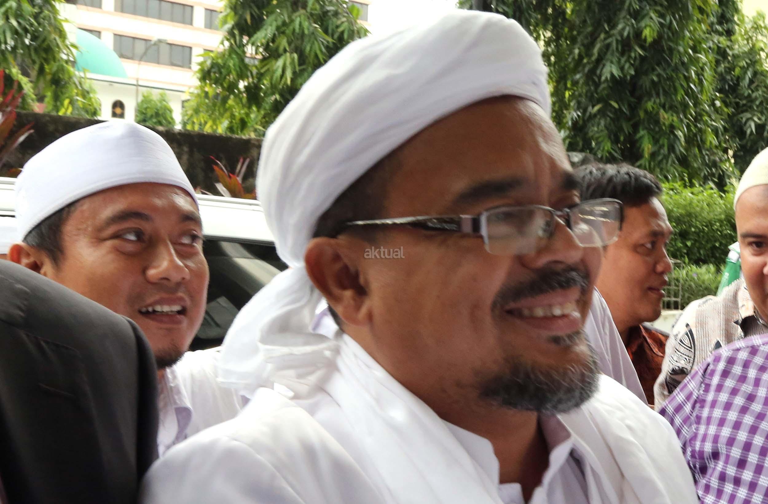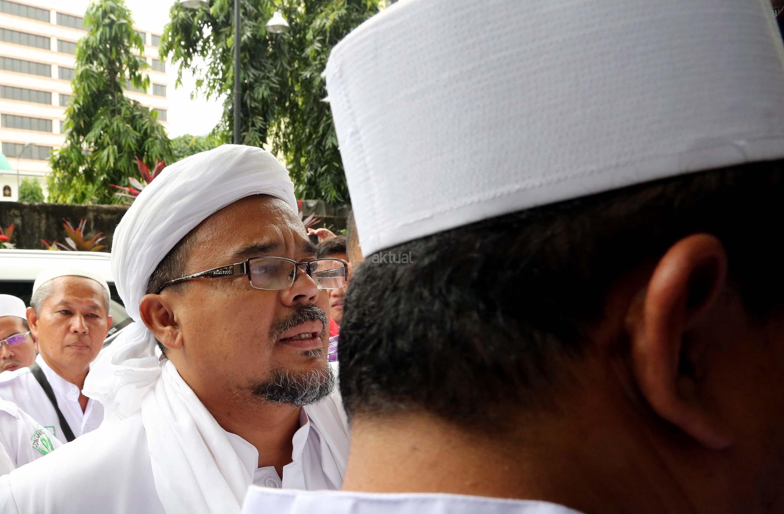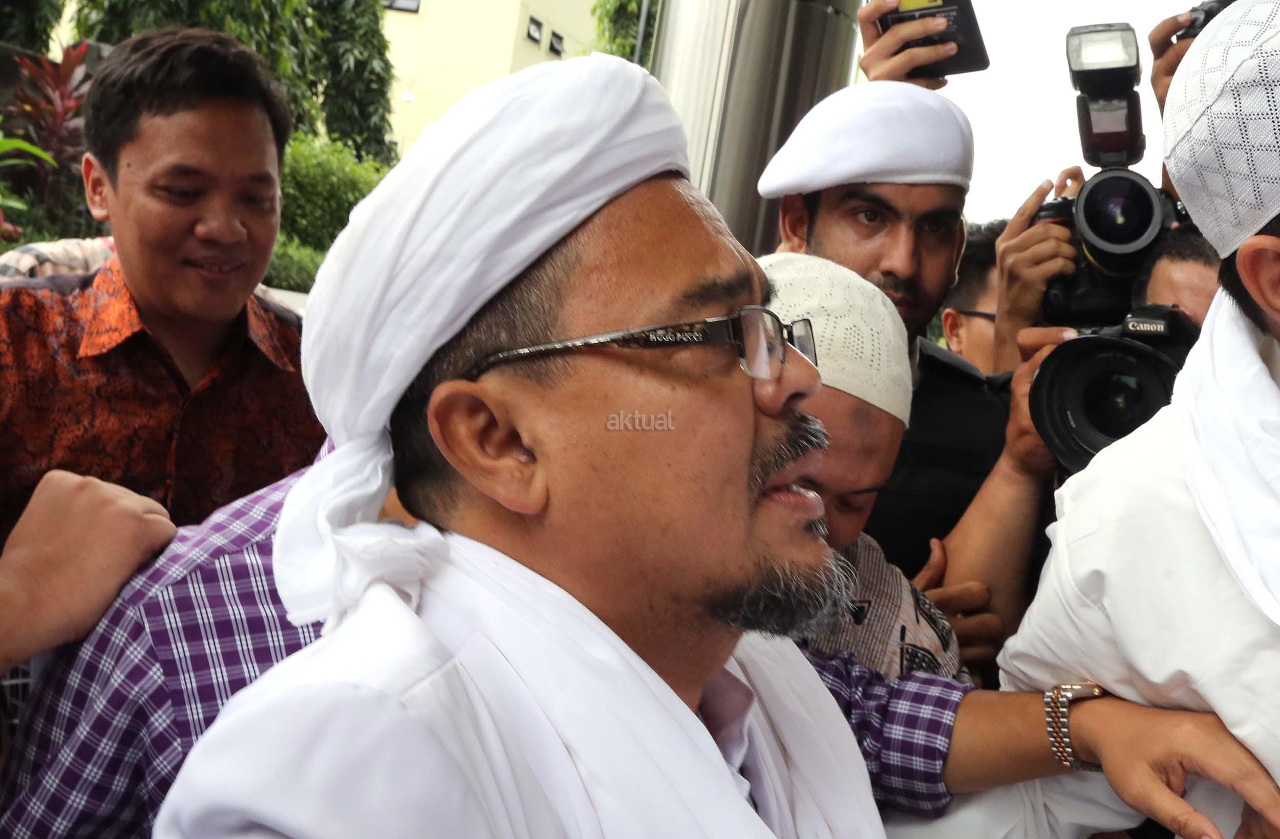 Imam Besar Front Pembela Islam (FPI) Rizieq Shihab (kanan) memenuhi panggilan Bareskrim Polri di Jakarta, Kamis (3/11/2016). Rizieq Shihab diperiksa sebagai saksi ahli agama dari pihak pelapor yaitu FPI DKI Jakarta terkait kasus dugaan penistaan agama yang dilakukan oleh Basuki Tjahaja Purnama. AKTUAL/Munzir