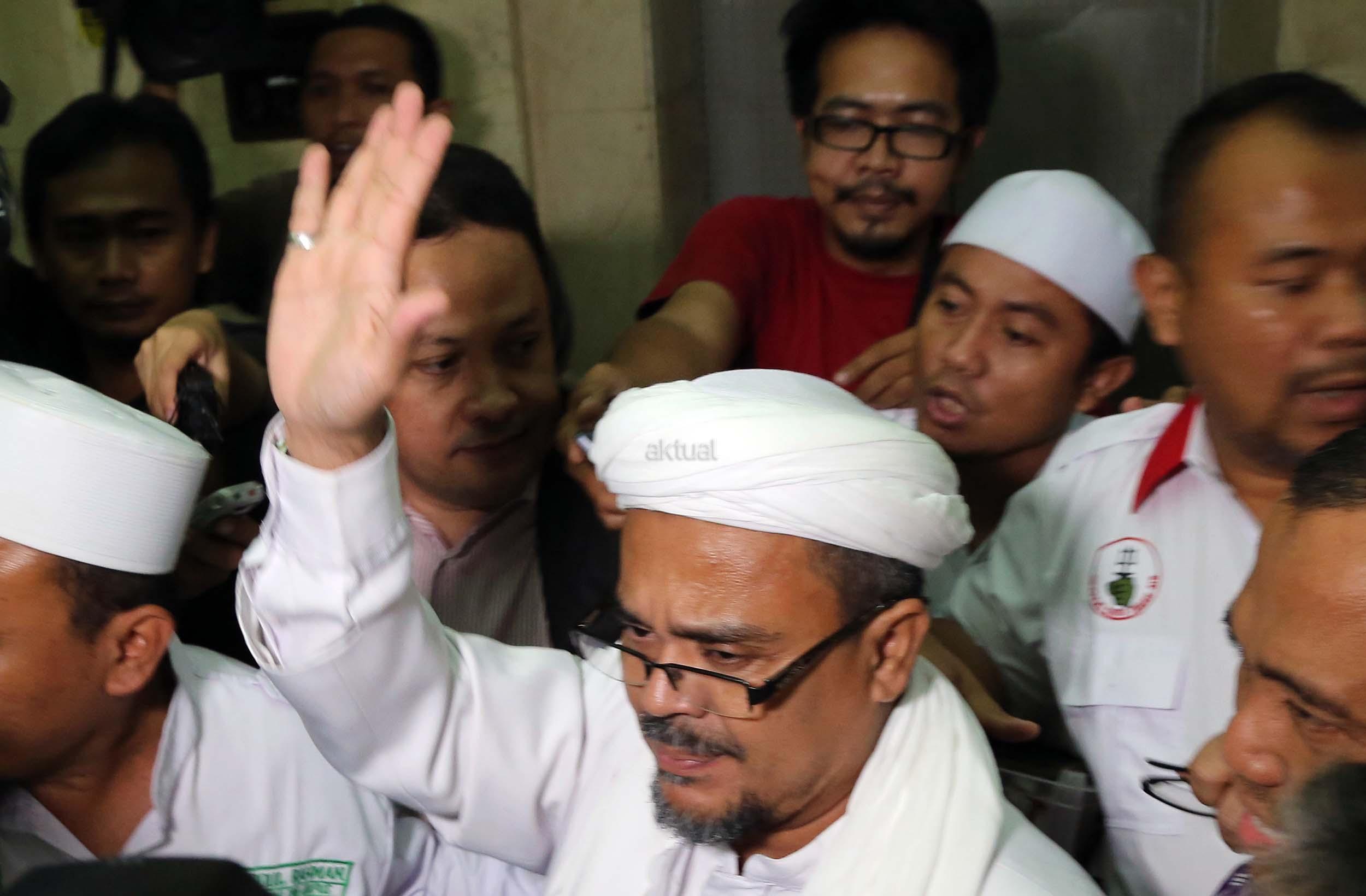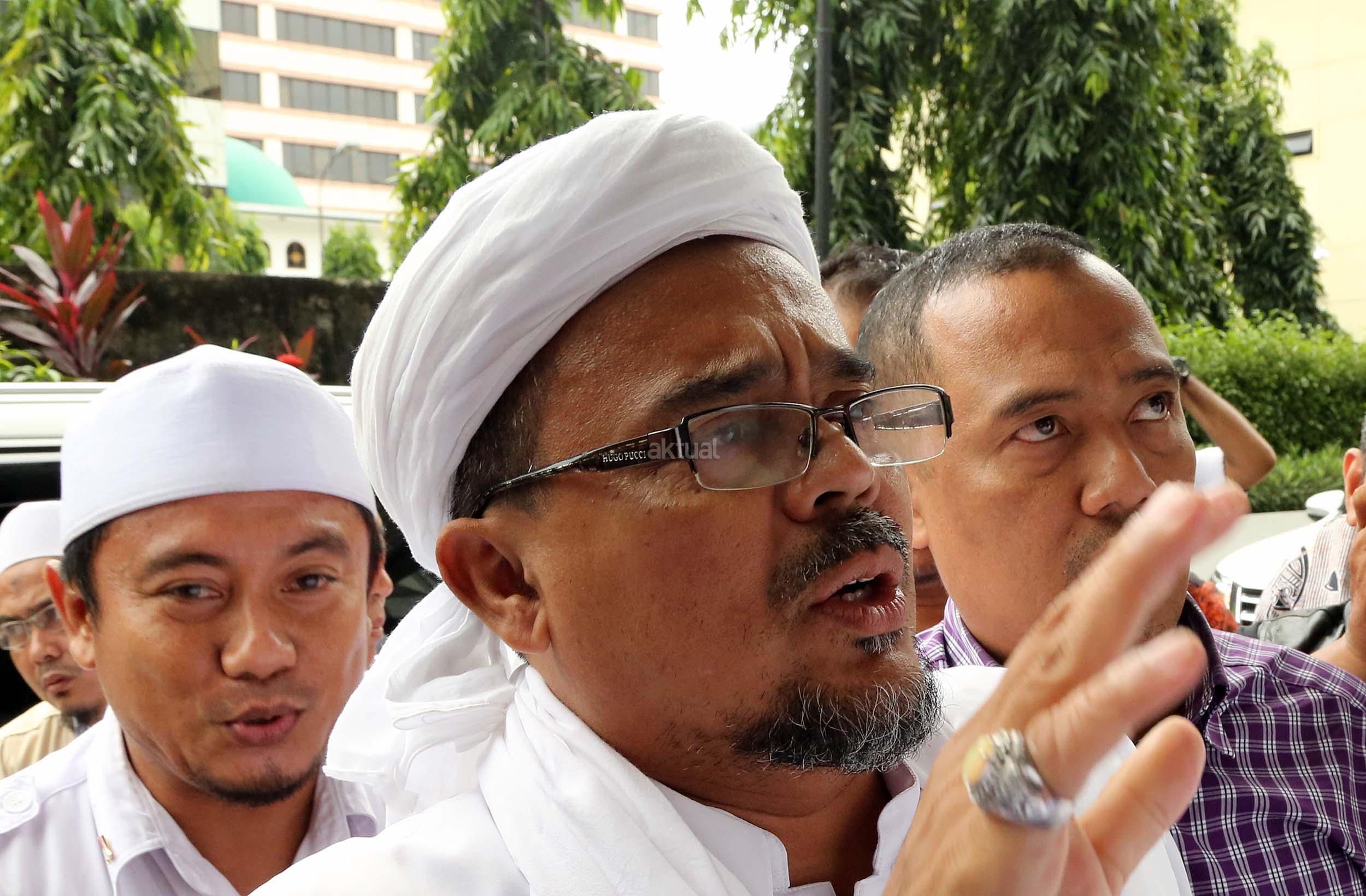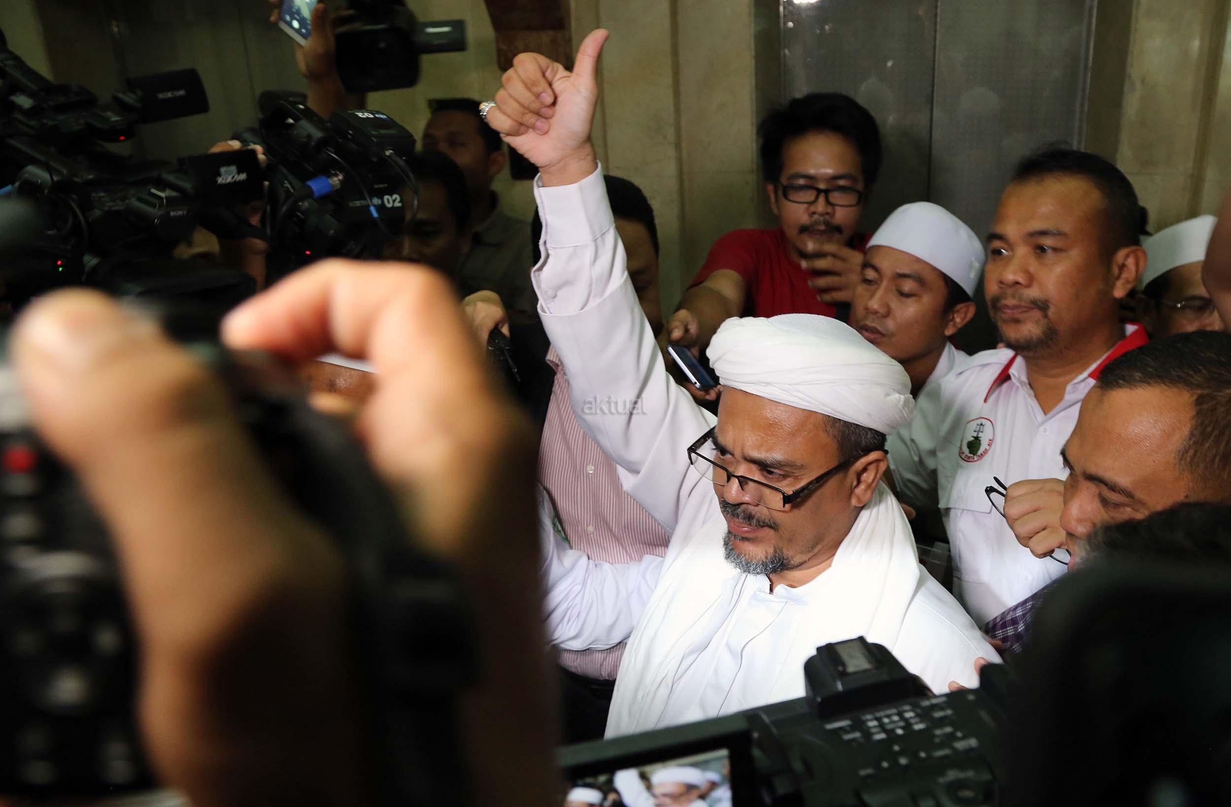 Imam Besar Front Pembela Islam (FPI) Rizieq Shihab (kanan) memenuhi panggilan Bareskrim Polri di Jakarta, Kamis (3/11/2016). Rizieq Shihab diperiksa sebagai saksi ahli agama dari pihak pelapor yaitu FPI DKI Jakarta terkait kasus dugaan penistaan agama yang dilakukan oleh Basuki Tjahaja Purnama. AKTUAL/Munzir