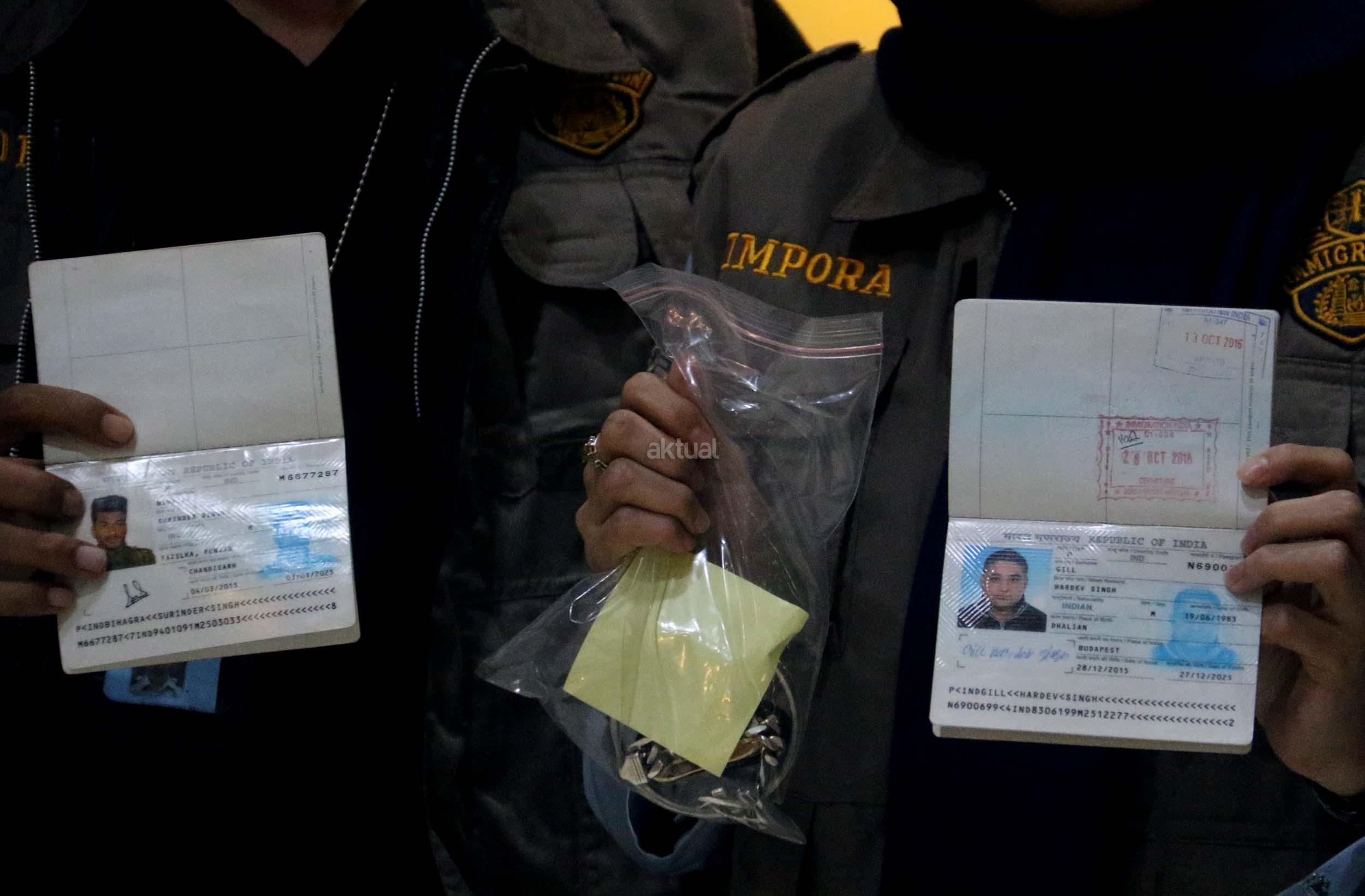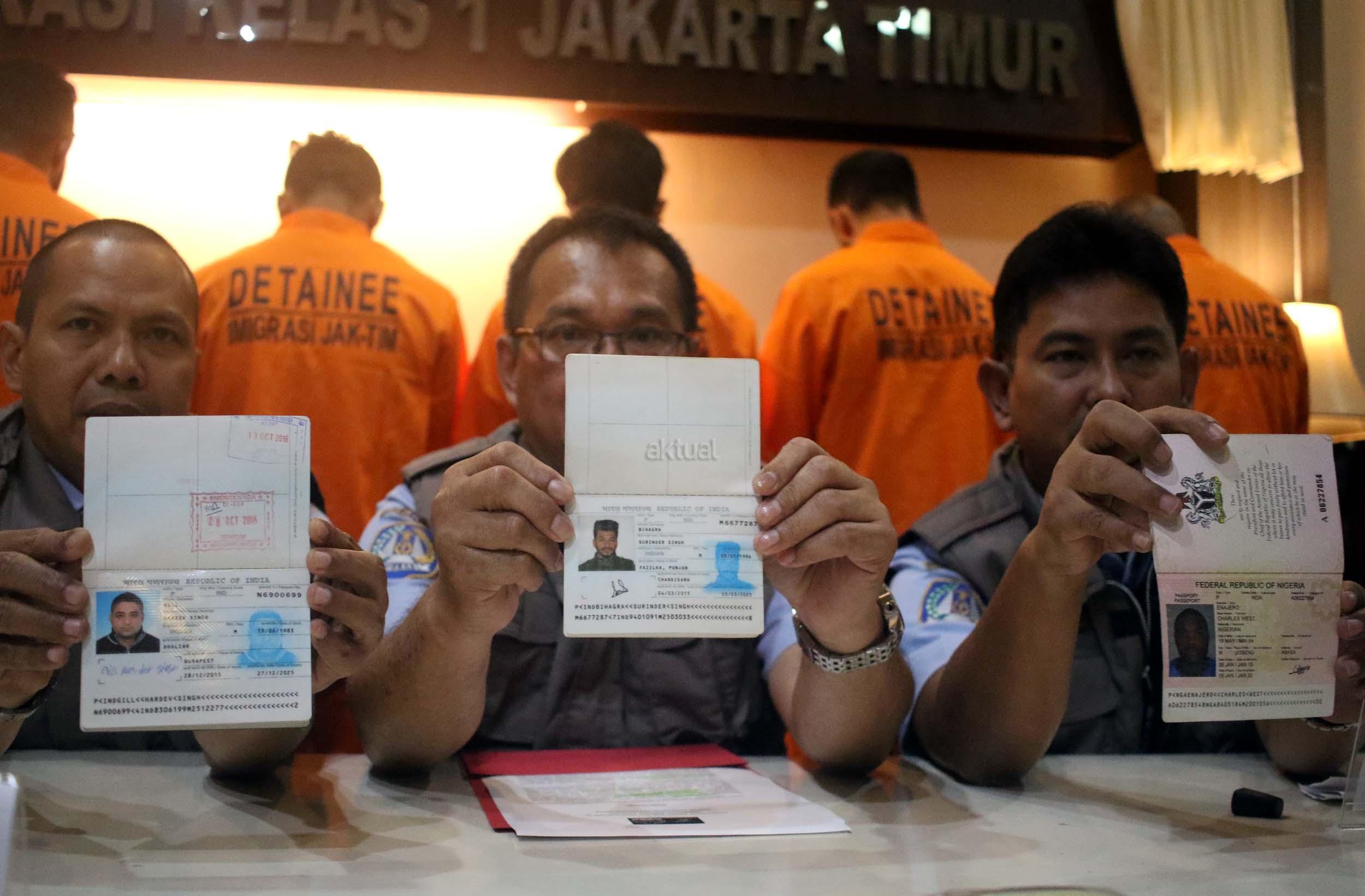 Kasi Infomasi Keimigrasian dan Fasilitas Agus Safani (kiri), Kepala Kantor Imigrasi Kelas I Jakarta Timur Montano F. Rengkung (tengah), Kasi Wasdakim Bambang Tri Cahyono (kanan) menunjukan paspor WNA yang berhasil diamankan saat menggelas jumpa persnya di kantor Imigrasi Kelas I Jakarta Timur, Rabu (18/1/2017). Kantor Imigrasi Kelas I Jakarta Timur mengamankan sebanyak 15 warga negara asing yang tinggal tanpa disertai dokumen yang resmi atau menyalahi ijin. Ke 15 wna tersebut diamankan dalam 2 kali kegiatan di dua apartemen yang berada di wilayah administrasi jakarta timur dan ke 15 warga negara asing tersebut berasal dari berbagai negara.