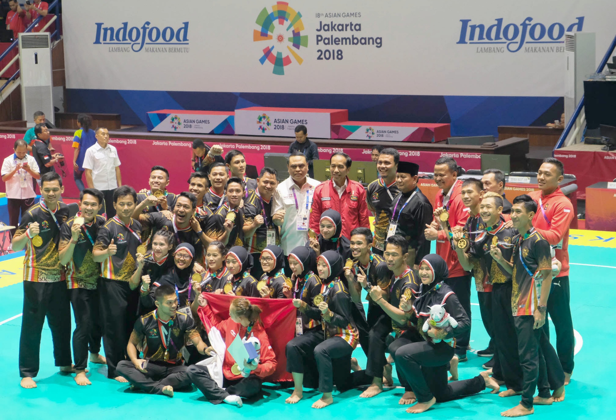 Seluruh atlet Pencak Silat Indonesia dan pengurus foto bersama Presiden Republik Indonesia Joko Widodo, Presiden Persekutuan Pencak Silat Antar Bangsa (Persilat) Prabowo Subianto dan Ketua Kontingen Indonesia di Asian Games 2018, Komjen (Purn) Syafruddin usai upacara penyerahan medali Pencak Silat Asian Games di Padepokan Pencak Silat, Taman Mini Indonesia Indah, Jakarta, Rabu (29/8). Indofood dengan bangga memberikan dukungannya terhadap kesuksesan pelaksanaan pertandingan cabang olahraga pencak silat karena sejalan dengan perjalanan Indofood yang berasal dari Indonesia, sarat dengan nilai – nilai luhur bangsa dan sudah menjadi bagian dari masyarakat Indonesia sejak puluhan tahun lalu. INDOFOOD/POOL