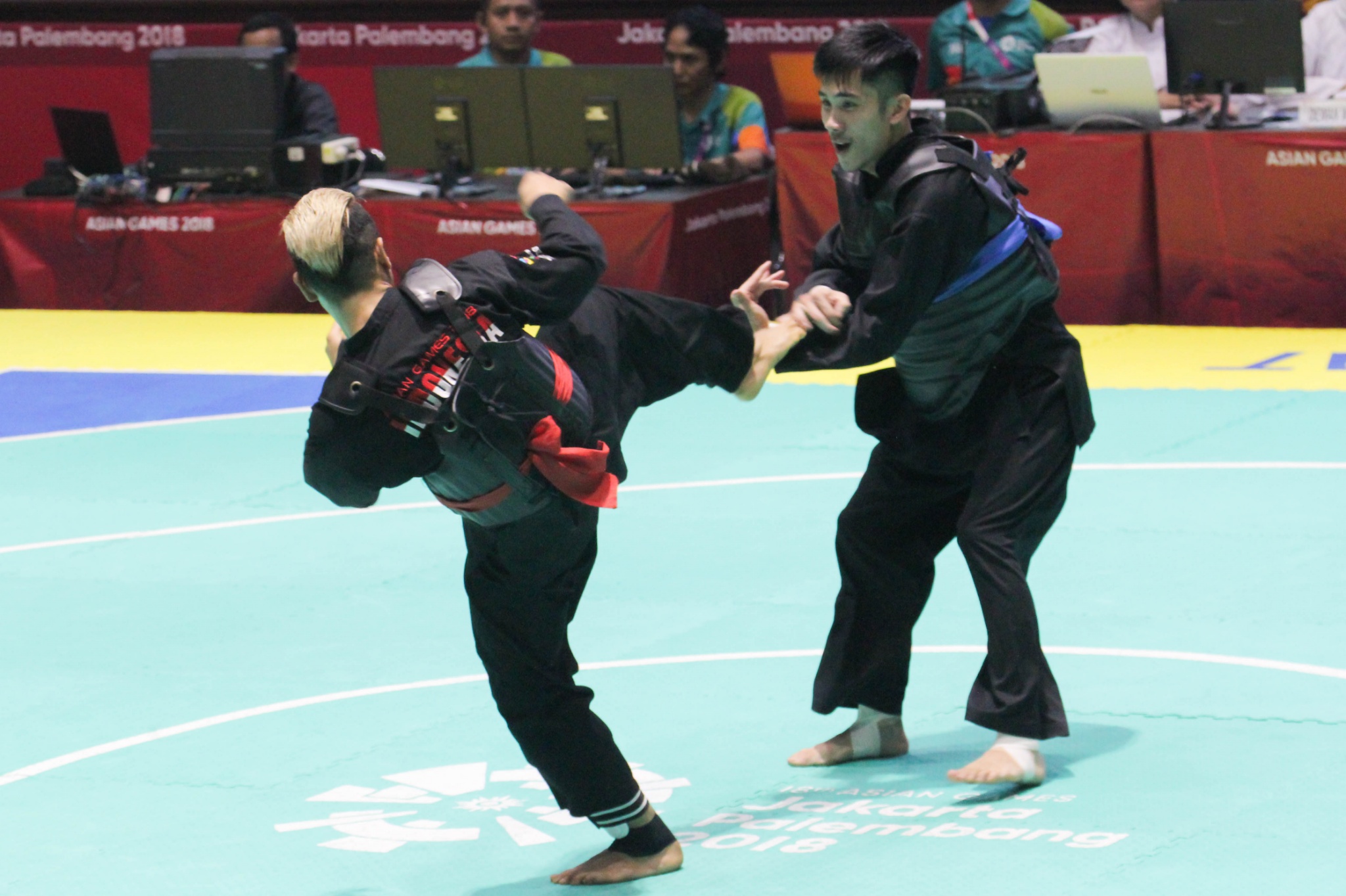 Atlet Pencak Silat Putra Indonesia, Hanif Yudani Kusumah tengah berlaga di nomor tarung kelas 55-60 kilogram melawan pesilat Vietman, Thai Linh Nguyen di Padepokan Pencak Silat, Taman Mini Indonesia Indah, Jakarta, Rabu (29/8). Dalam babak final ini Hanif dinyatakan menang 3 – 2 atas Thai Linh. INDOFOOD/POOL