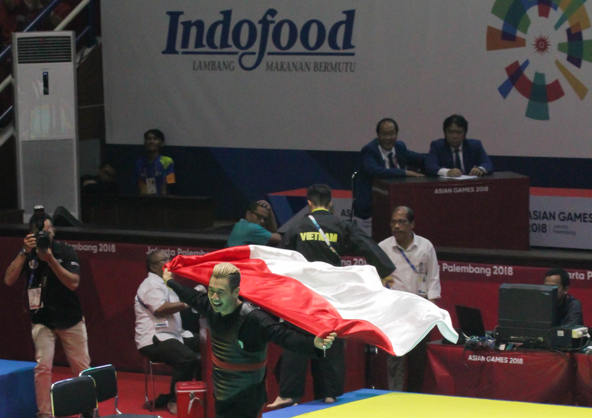 Atlet Pencak Silat Putra Indonesia, Hanif Yudani Kusumah meluapkan rasa bangga usai wasit menetapkan kemenangannya melawan pesilat Vietman, Thai Linh Nguyen pada babak final kelas C (55-60 kilogram) di Padepokan Pencak Silat, Taman Mini Indonesia Indah, Jakarta, Rabu (29/8). INDOFOOD/POOL