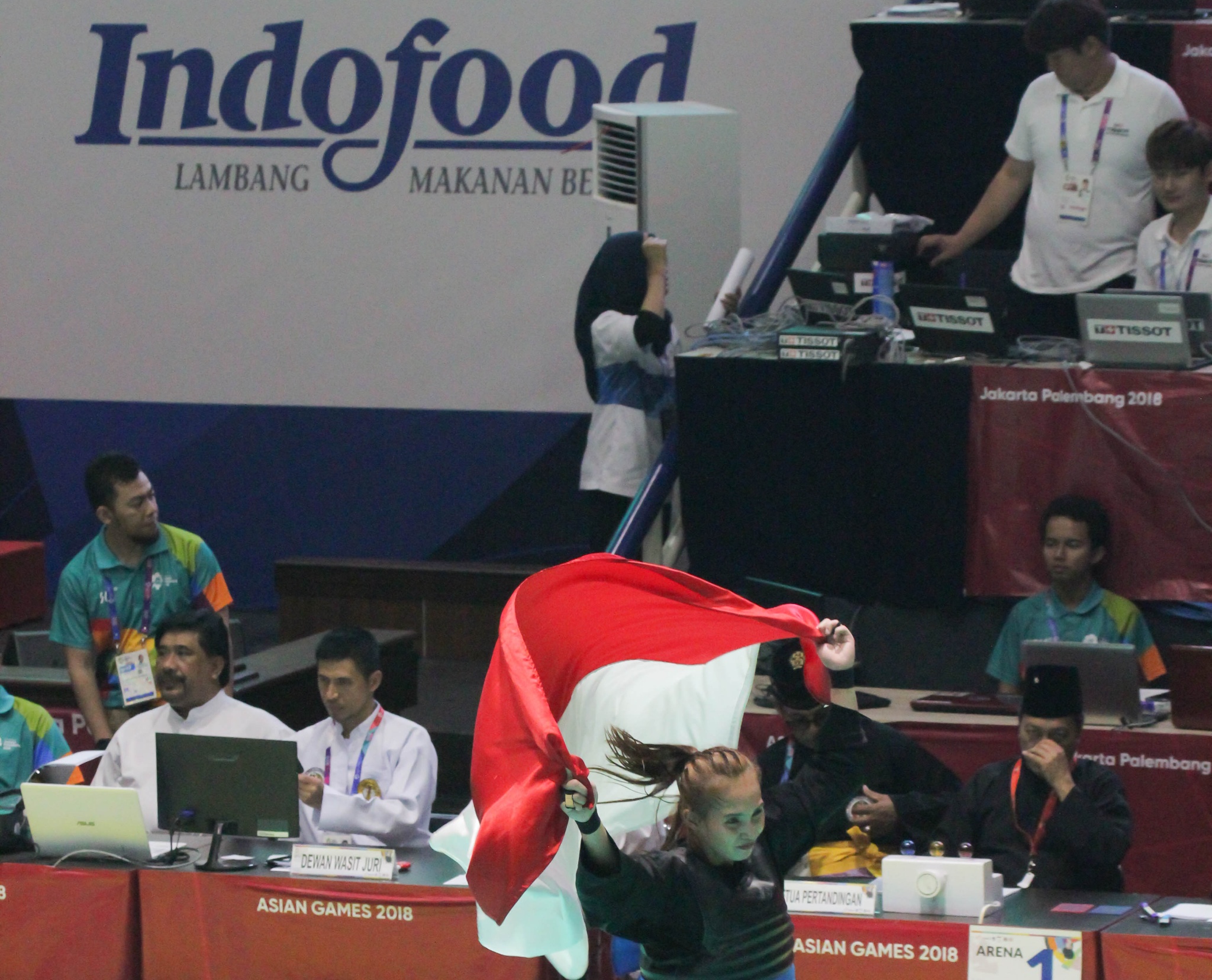 Atlet Pencak Silat Indonesia, Wewey Wita meluapkan rasa bangga setelah wasit menetapkan kemenangannya melawan pesilat Vietman, Tran Thi Thiem pada babak final kelas 50-55 kilogram di Padepokan Pencak Silat, Taman Mini Indonesia Indah, Jakarta, Rabu (29/8). INDOFOOD/POOL