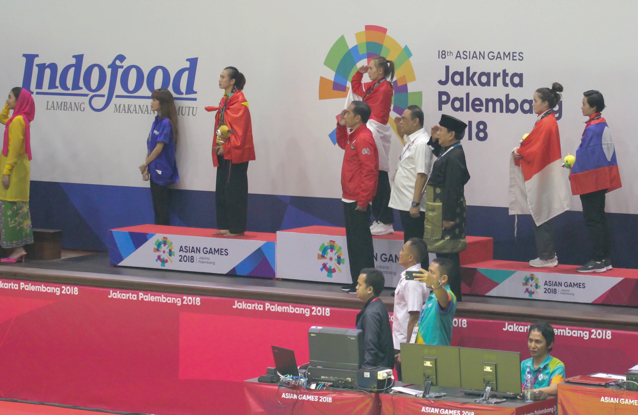 Presiden Joko Widodo bersama Ketua Umum Pengurus Besar Ikatan Pencak Silat Seluruh Indonesia (PB IPSI) Prabowo Subianto dan CdM Asian Games 2018 Syafruddin serta pesilat putri Indonesia Wewey Wita menghormat bendera pada upacara penyerahan medali pencak silat Asian Games 2018 di Padepokan Pencak Silat Taman Mini Indonesia Indah (TMII), Jakarta, Rabu (29/8). INDOFOOD/POOL