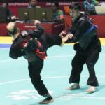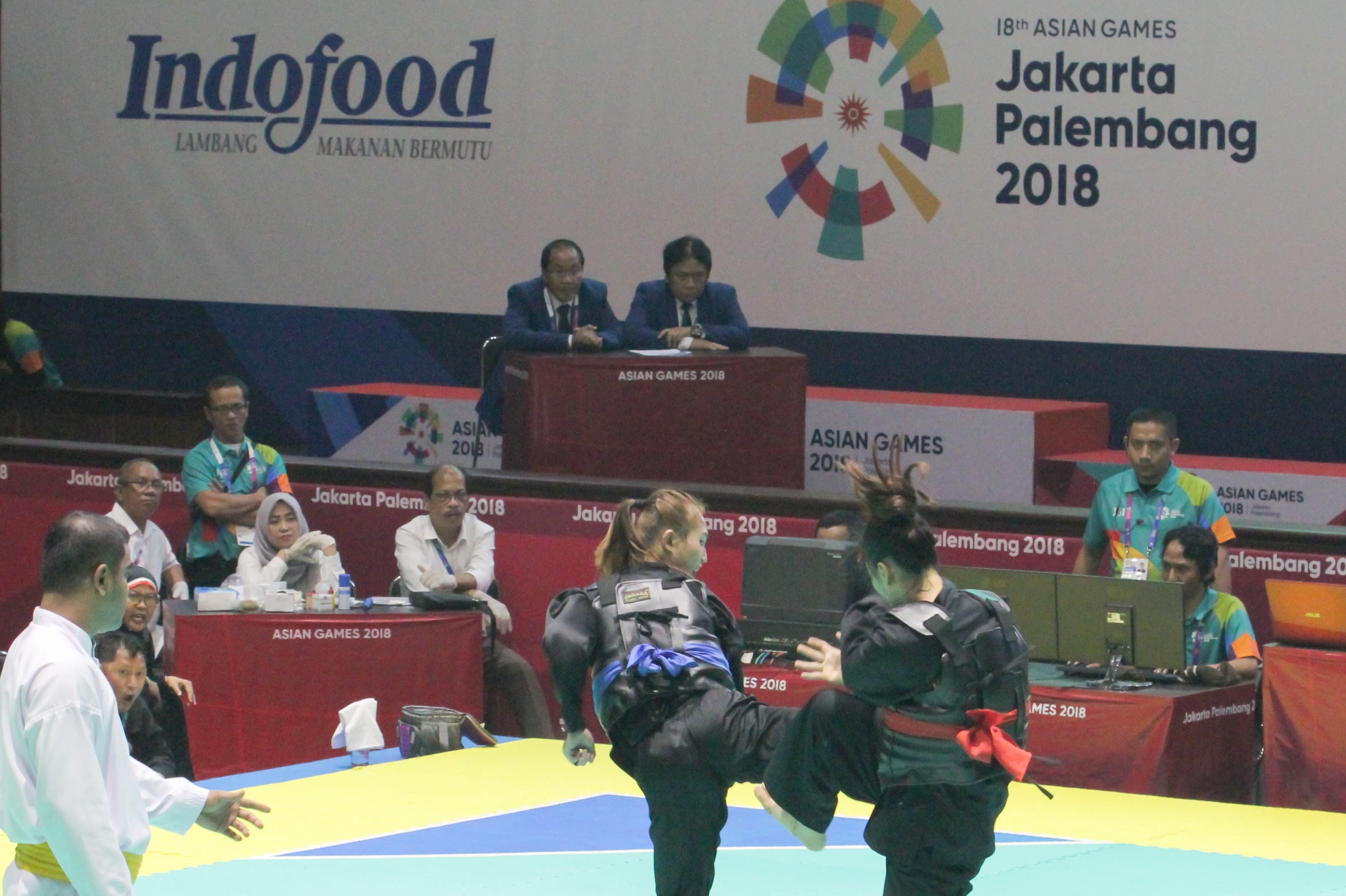 Atlet Pencak Silat Indonesia, Wewey Wita tengah berlaga di kelas 50 – 55 kilogram melawan pesilat Vietman, Tran Thi Thiem di Padepokan Pencak Silat, Taman Mini Indonesia Indah, Jakarta, Rabu (29/8). INDOFOOD/POOL